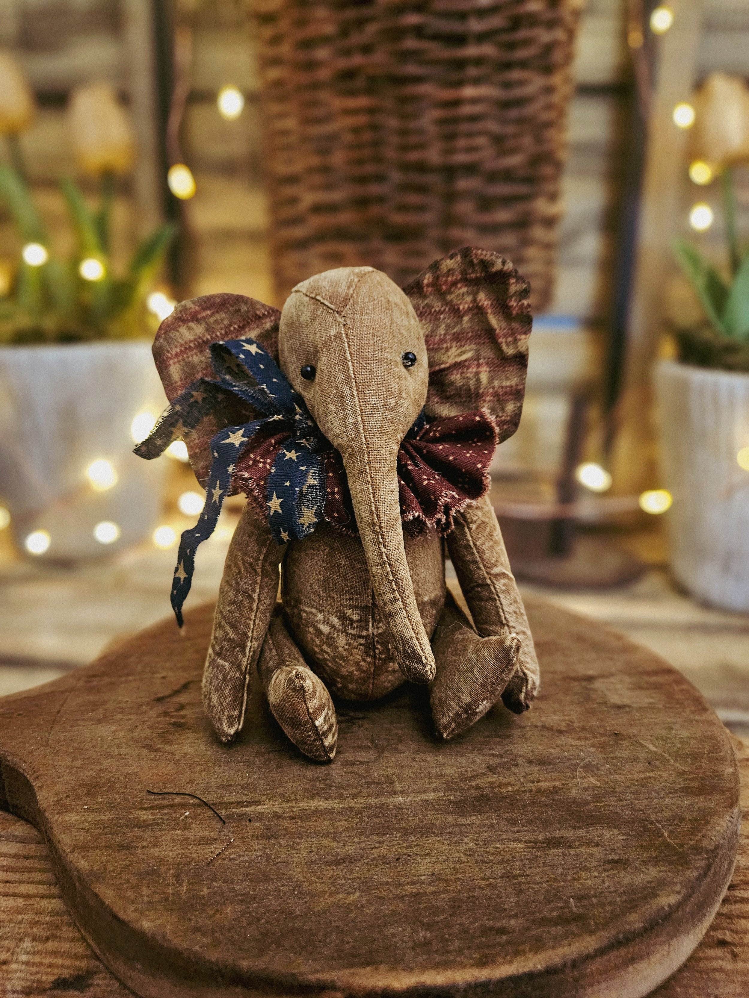 This small Americana elephant measures about 6” tall. Made from an aged material with glass bead eyes and an Americana ruffle around his neck. He is weighted.