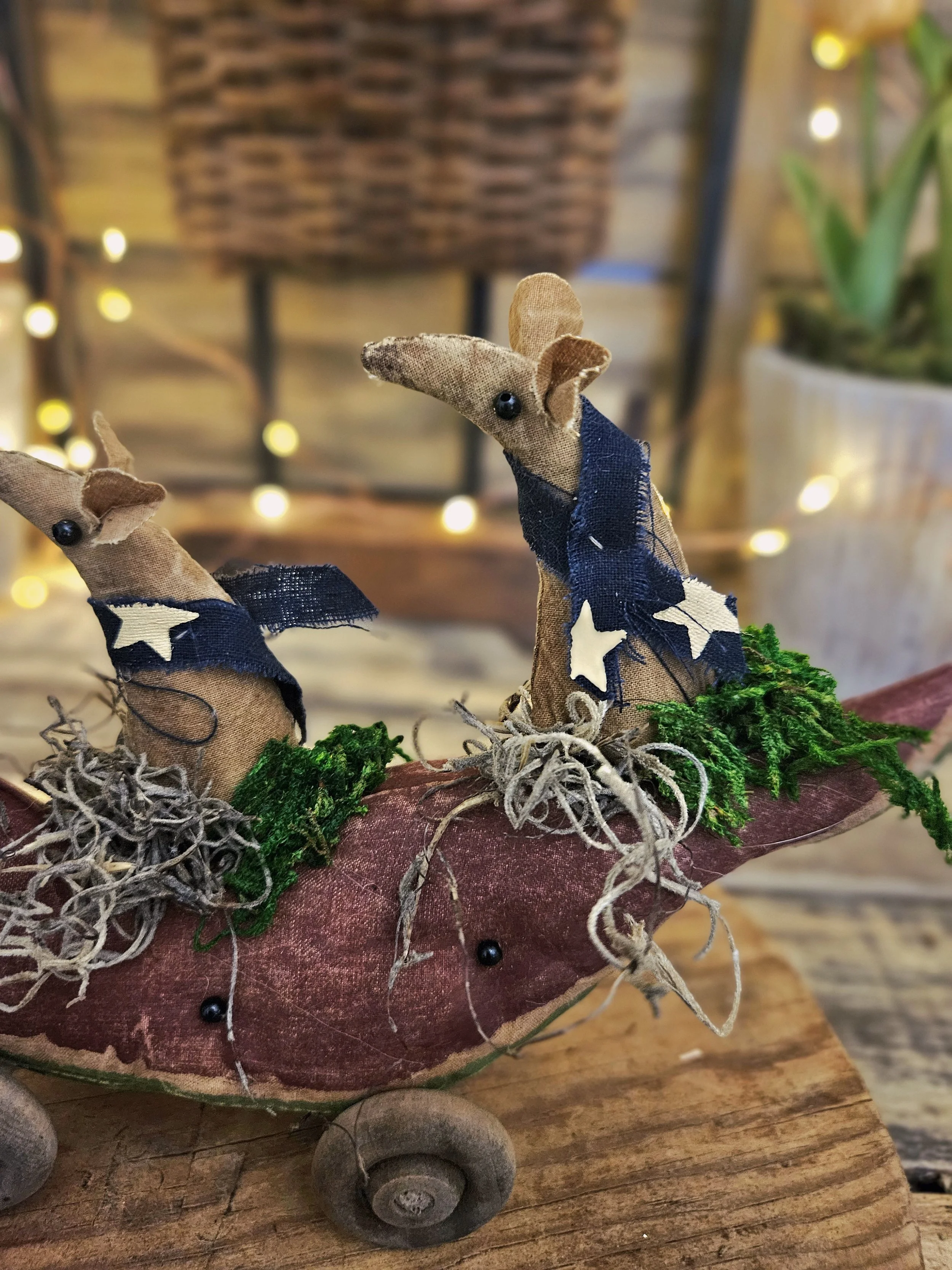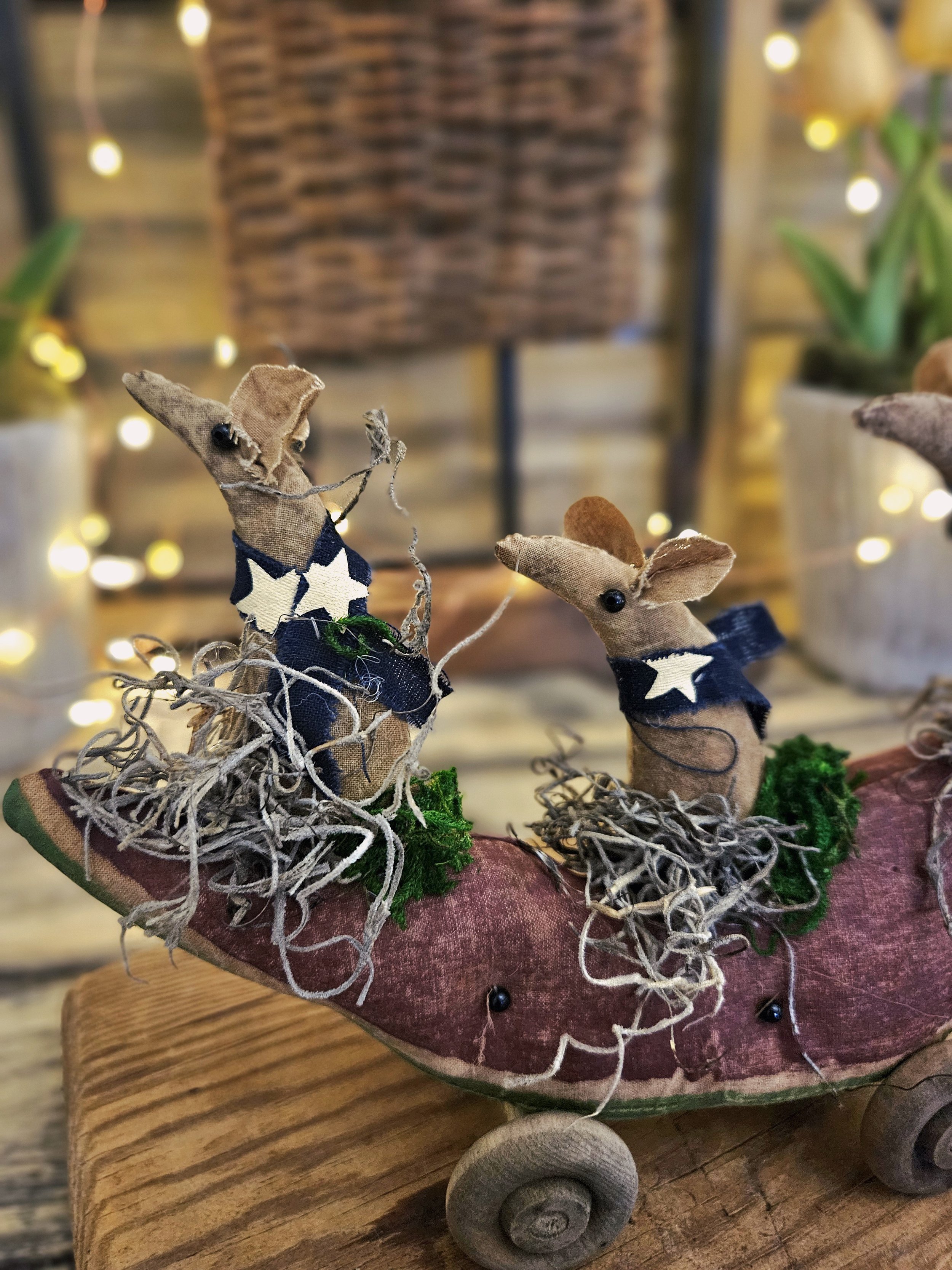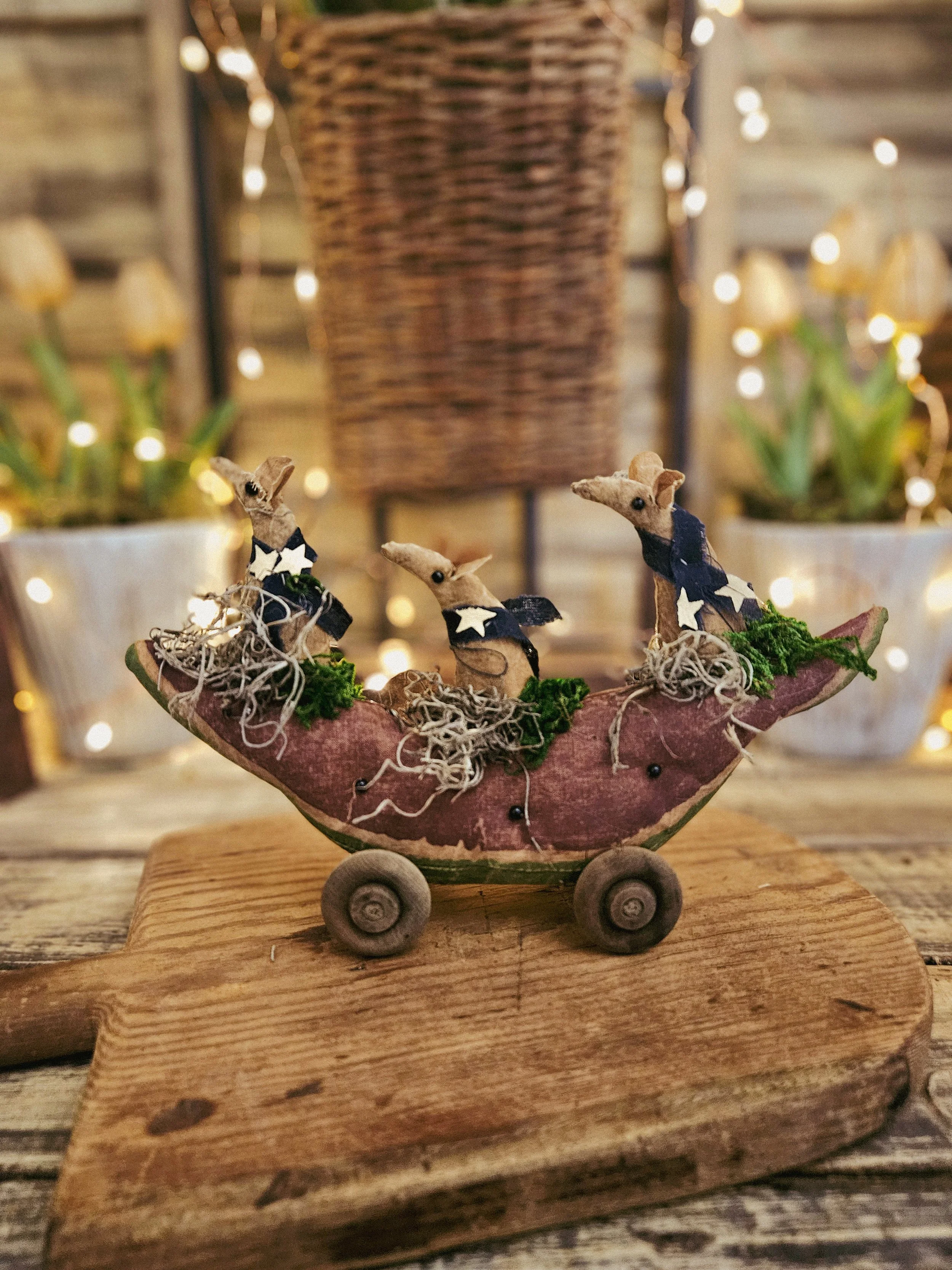 Three little field mice sit on top of a watermelon. The watermelon is made from an aged and painted grain sack material with glass bead seeds. Wooden wheels are attached to create a cute pull toy.