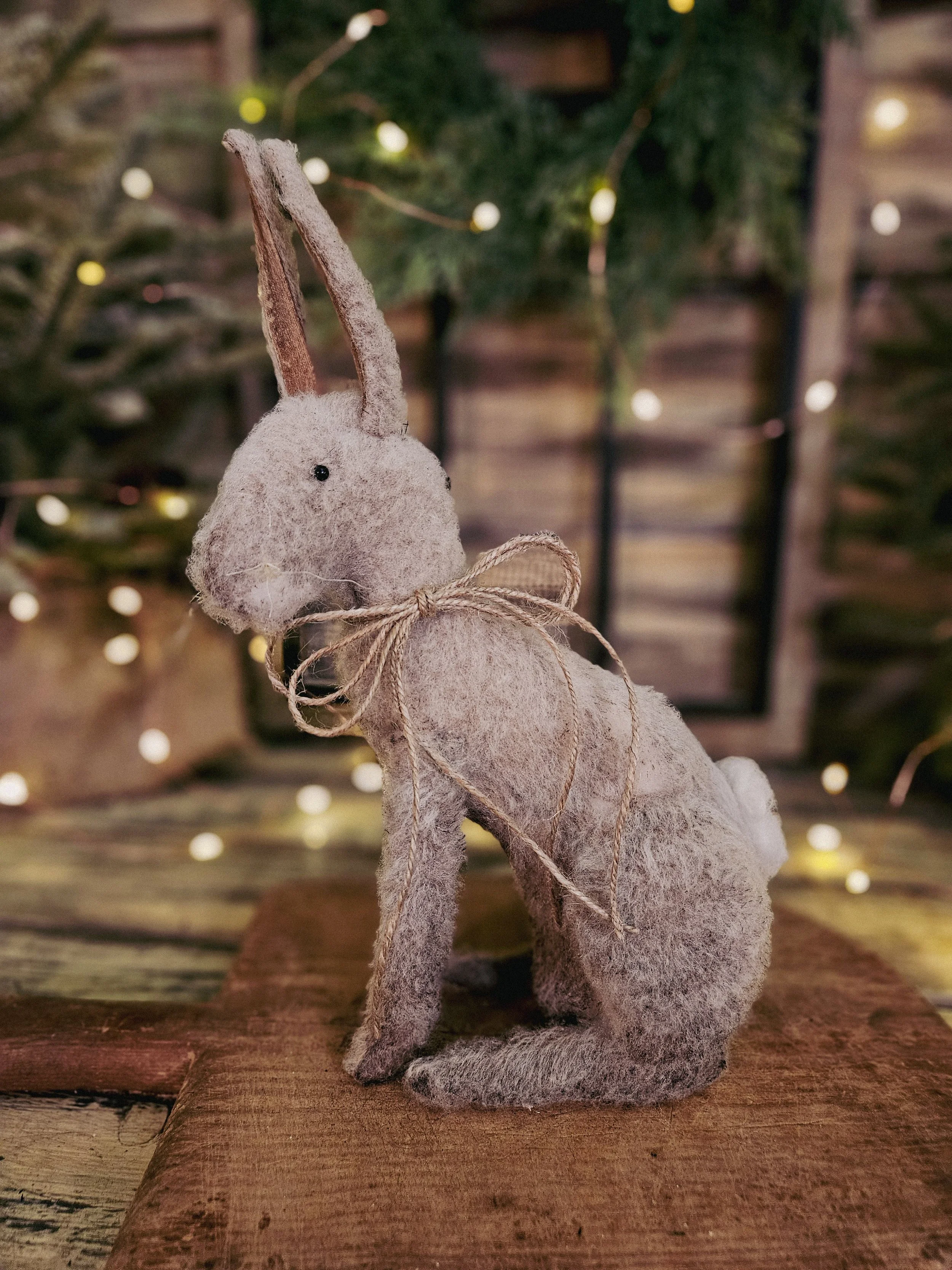 This Primitive Bunny is form aged tattered plush felt fabric He measures 10 1/2" tall to the tips of his ears. He is rag stuffed and a weighted.