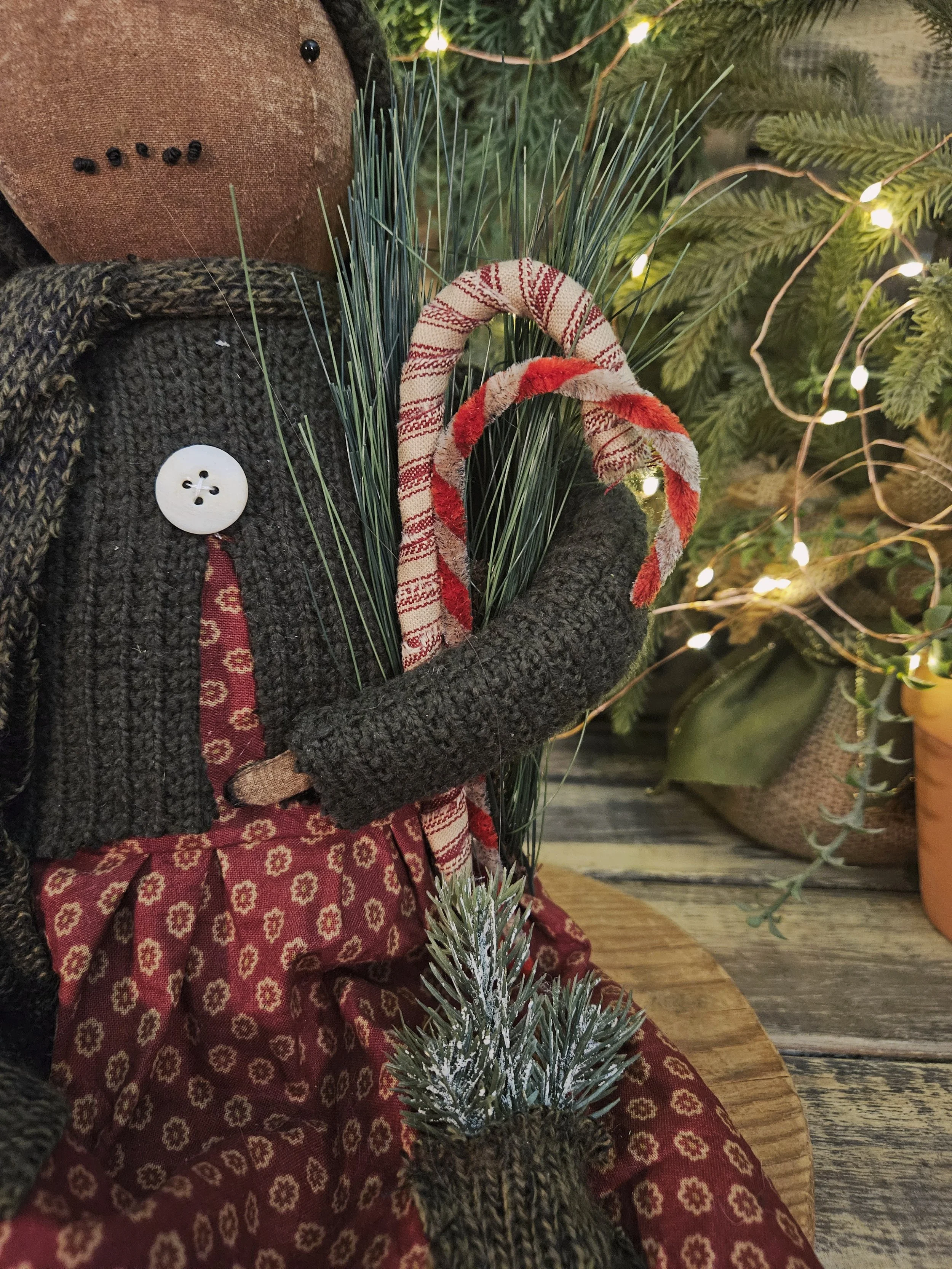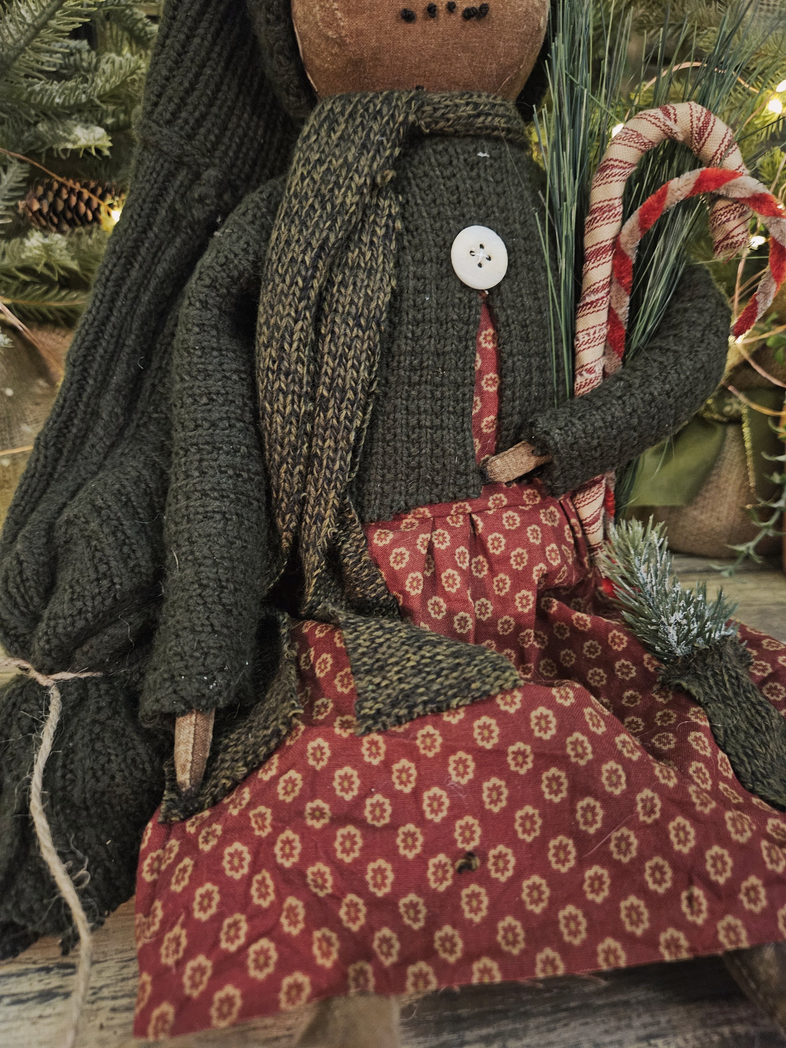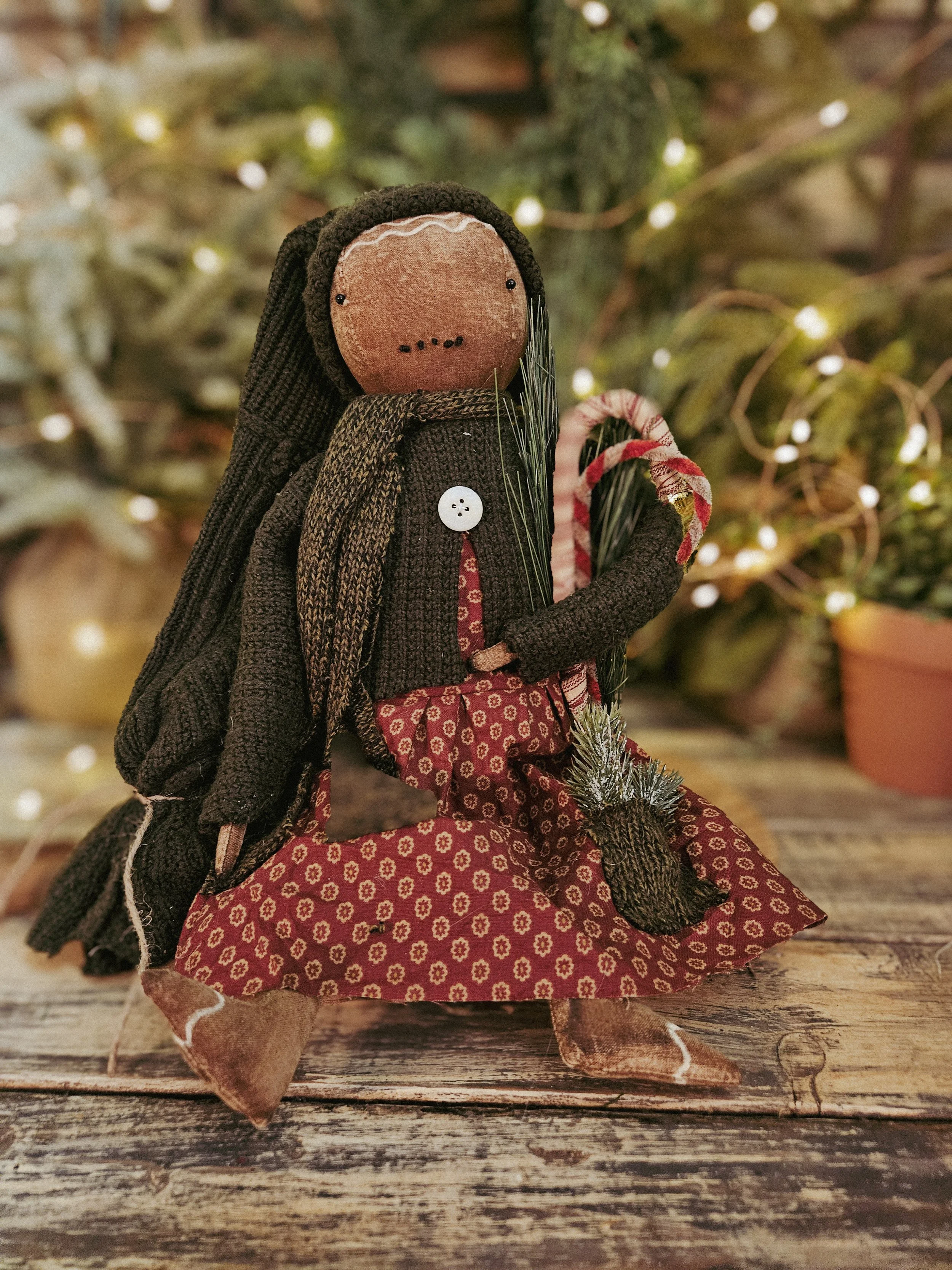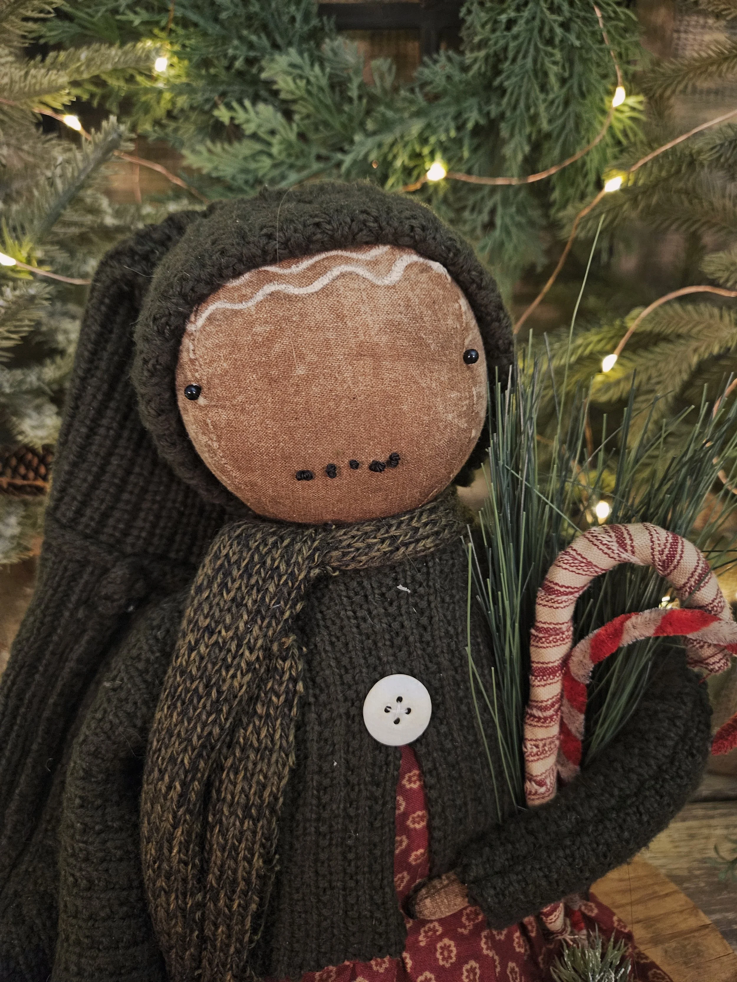 This sweet gingerbread girl measures about 17” tall, can hang or sit. She wears a dress along with a sweater and hat. Her little dress pocket holds some faux greens