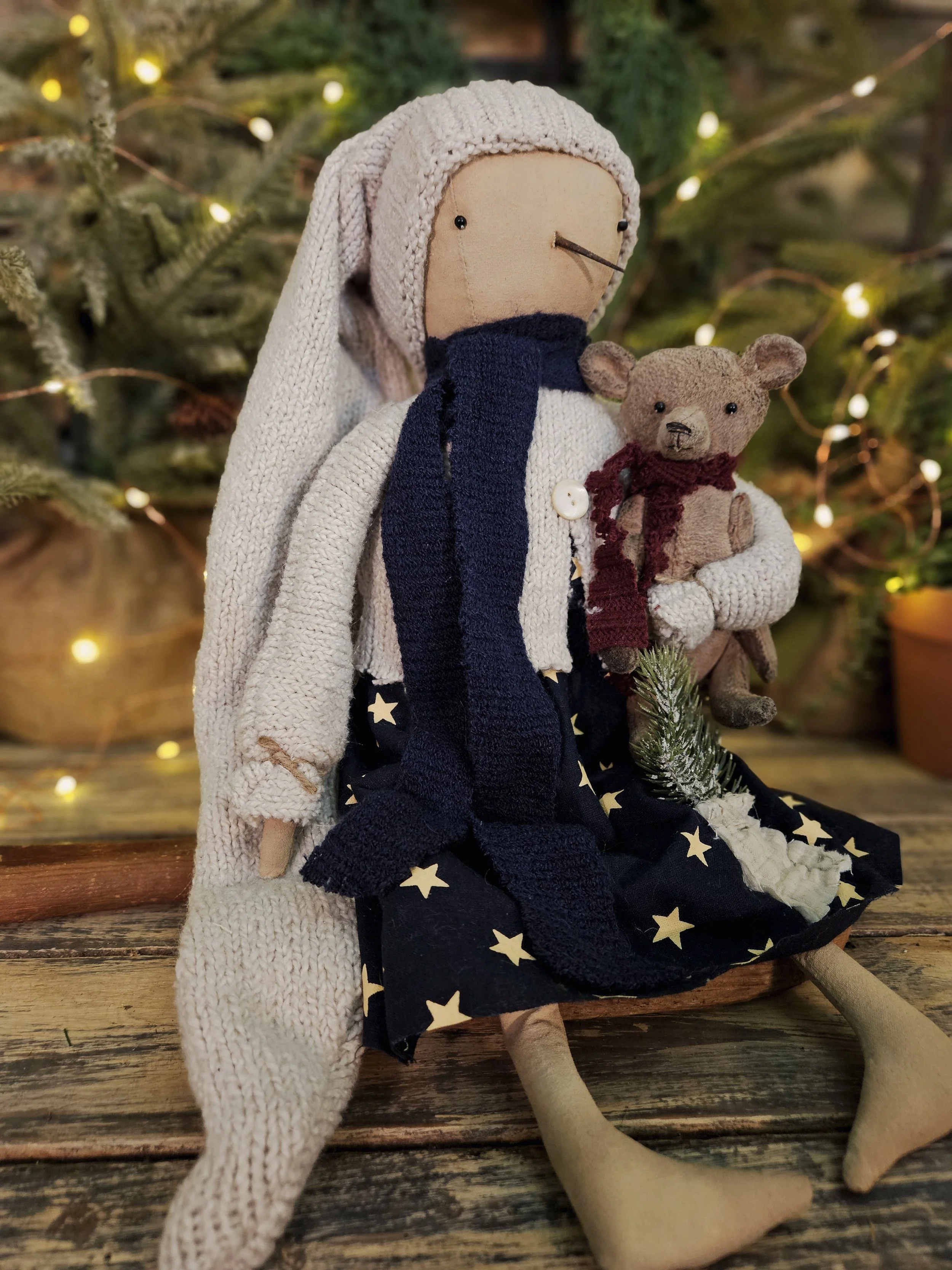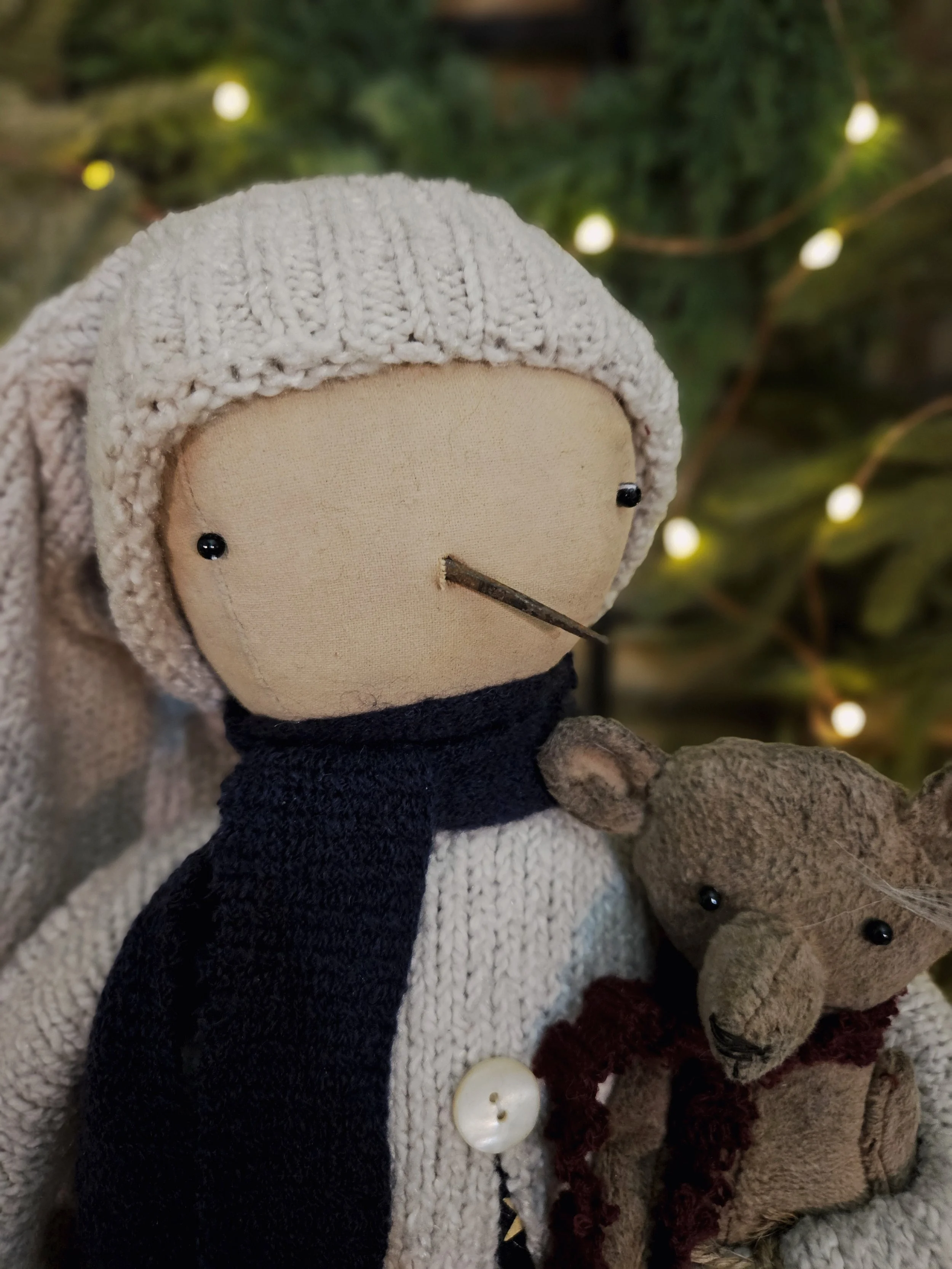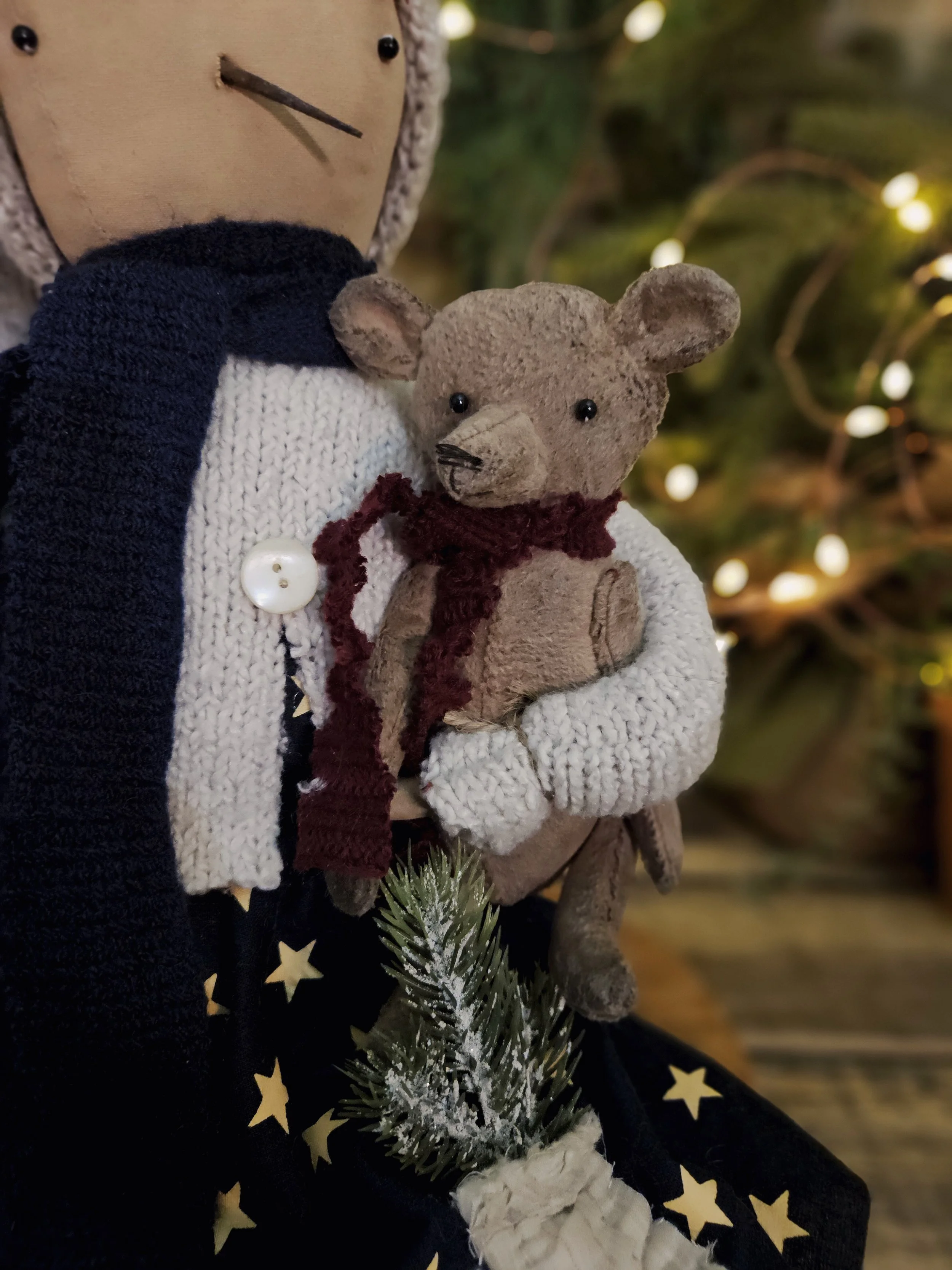 This sweet snowgirl measures about 17” tall, can hang or sit. She wears a dress along with a sweater and hat. She has a rusty nail nose. Her little dress pocket holds some faux greens