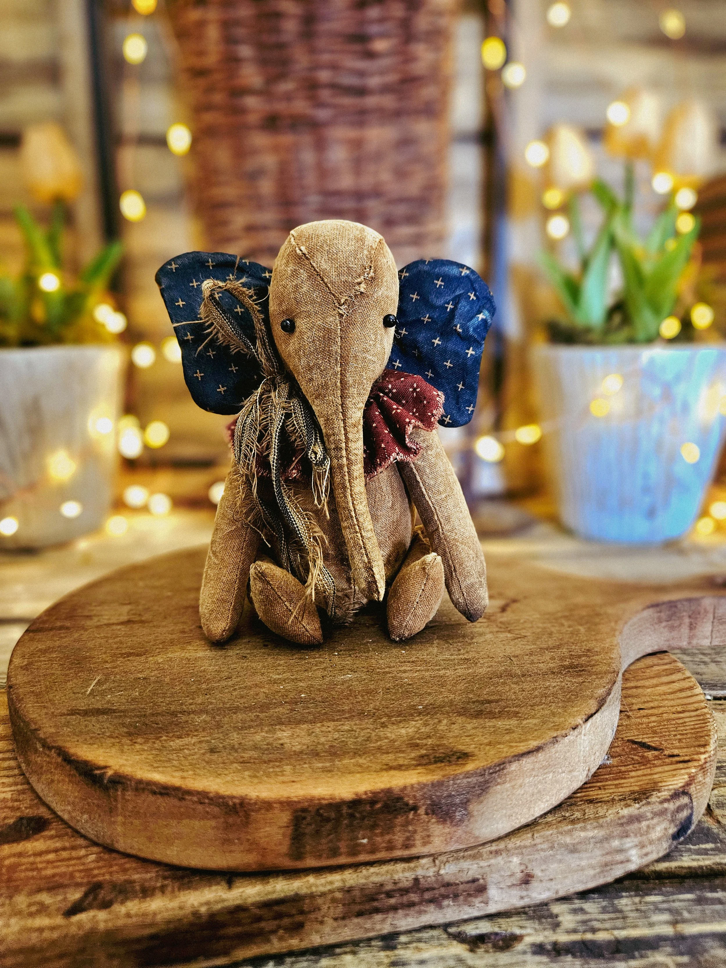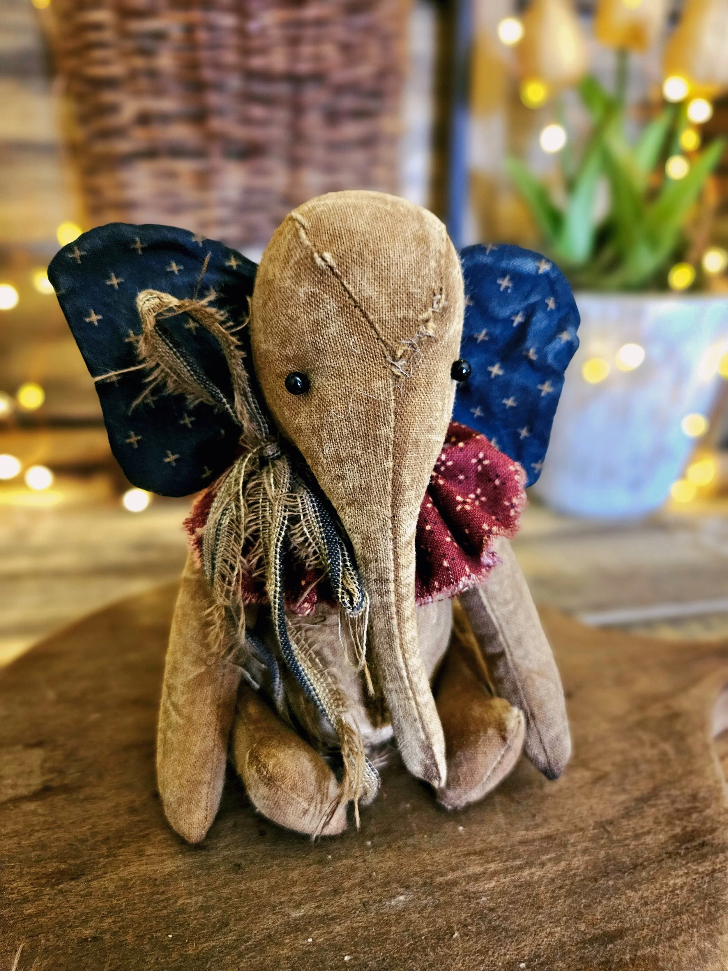 This small Americana elephant measures about 6” tall. Made from an aged material with glass bead eyes and an Americana ruffle around his neck. He is weighted.