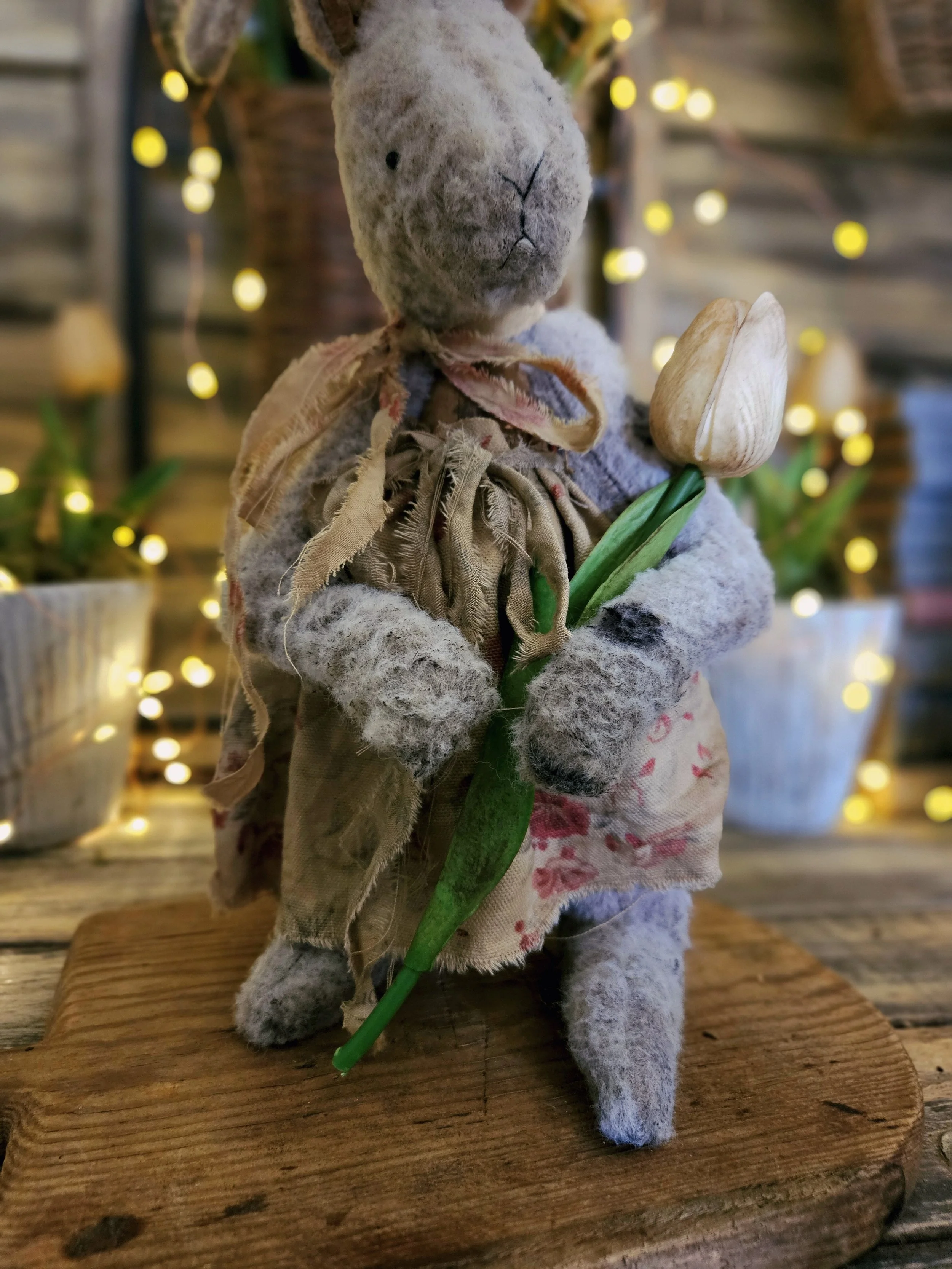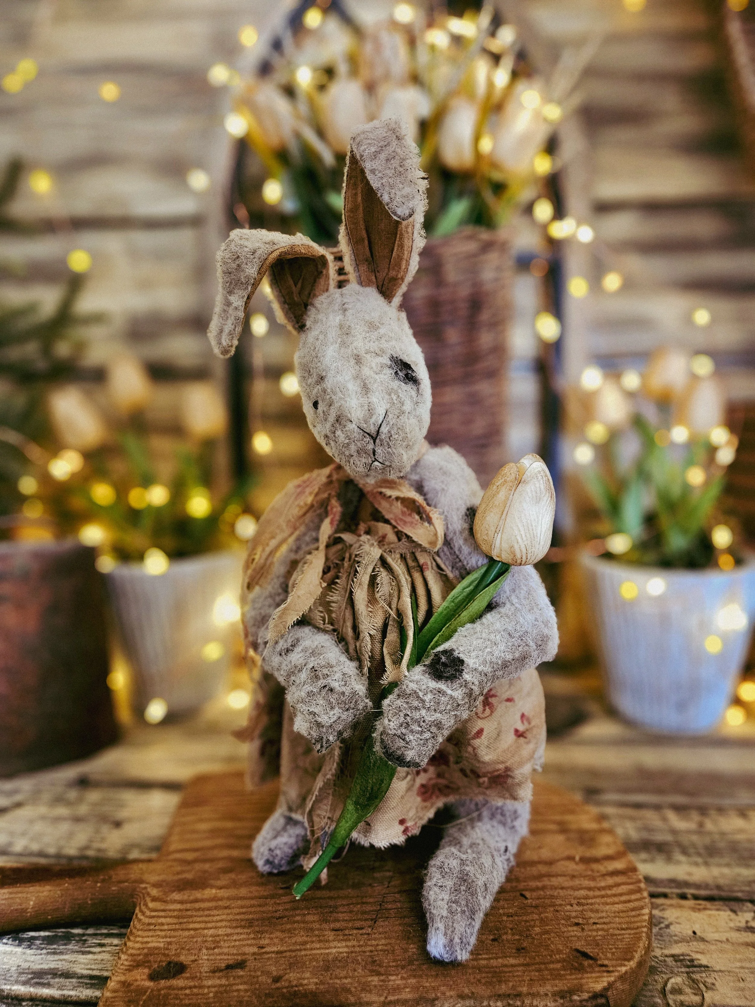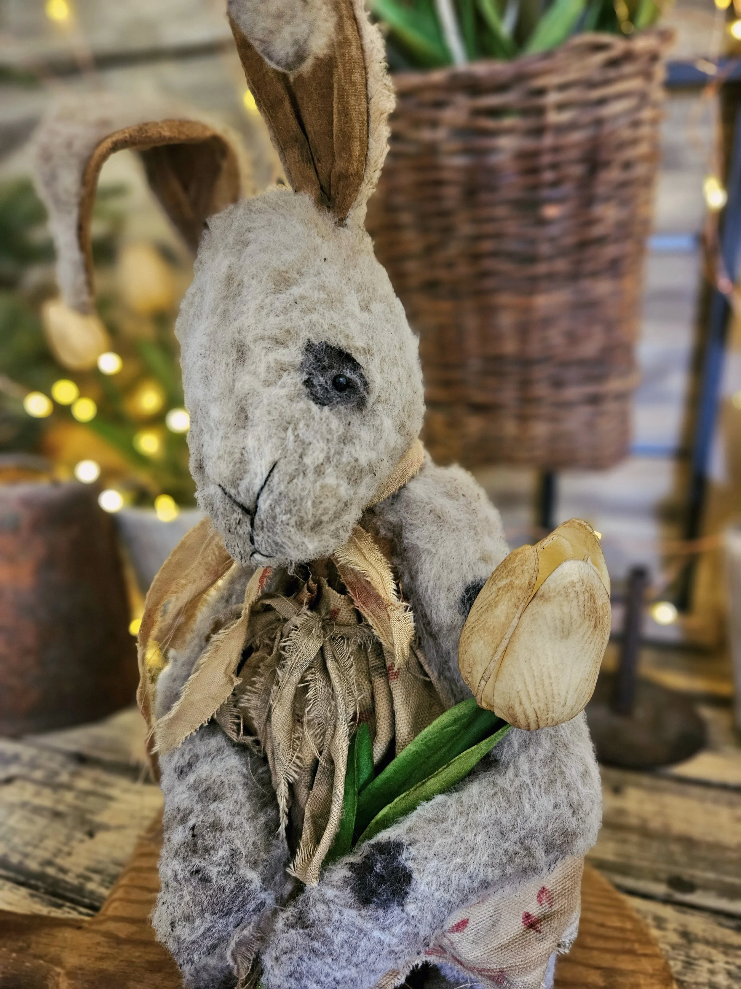 Violet bunny measures 12 inches tall to the top of her head. Made from an aged plush material, she wears a floral dress and holds an aged realistic tulip