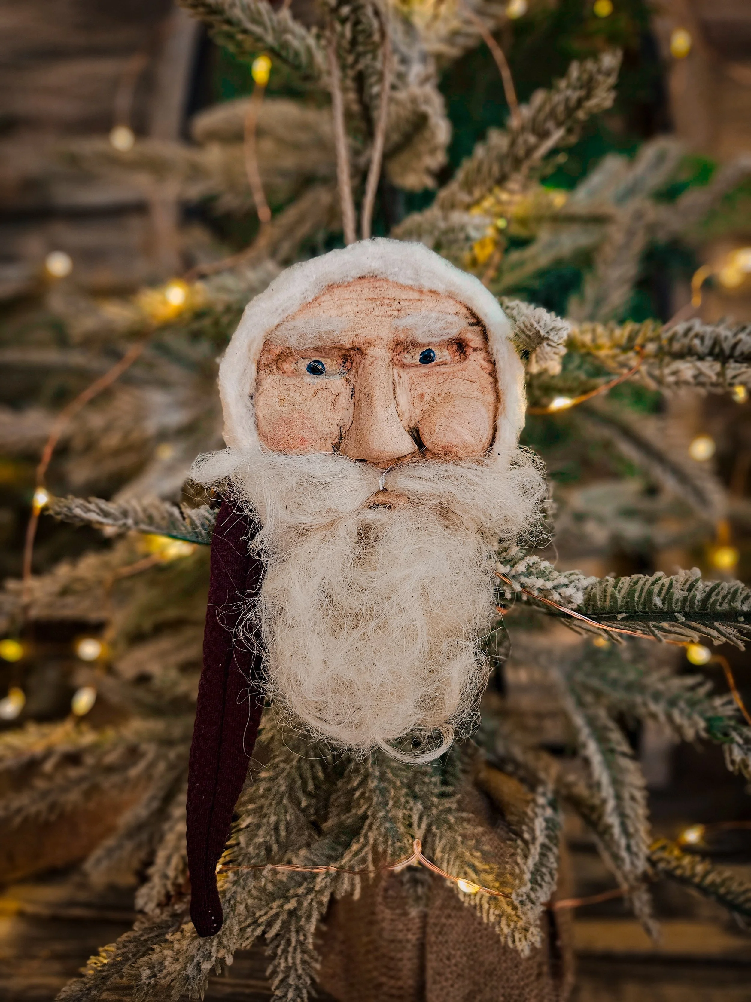 This ornament is hand sculpted and painted. His face measures approx. 3” and the entire ornament from hook to tip of his hat measures approx. 9”