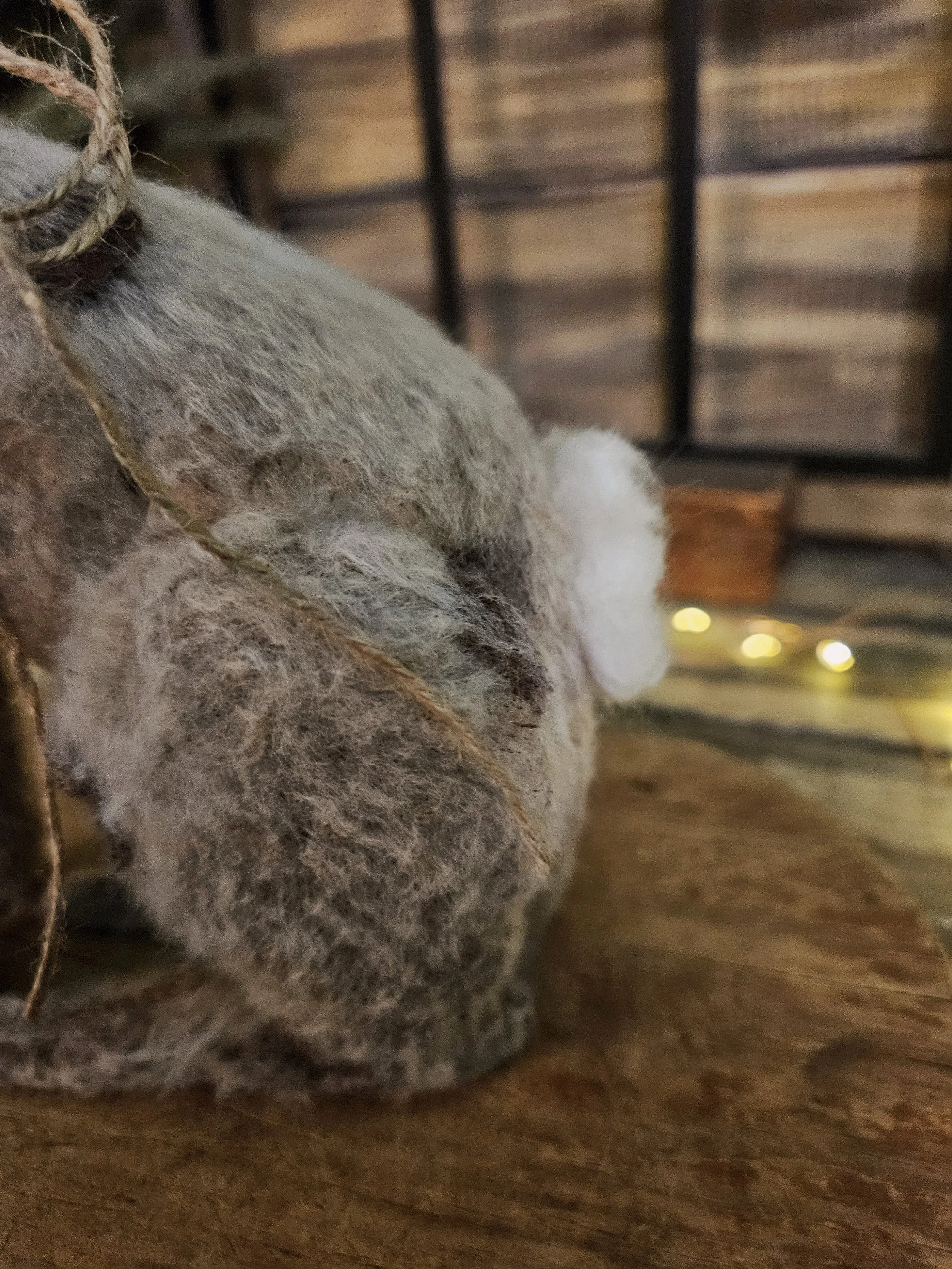 He has real glass bead eyes and sisal whiskers with a real wool tail.