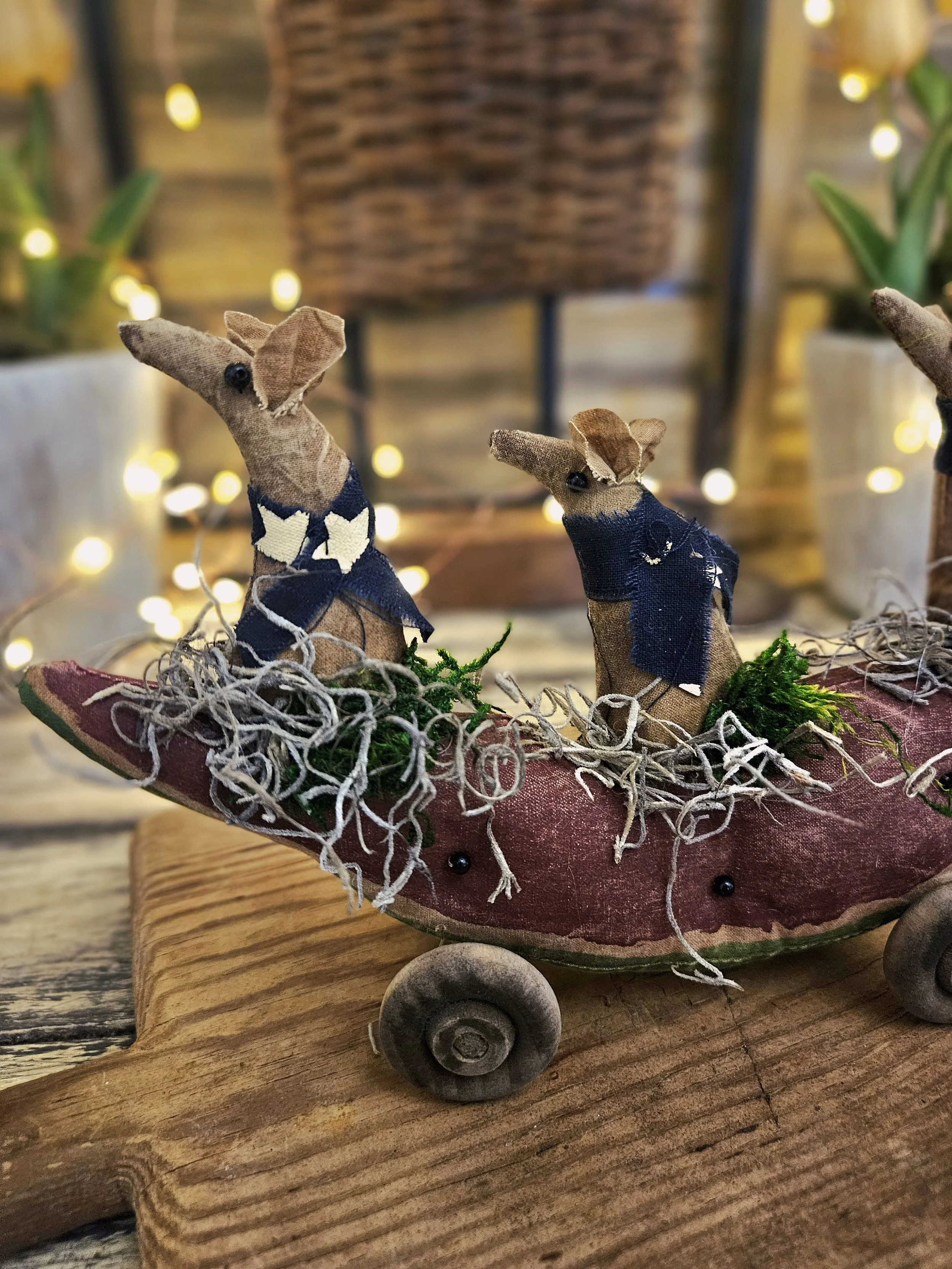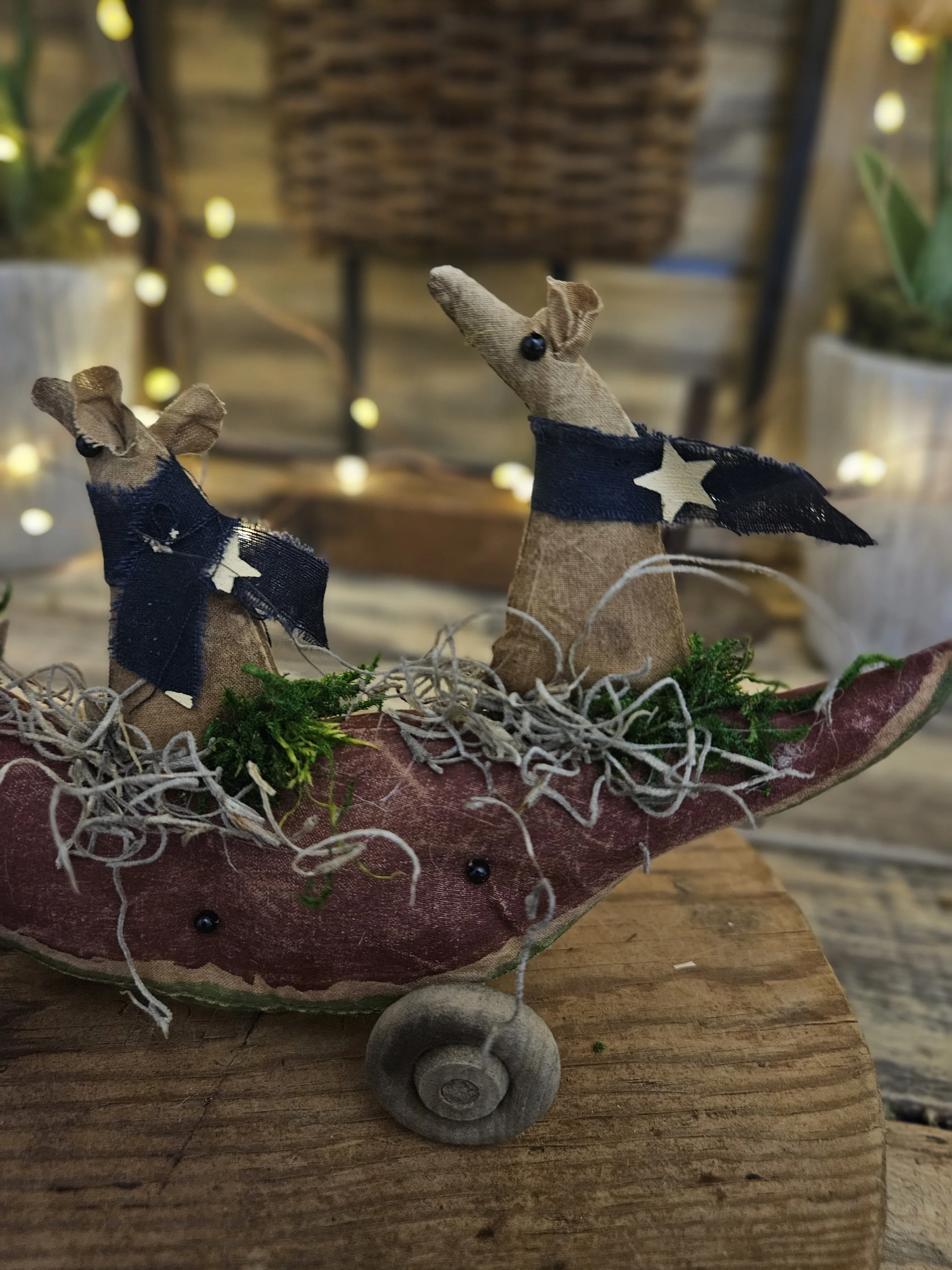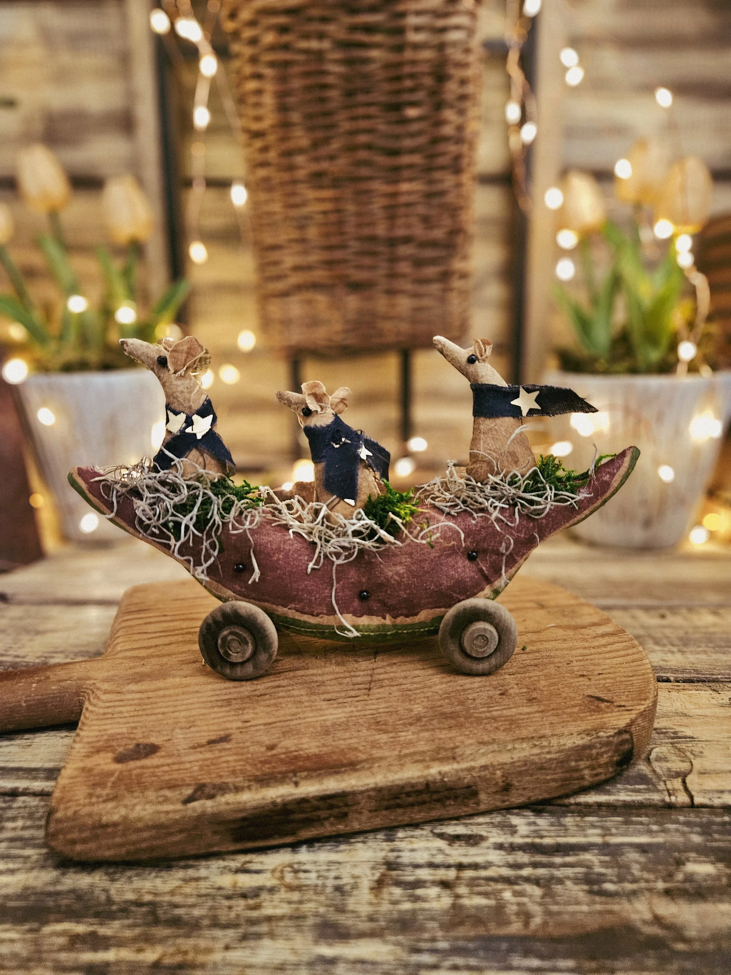 Three little field mice sit on top of a watermelon. The watermelon is made from an aged and painted grain sack material with glass bead seeds. Wooden wheels are attached to create a cute pull toy.