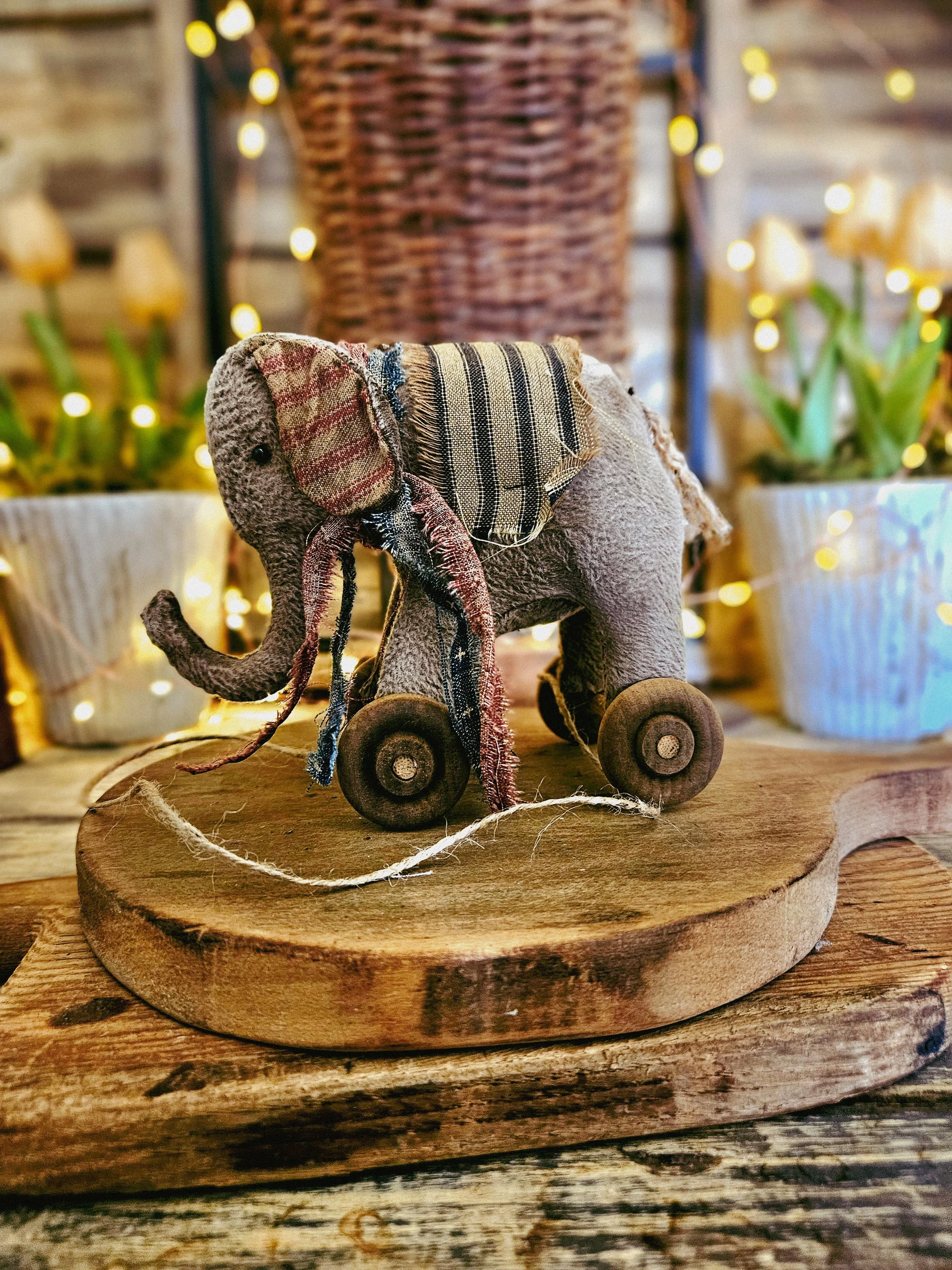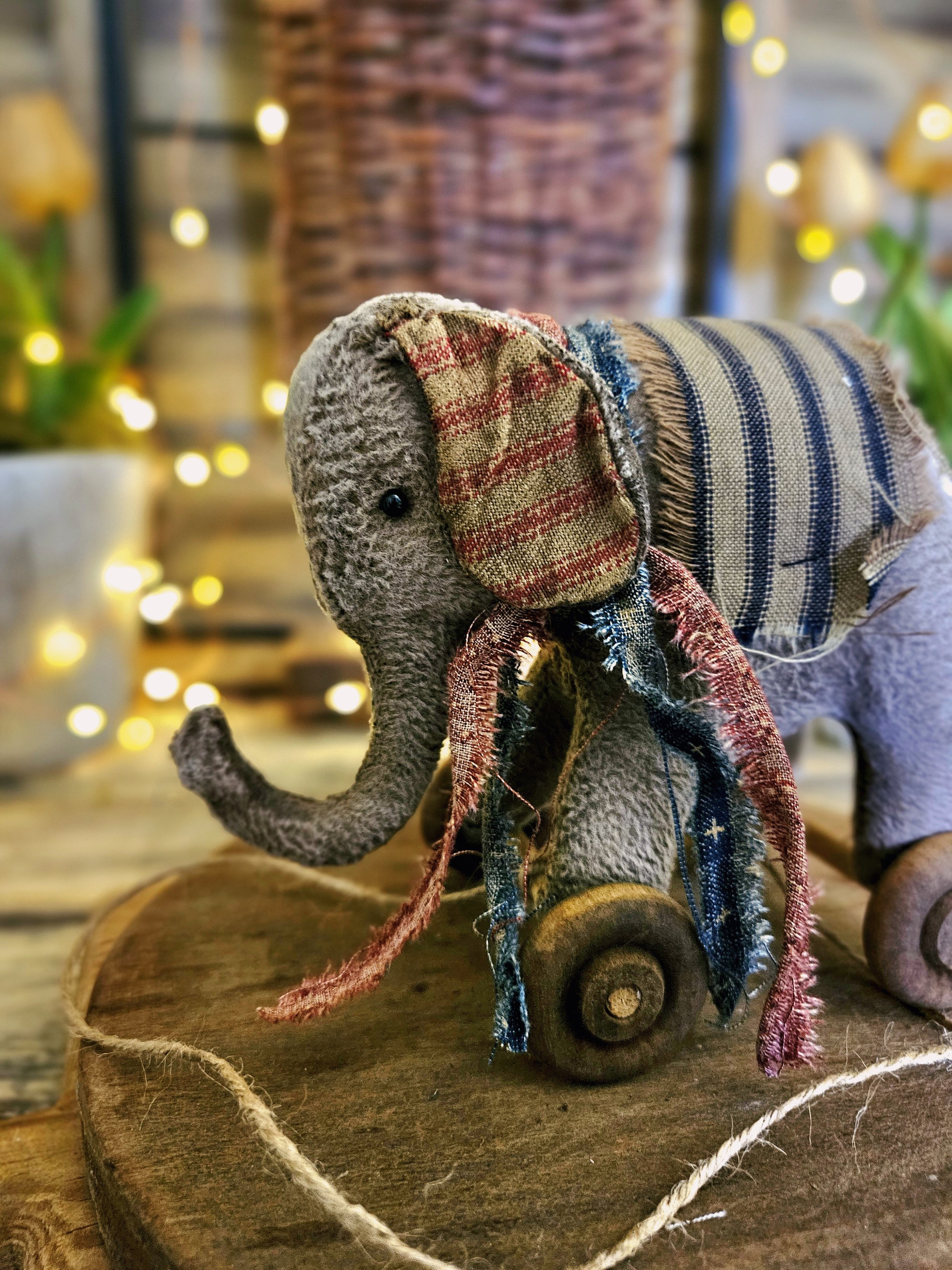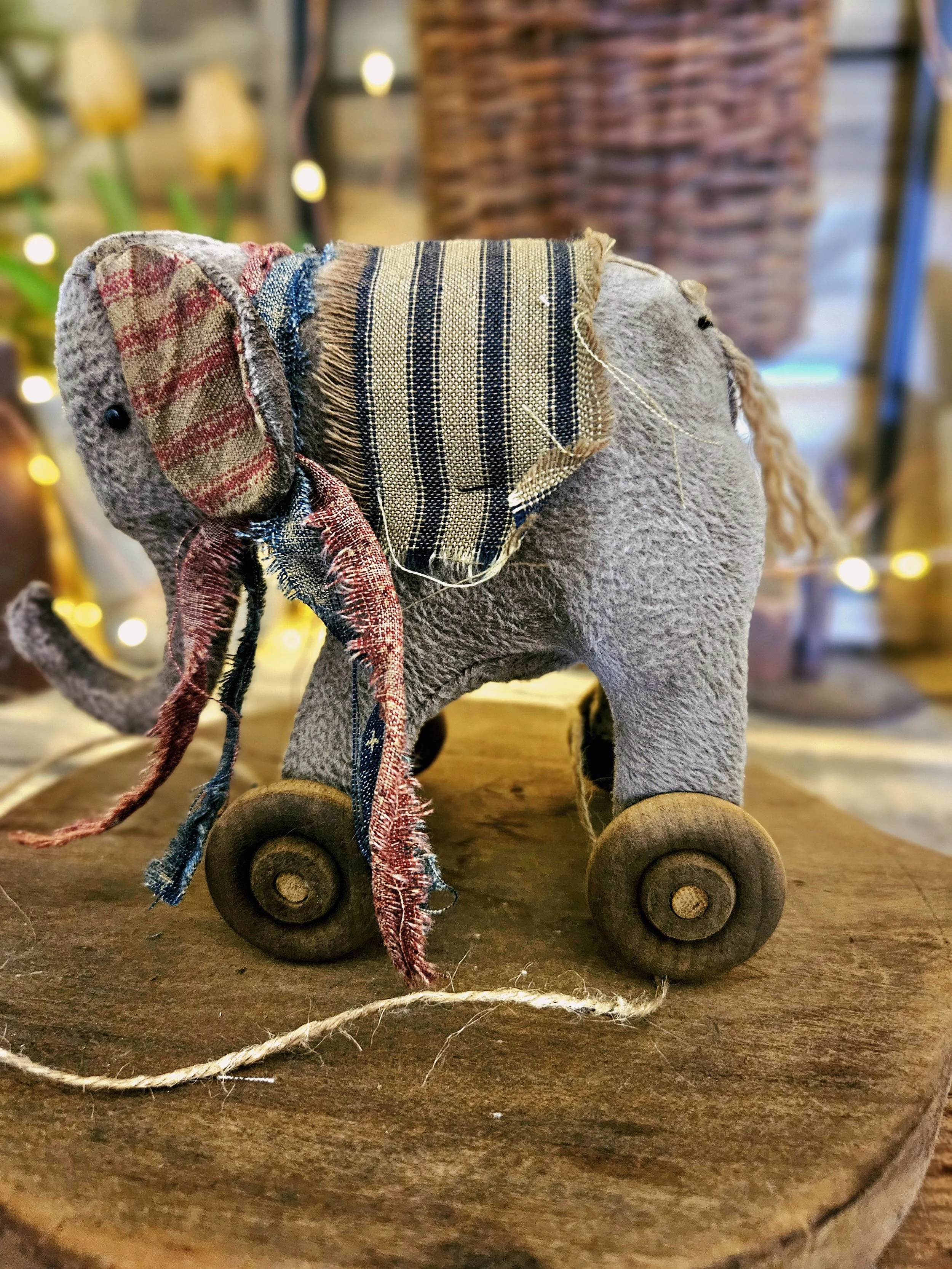 This primitive americana elephant pull toy measures about 6” x 5”. Made from an aged material and rag stuffed. He has small glass bead eyes and an americana bow. His wheels do not move.