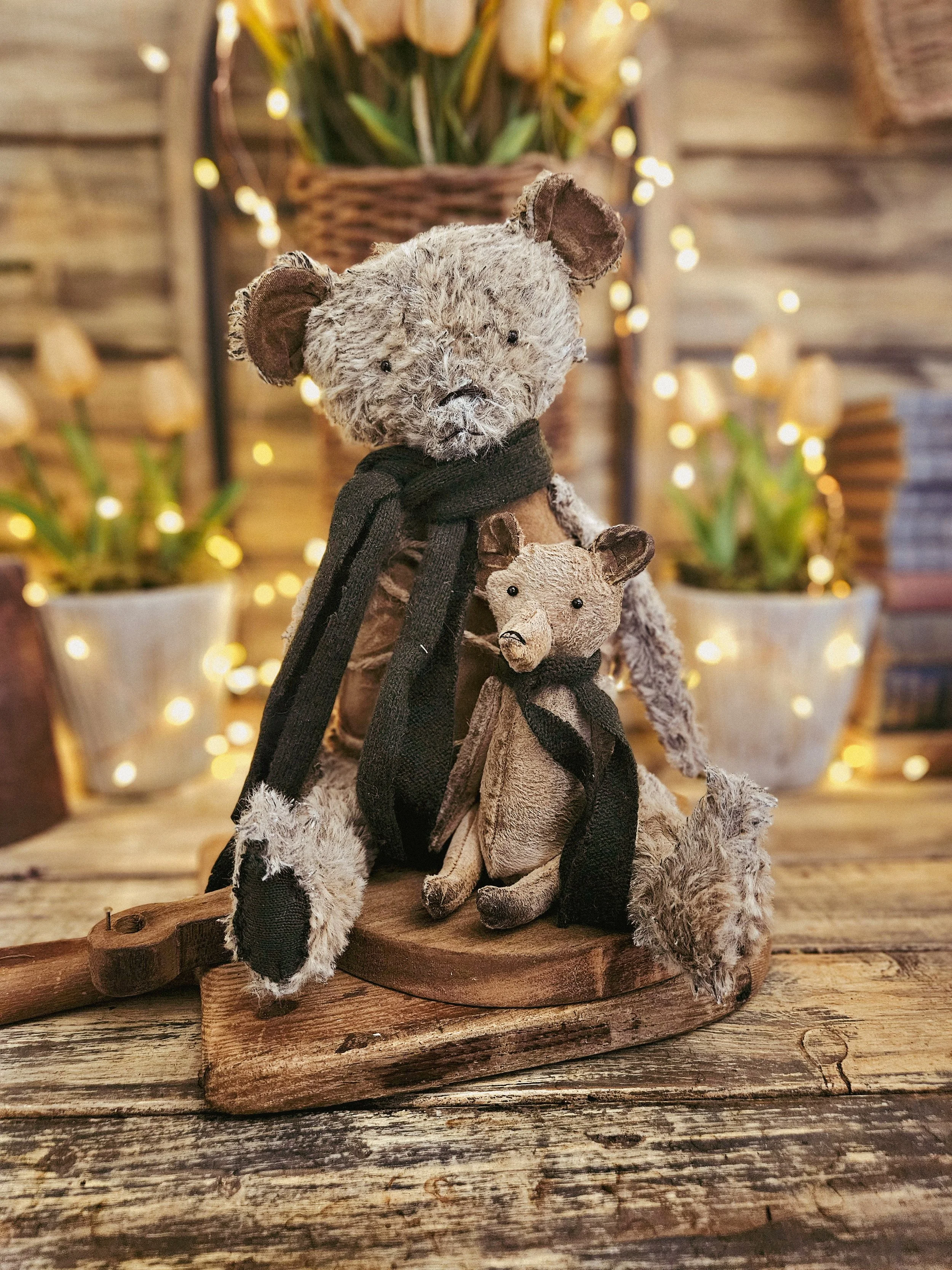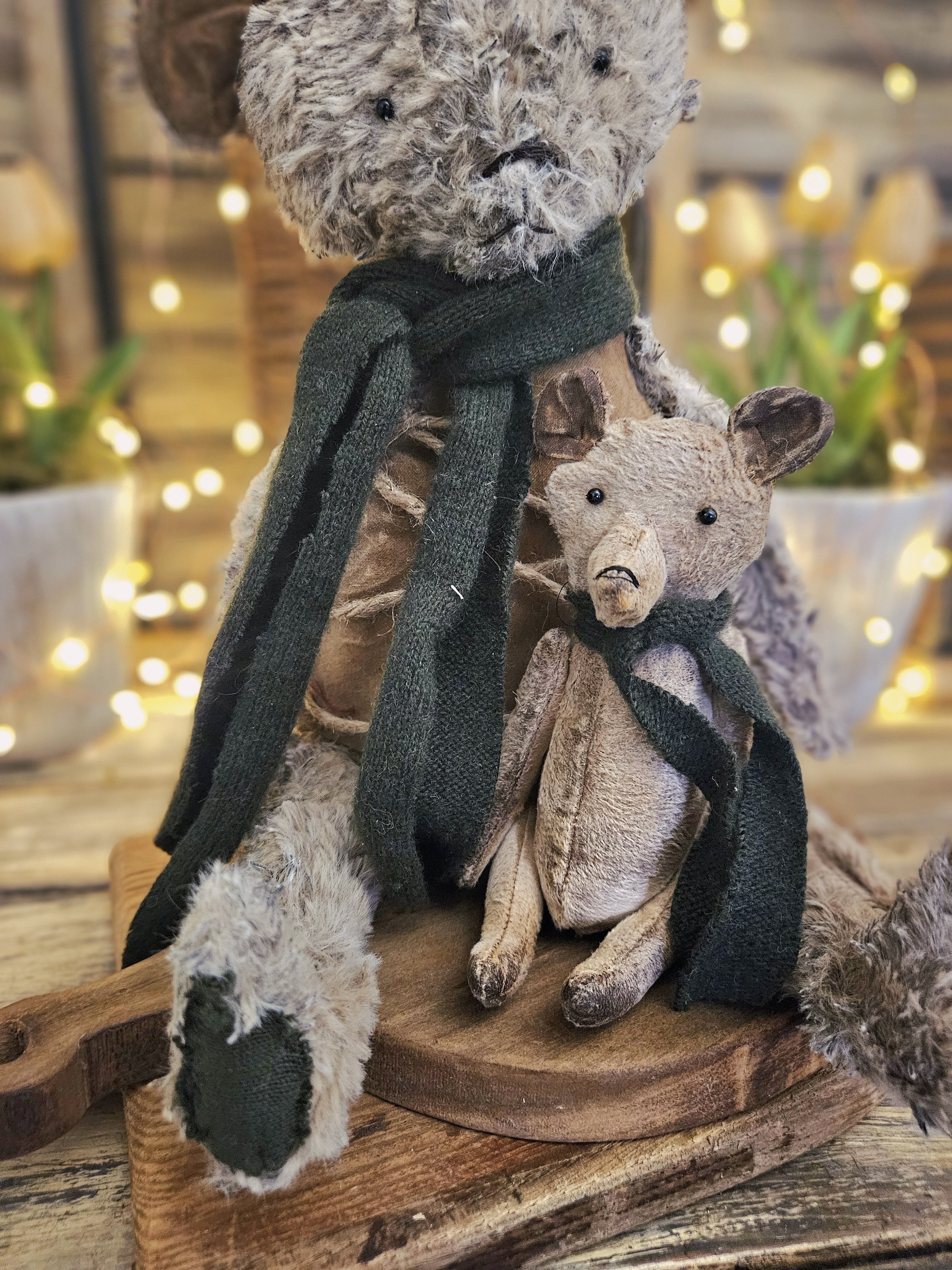 This tattered bear has a weighted bottom and measures approx. 12” sitting. He is made from an aged plush material. Wears a knit scarf. He holds a small bear