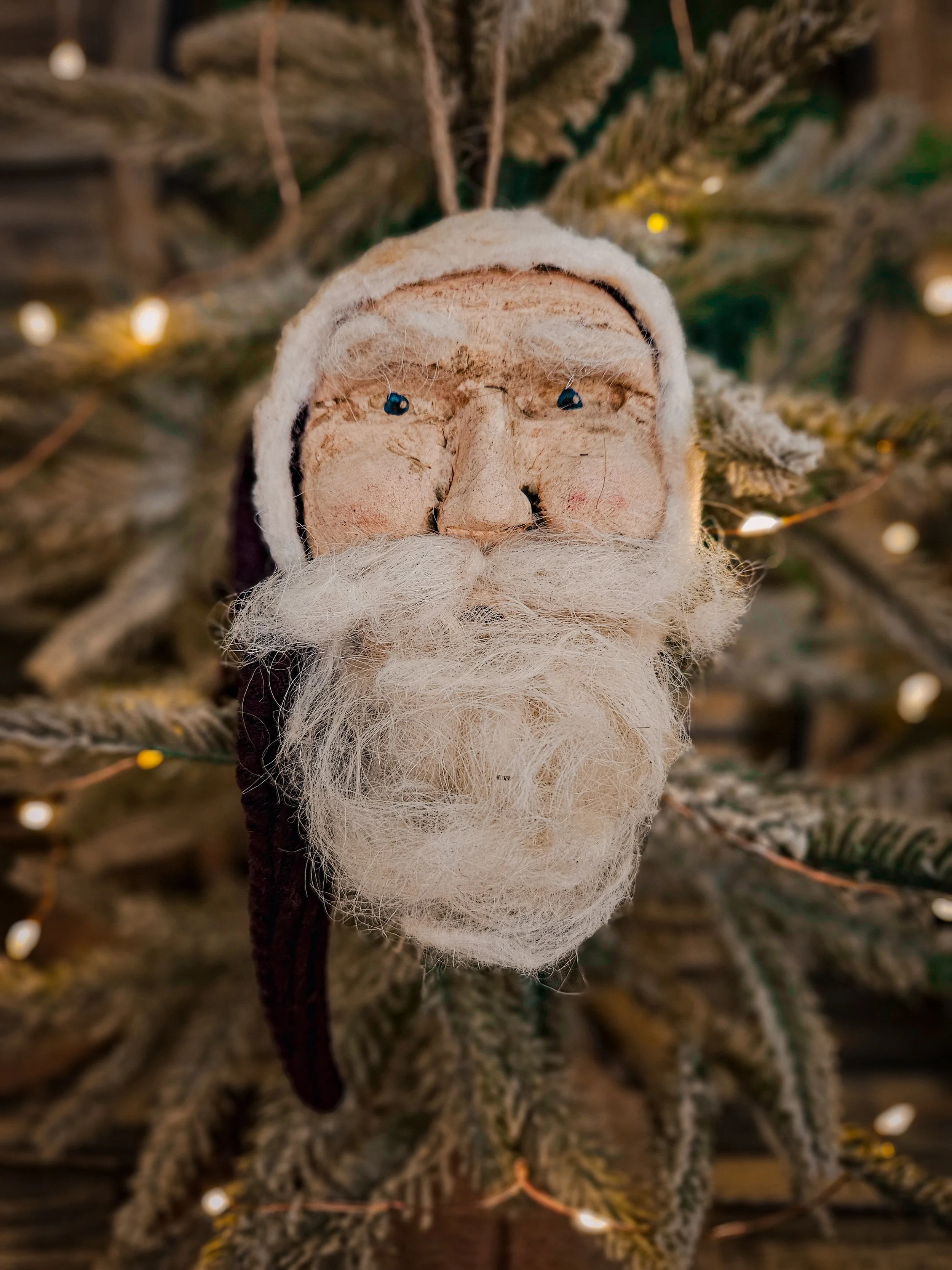 This ornament is hand sculpted and painted. His face measures approx. 3” and the entire ornament from hook to tip of his hat measures approx. 9”