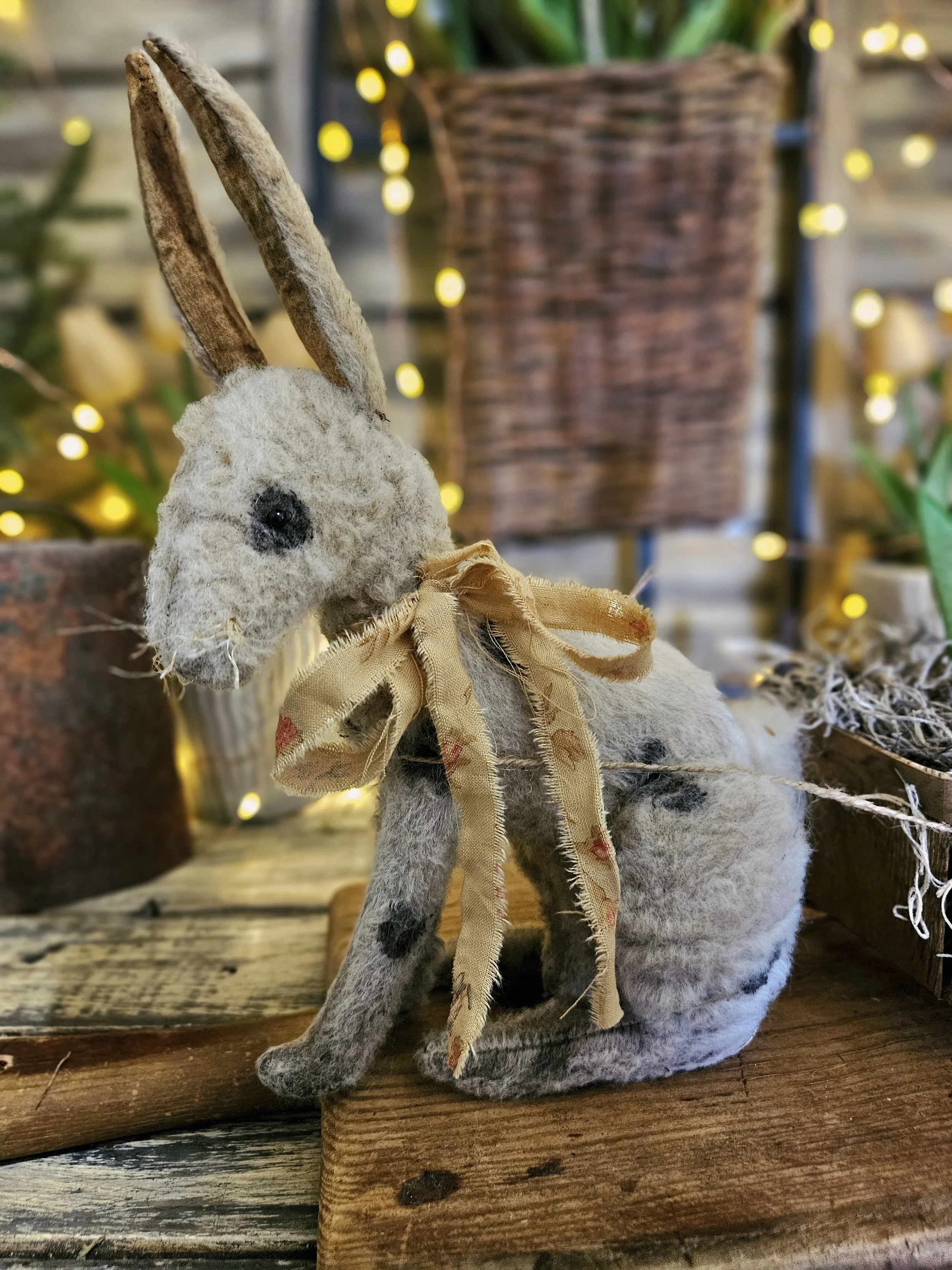 This Primitive Bunny is made from an aged plush felt fabric. He measures 10 1/2" tall to the tips of his ears. He is weighted.