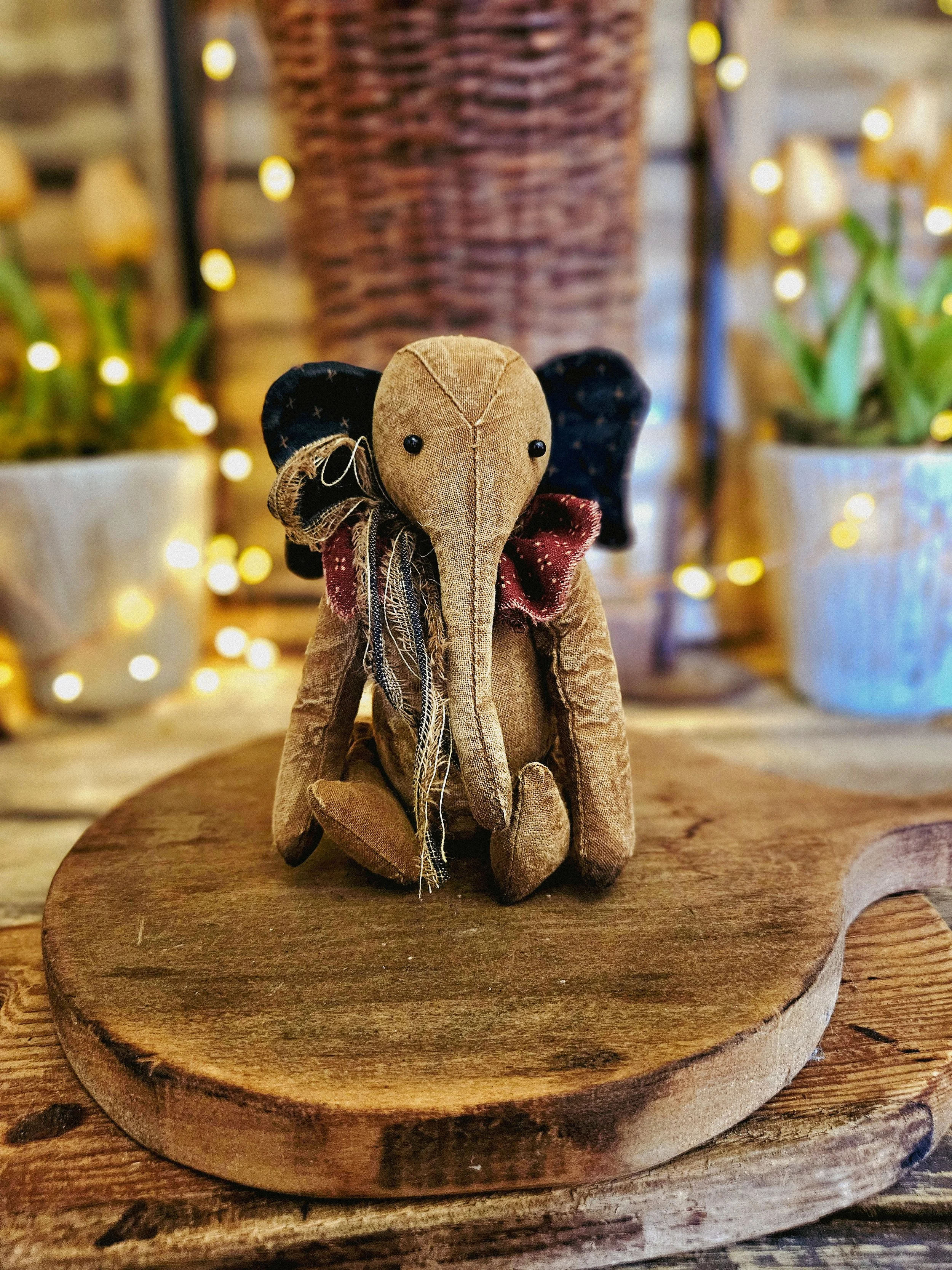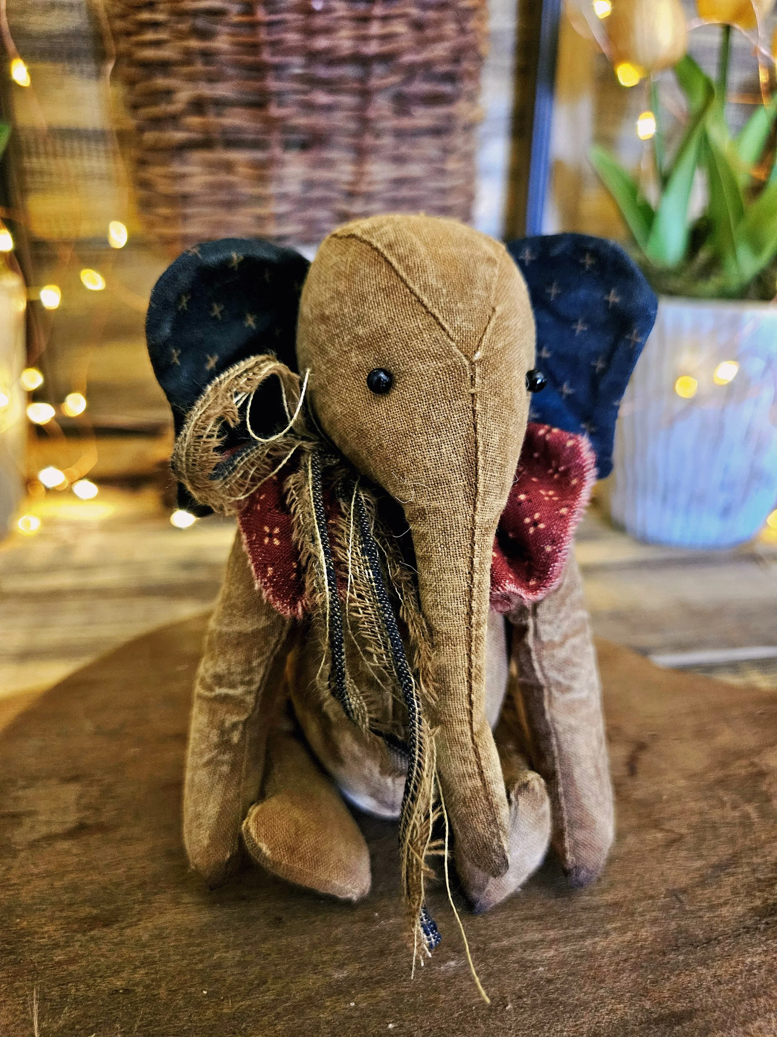 This small Americana elephant measures about 6” tall. Made from an aged material with glass bead eyes and an Americana ruffle around his neck. He is weighted.