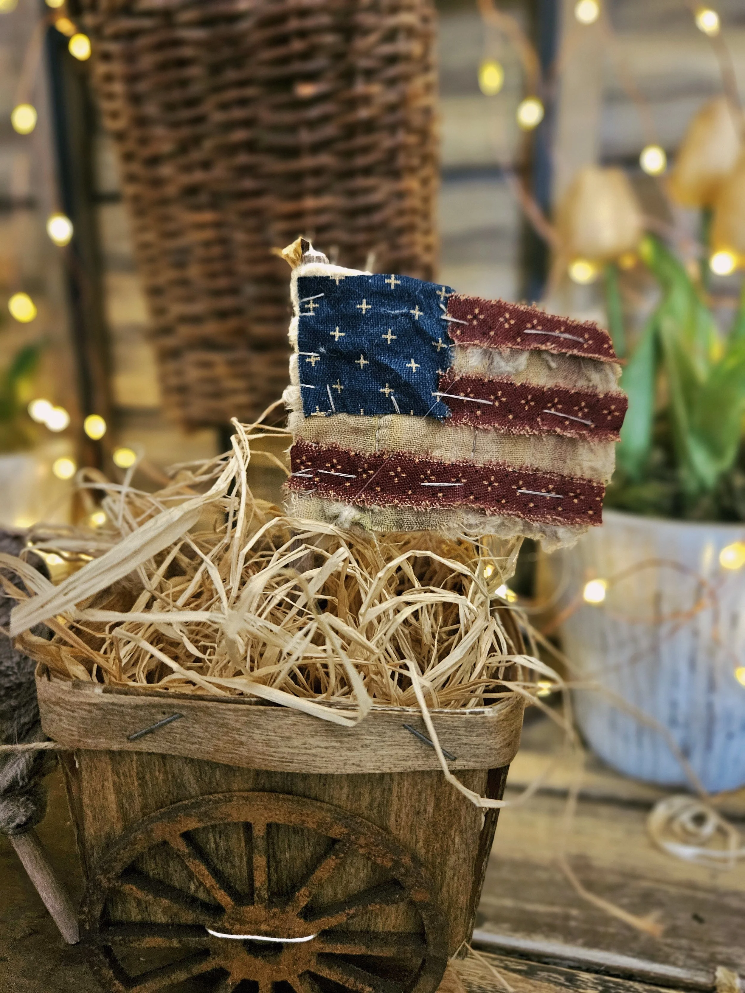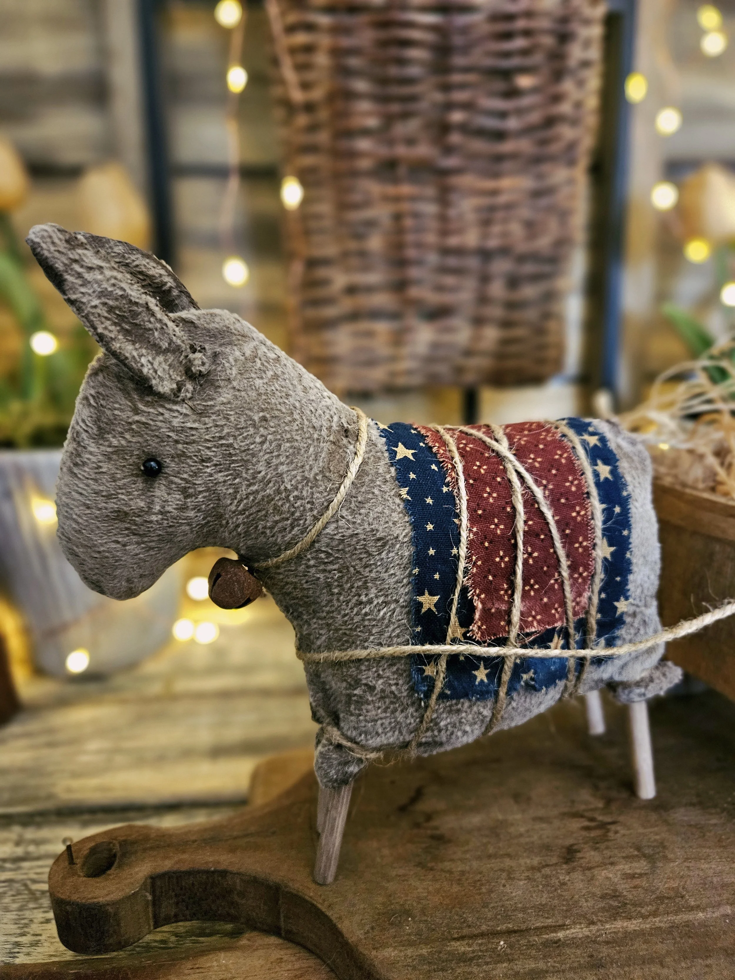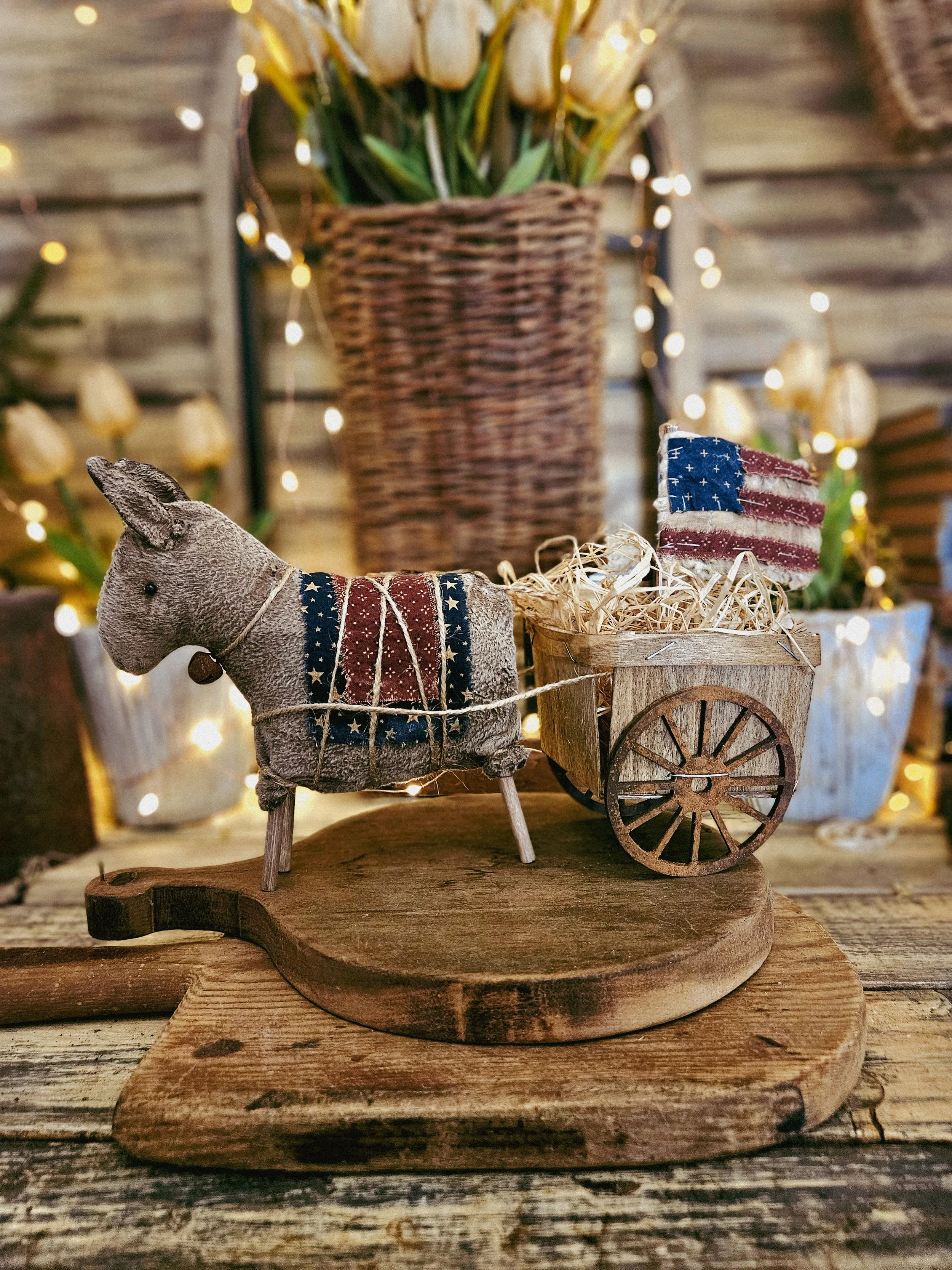 This donkey measures about 7” x 7”. He pulls a wooden cart. Inside the cart is a handmade American flag along with some spanish moss.
