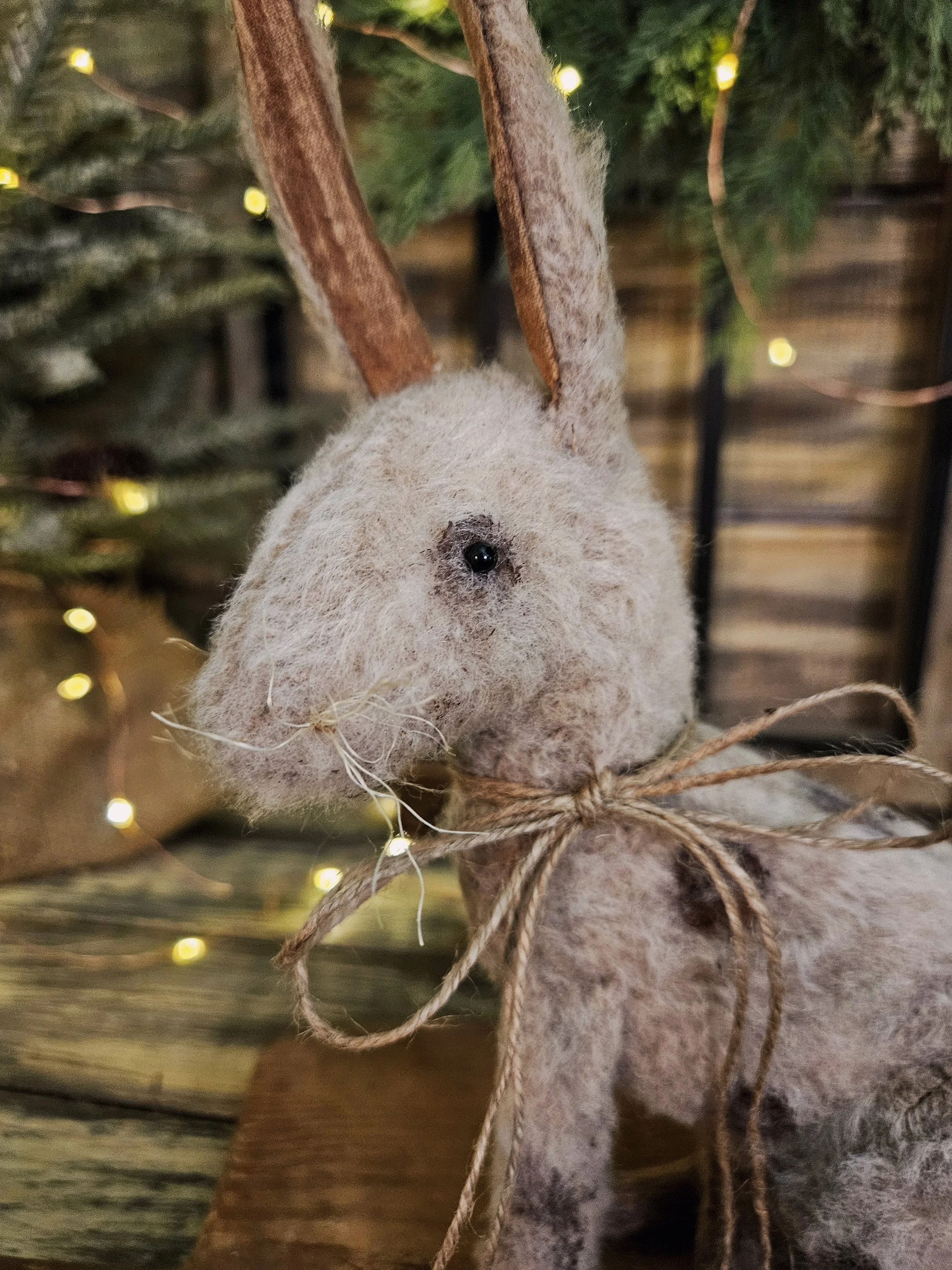 This Primitive Bunny is form aged tattered plush felt fabric He measures 10 1/2" tall to the tips of his ears. He is rag stuffed and a weighted.
