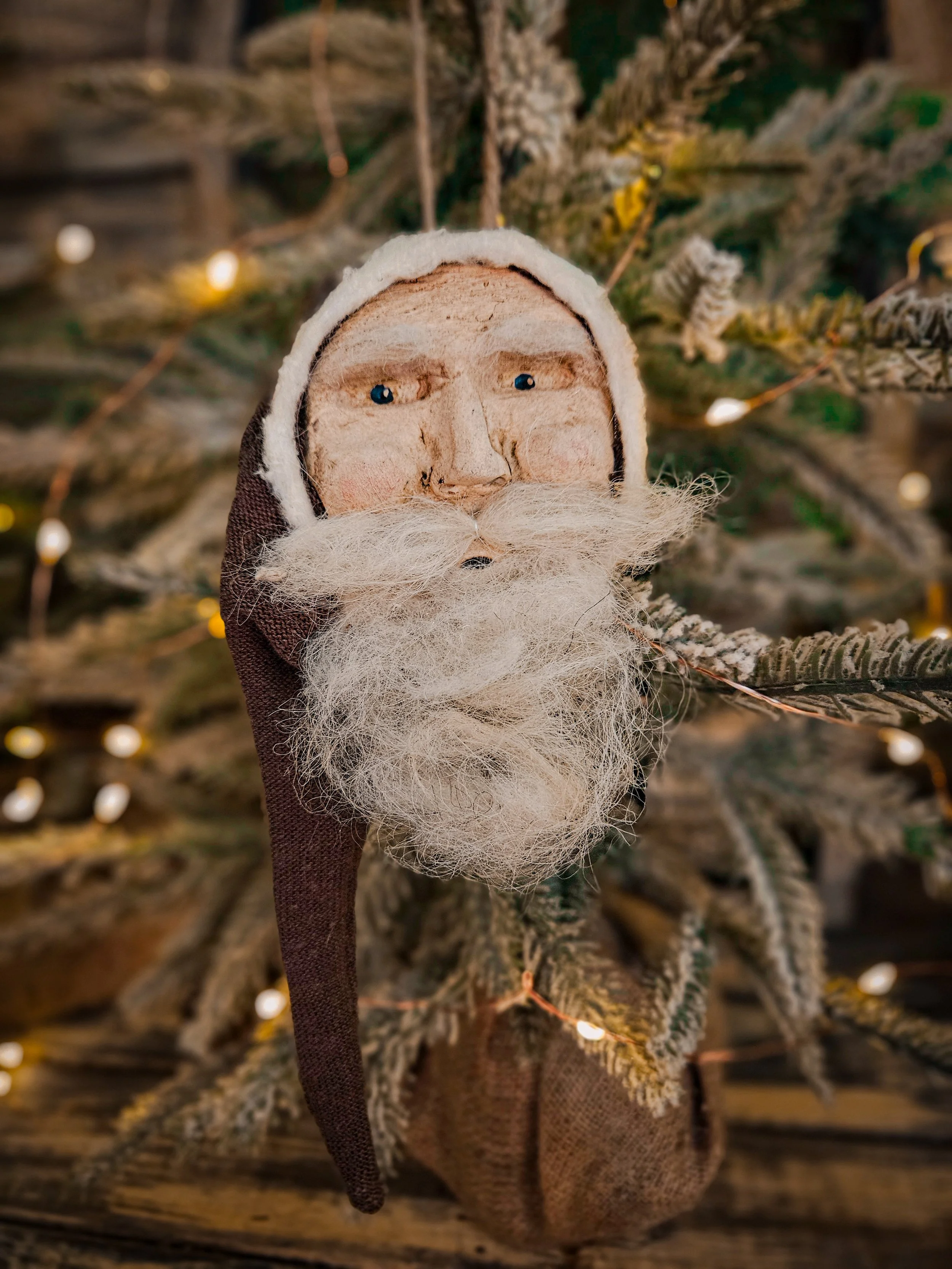 This ornament is hand sculpted and painted. His face measures approx. 3” and the entire ornament from hook to tip of his hat measures approx. 9”