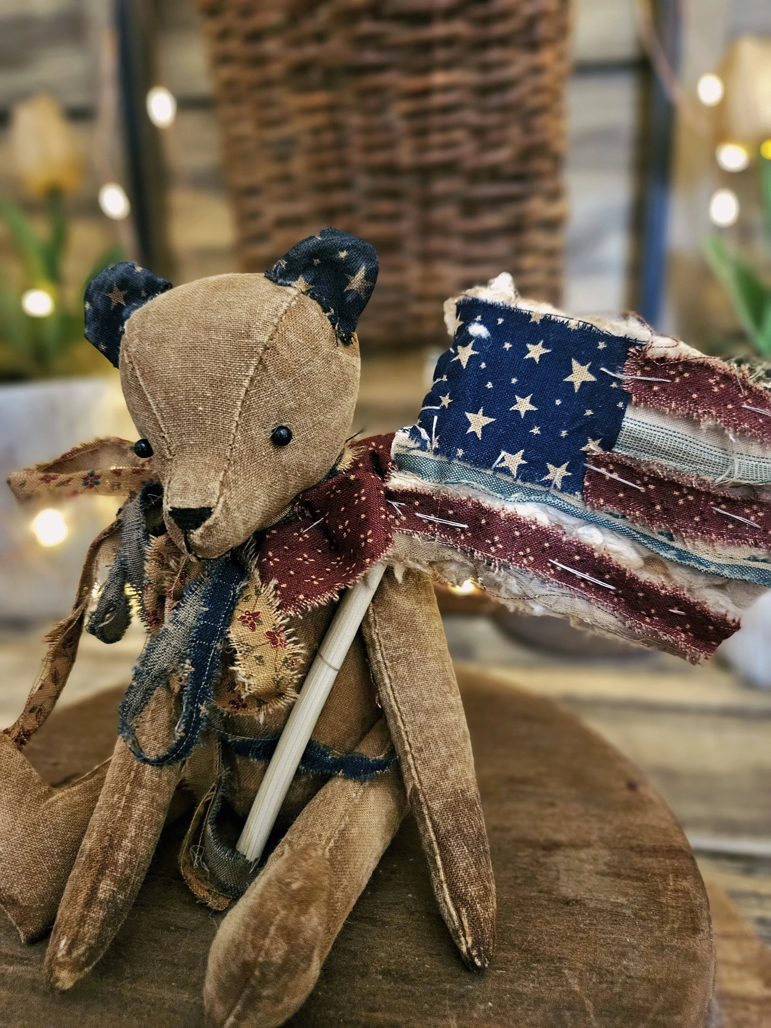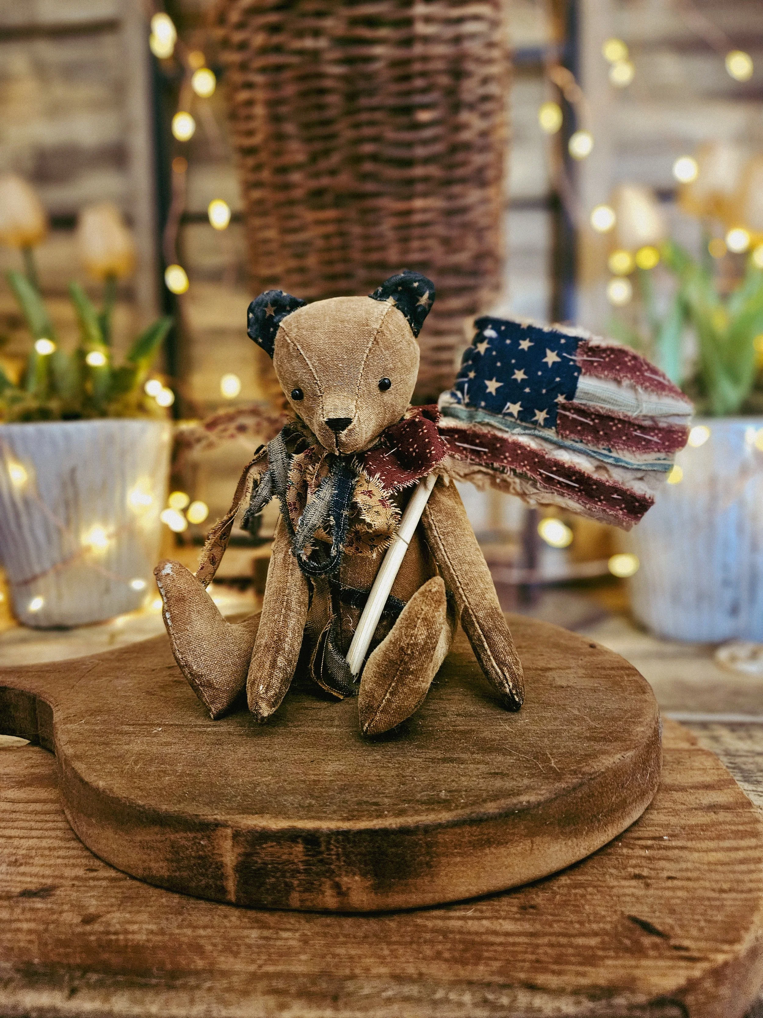 This little guy measured approximately 7 inches tall sitting. He is made from a grain sack material with a weighted body. He has been aged and He has tiny glass bead eyes with a hand stitched nose and mouth. He wears an americana bow.