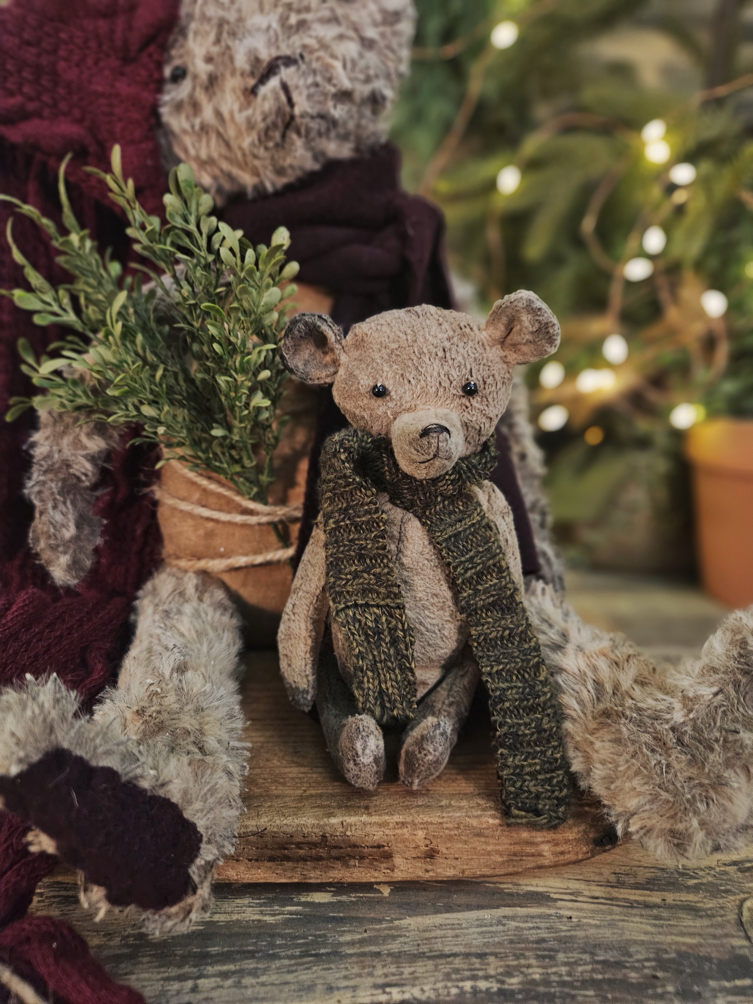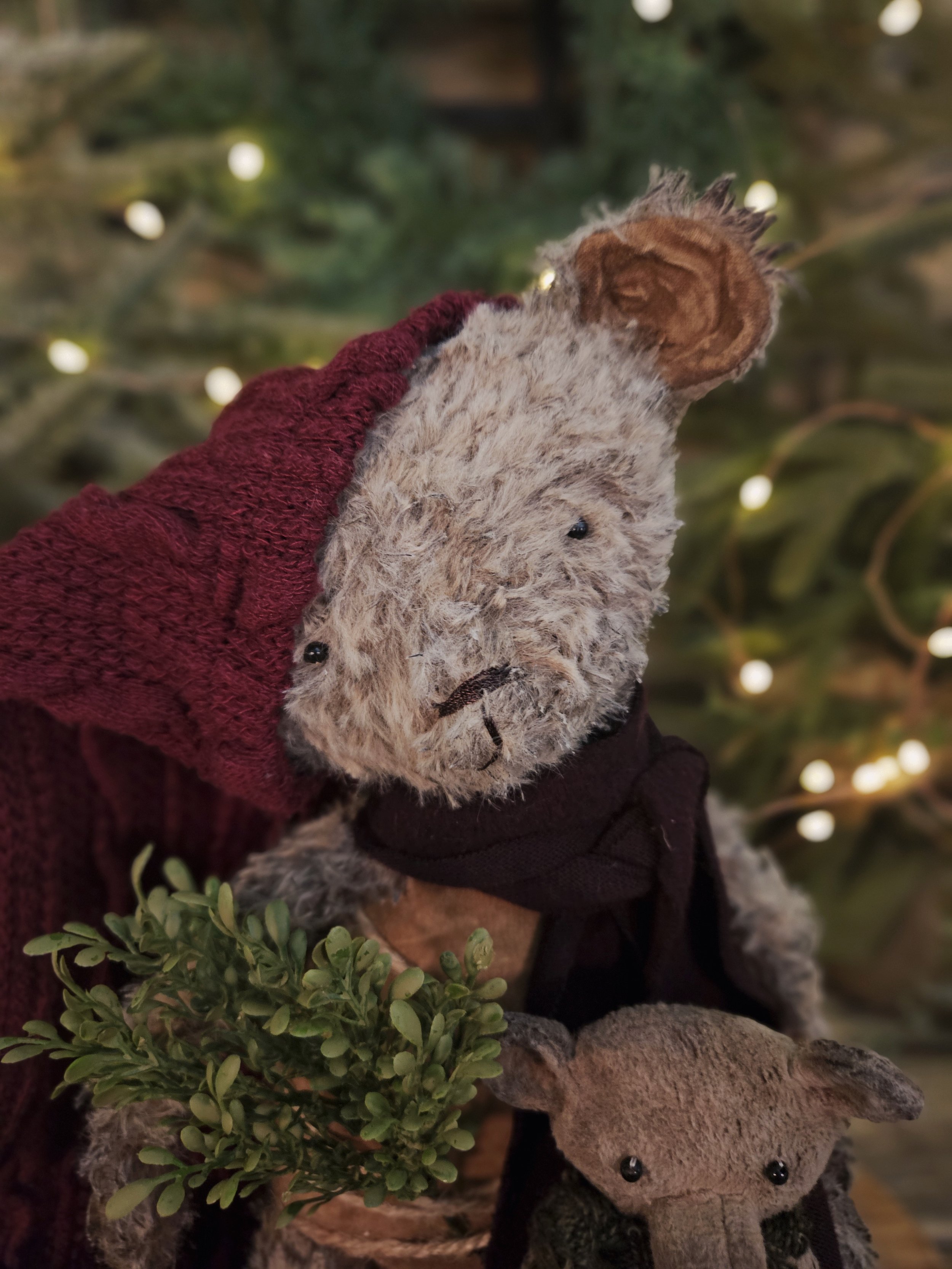 This tattered bear has a weighted bottom and measures approx. 12” sitting. He is made from an aged plush material. Wears a knit hat and scarf. He holds a bundle of faux greens and comes with a mini baby bear