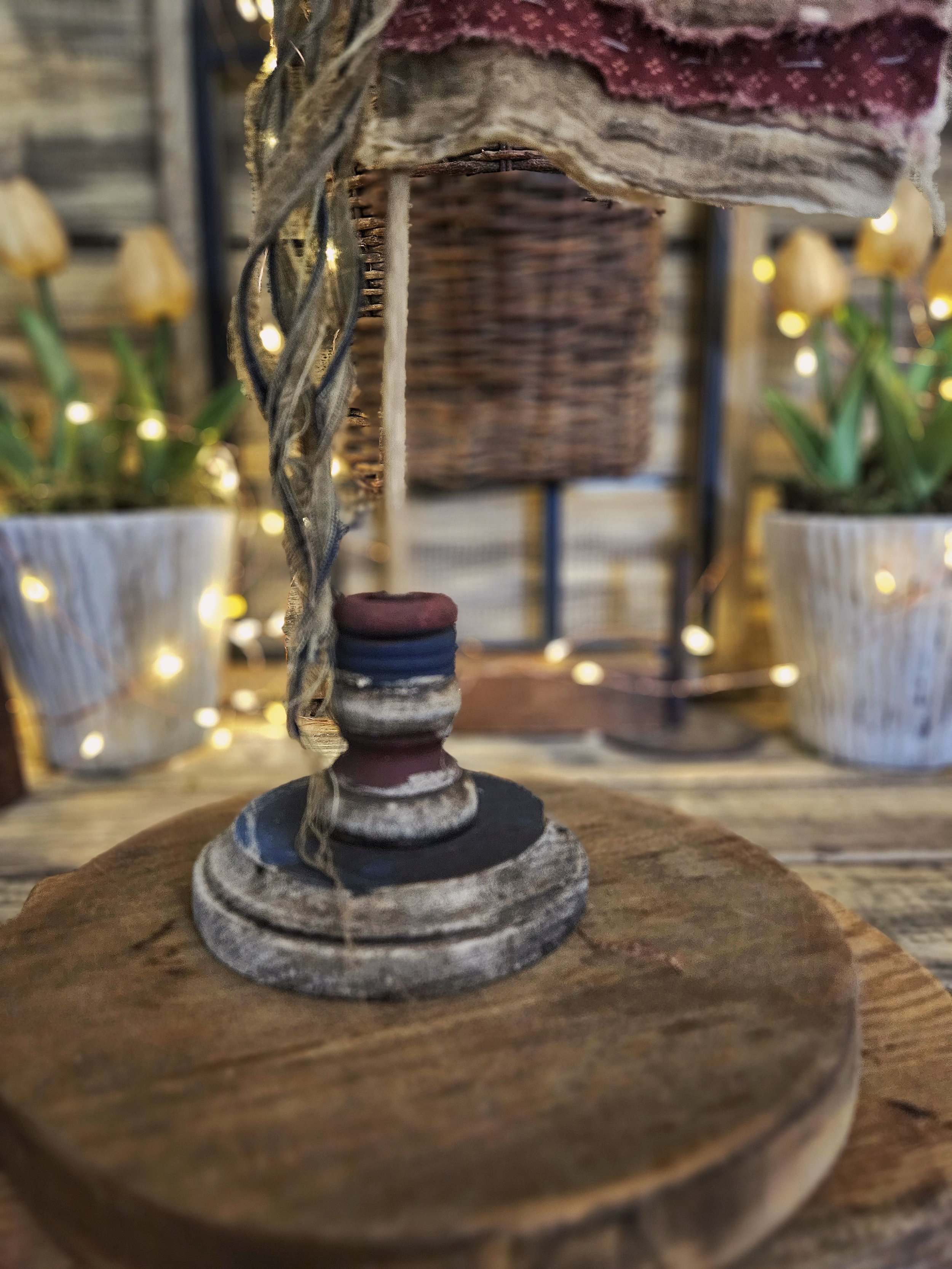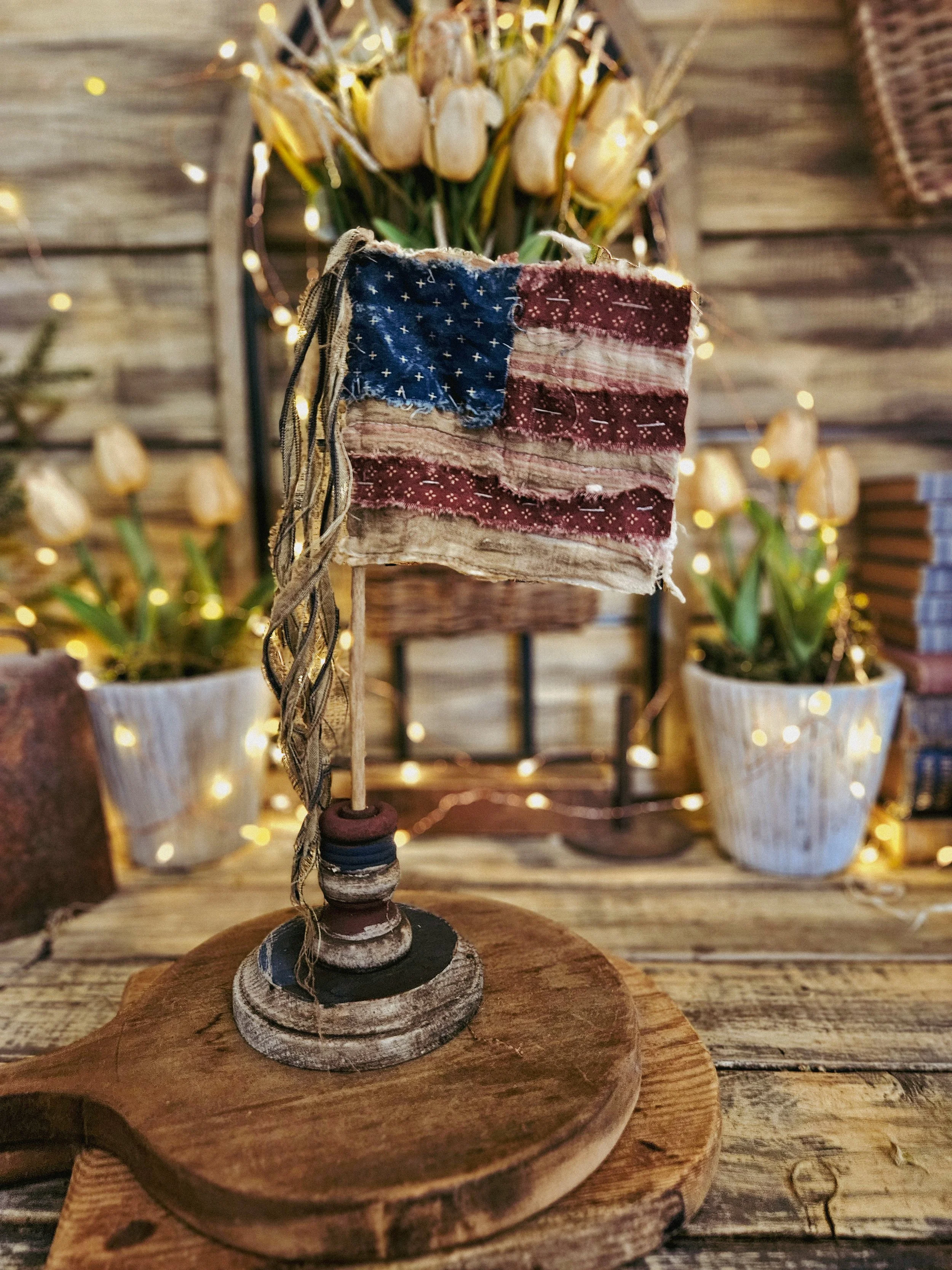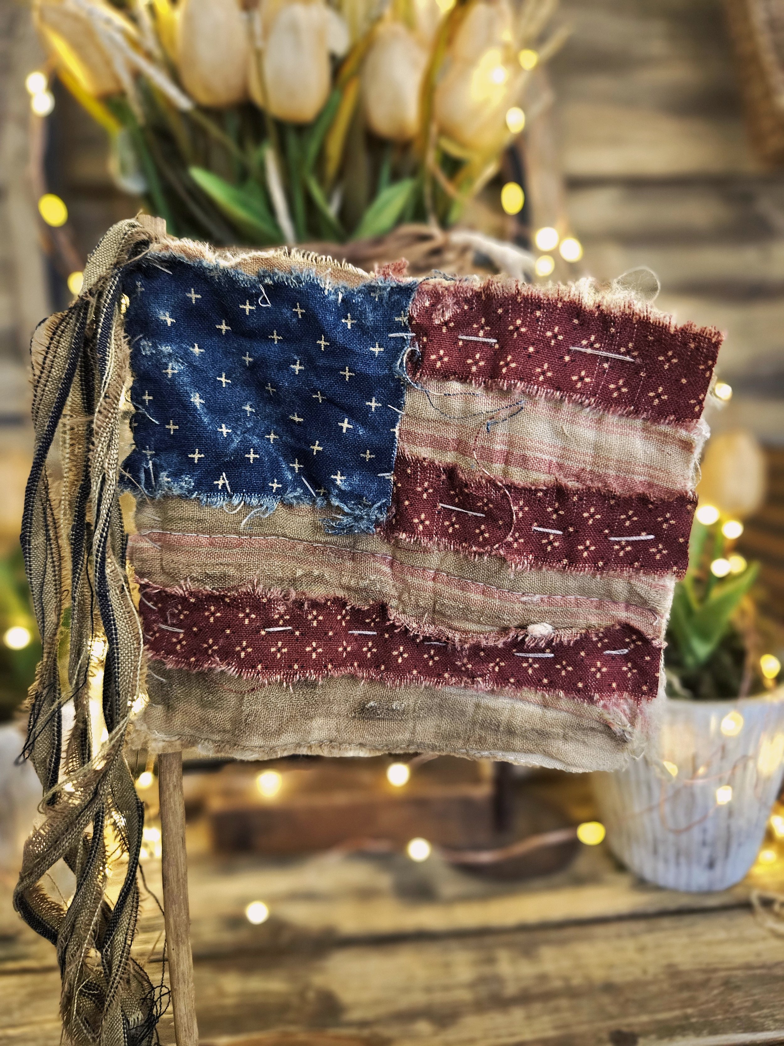 This Flag is completely hand stitched and made from an old vintage quilt. The base is handmade and hand painted