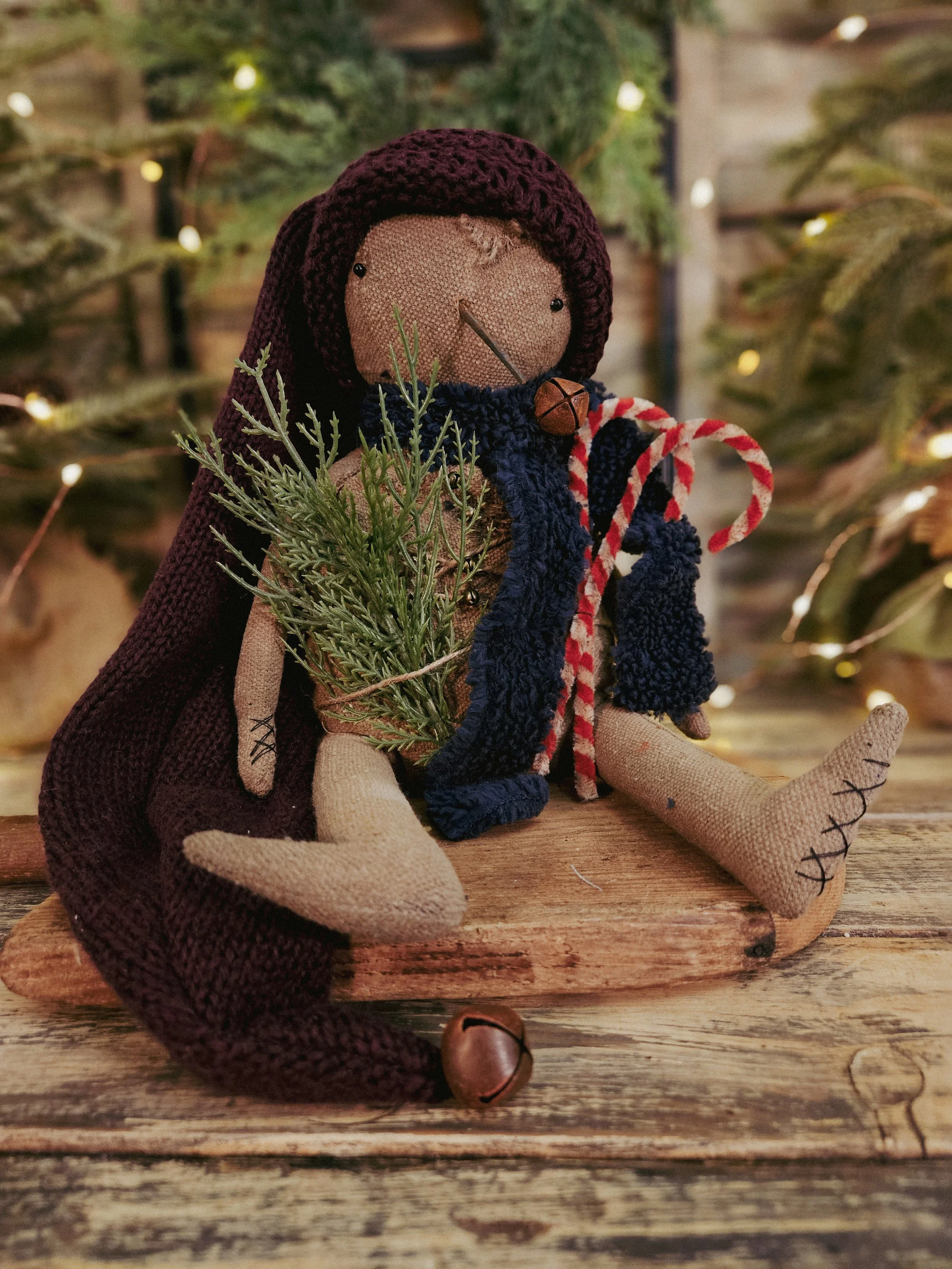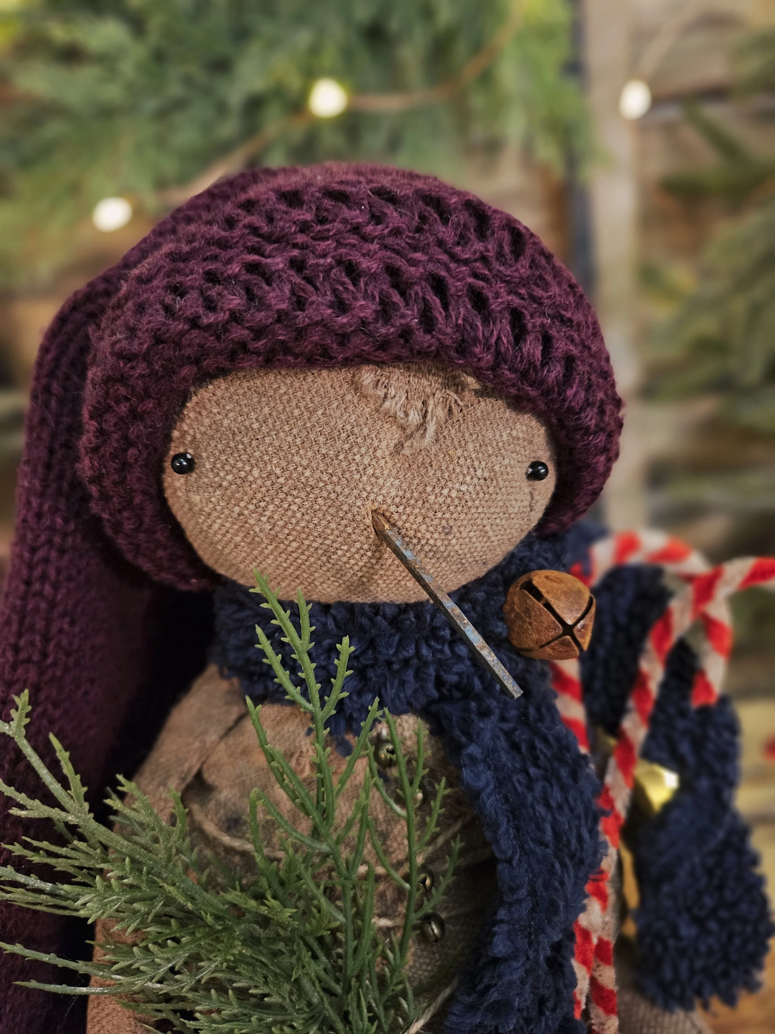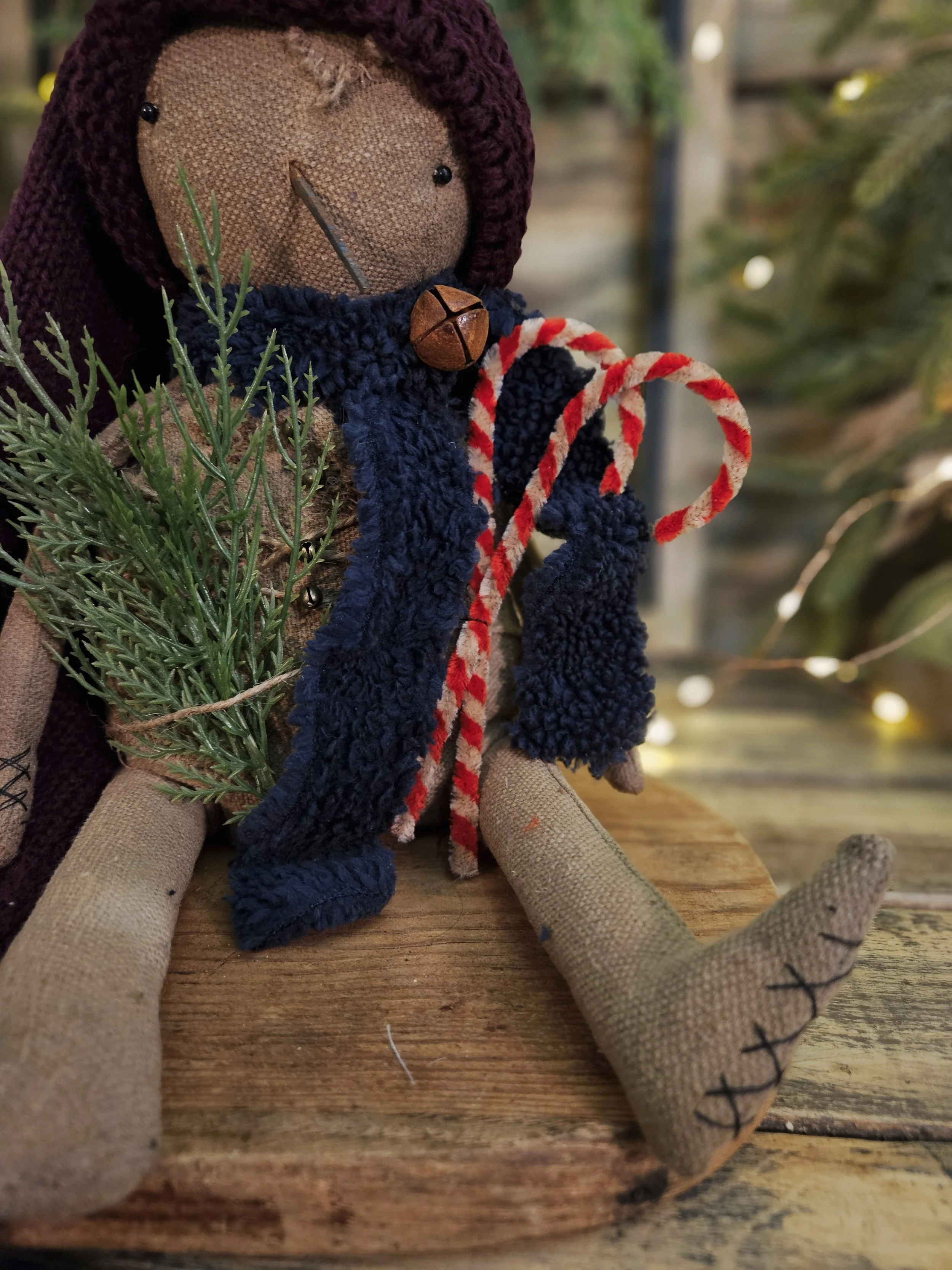 This tattered Snowman measures a total length if appropriately 15”. He has a weighted bottom and wears a knit hat and scarf. He holds some faux greens and candy canes