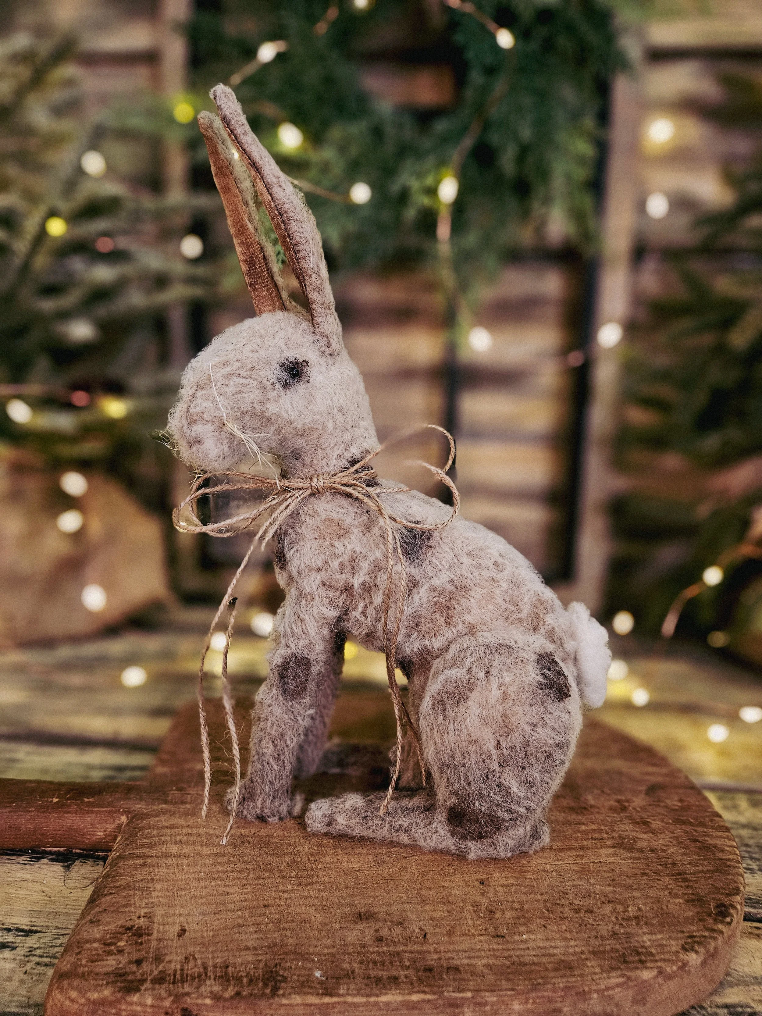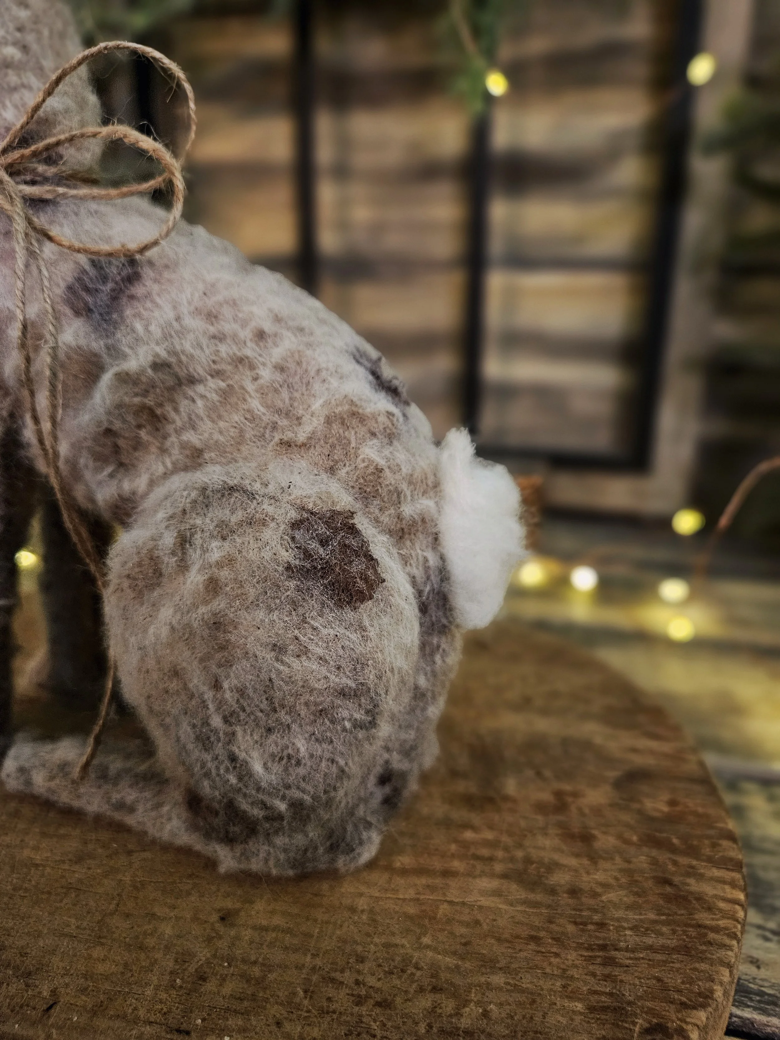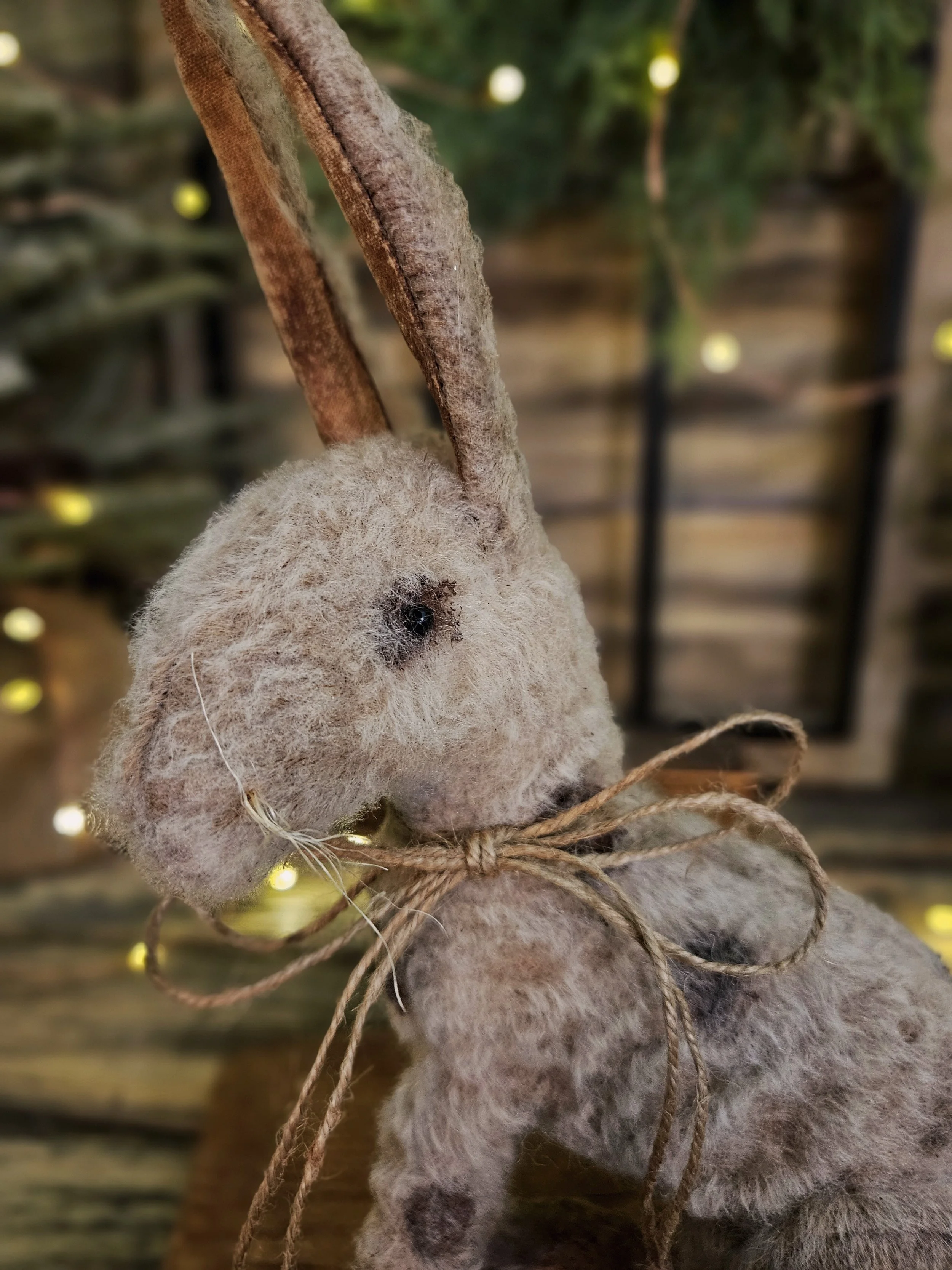 He has real glass bead eyes and sisal whiskers with a real wool tail.