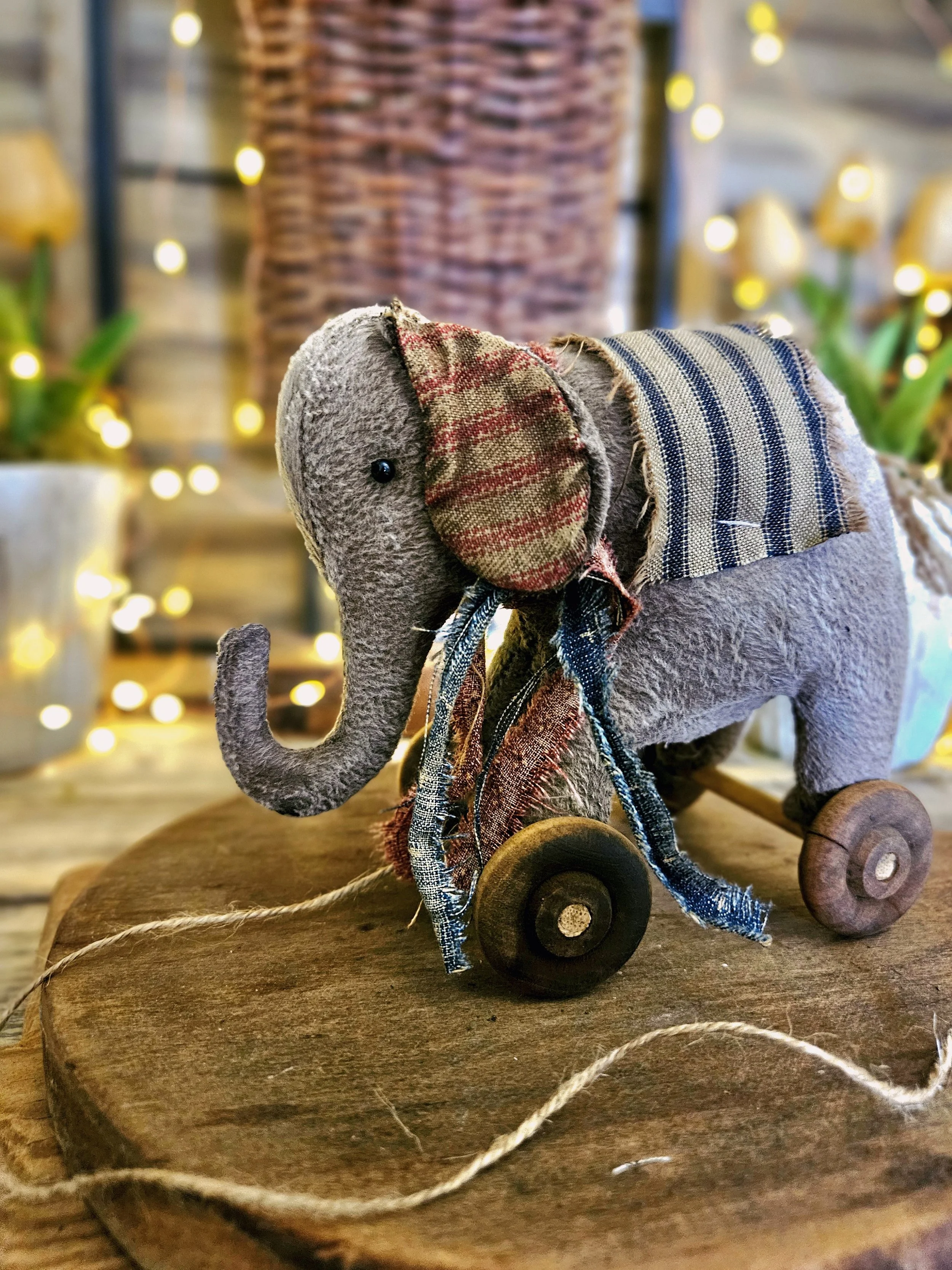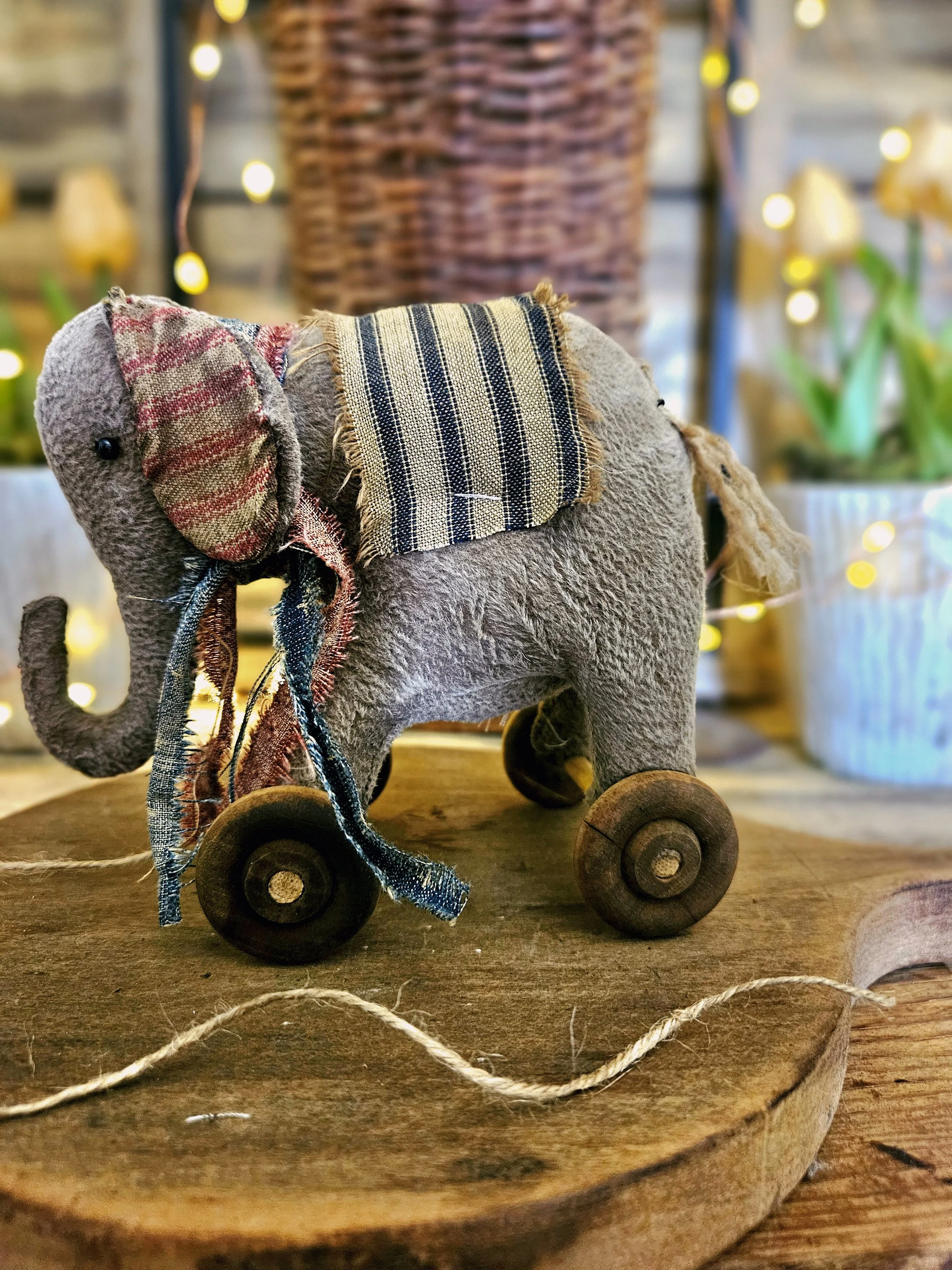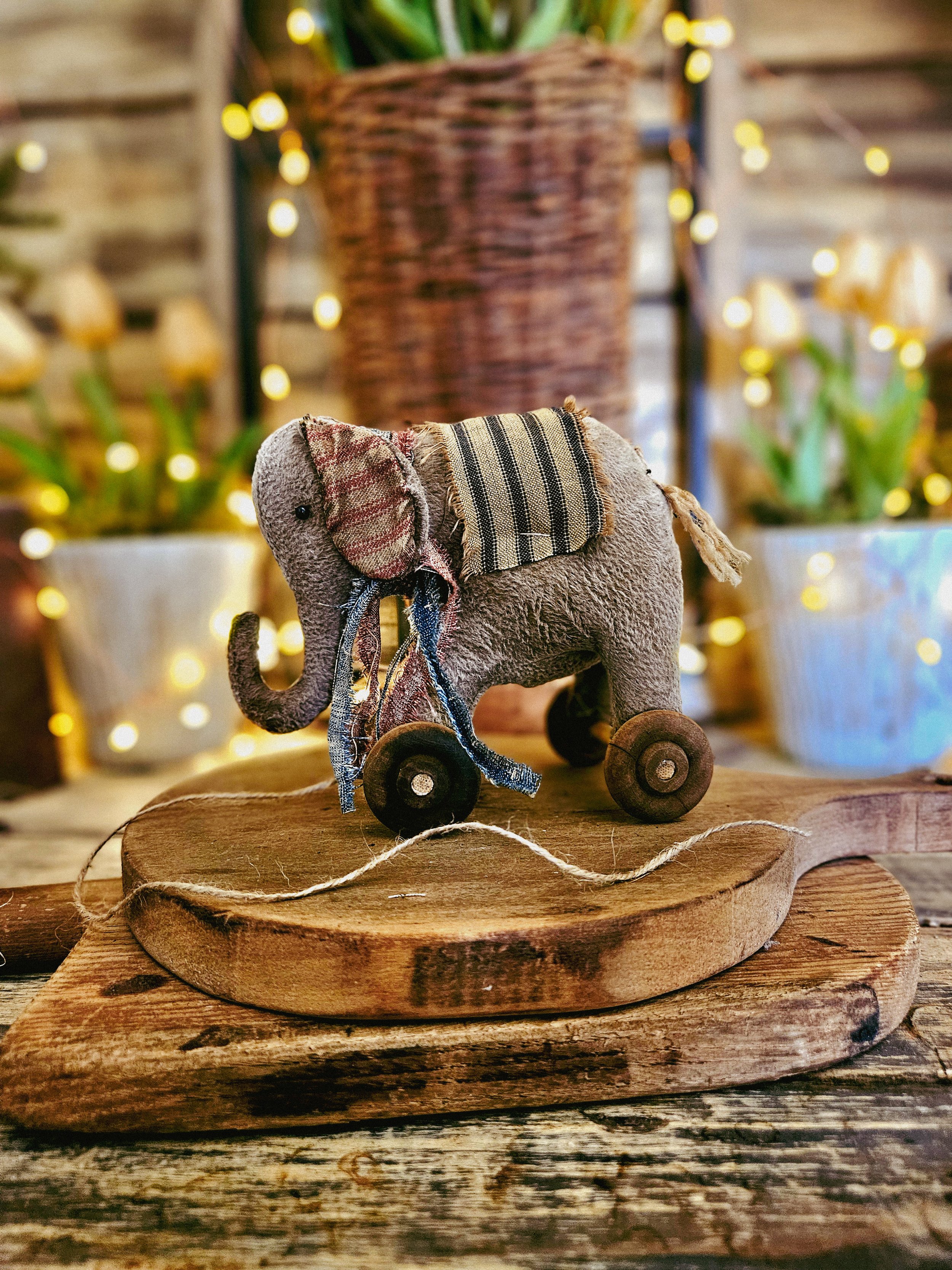 This primitive americana elephant pull toy measures about 6” x 5”. Made from an aged material and rag stuffed. He has small glass bead eyes and an americana bow. His wheels do not move.