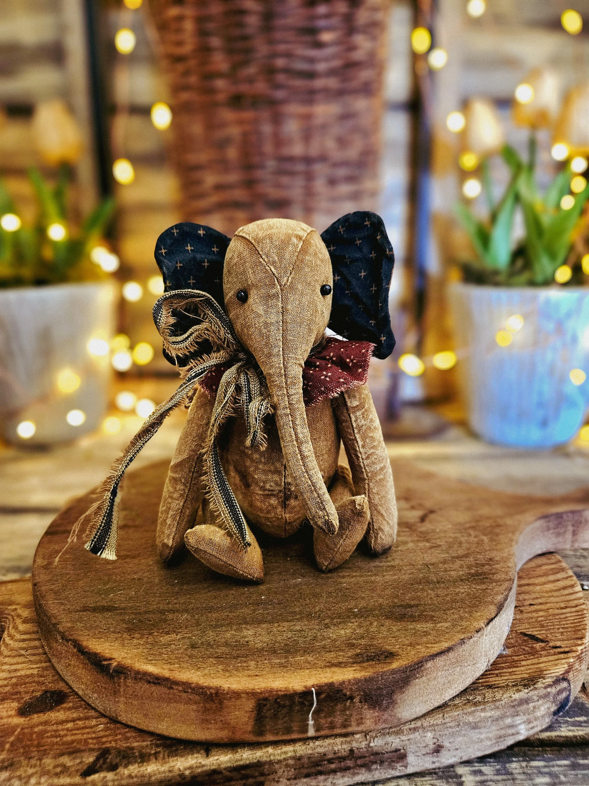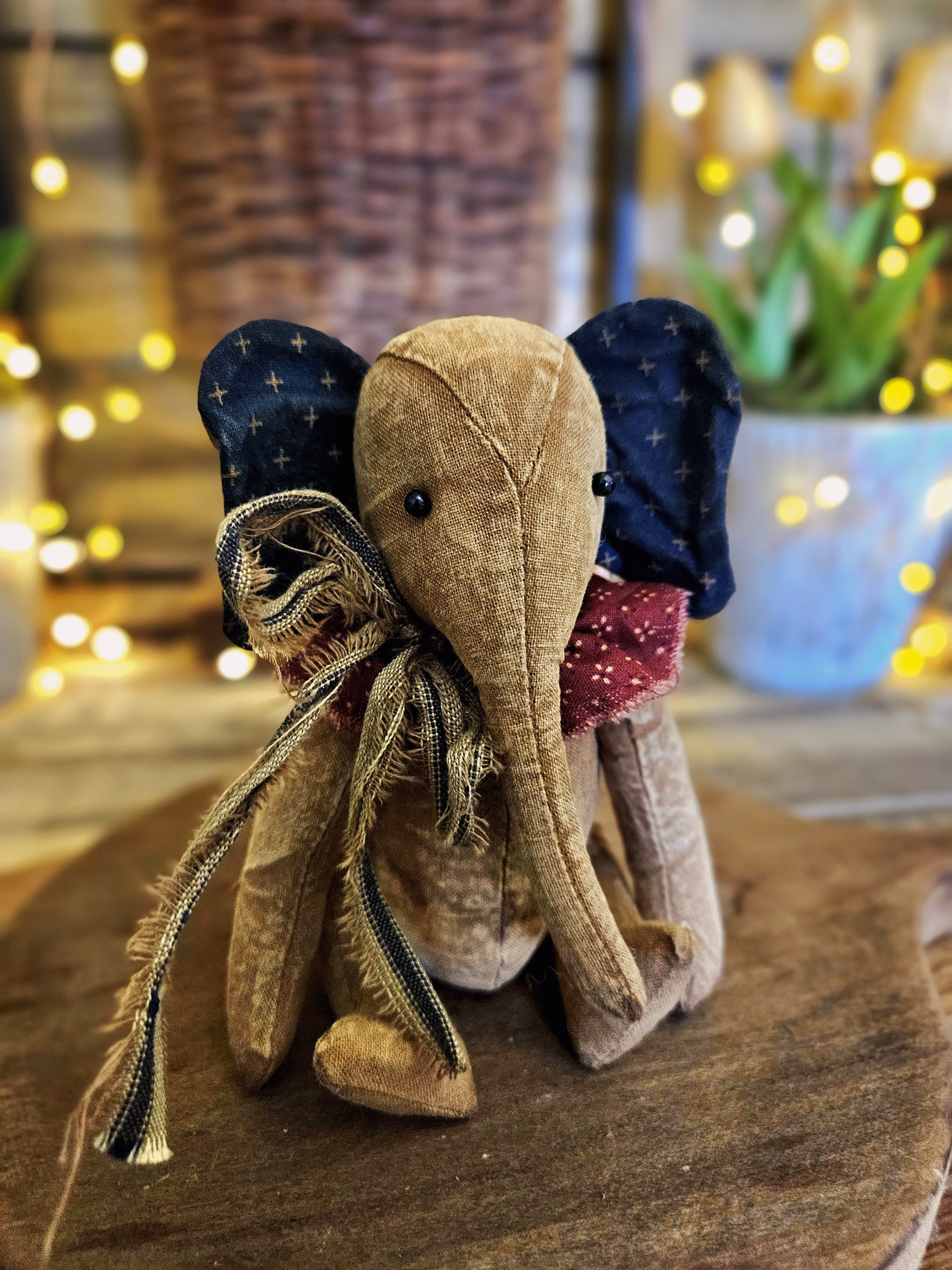 This small Americana elephant measures about 6” tall. Made from an aged material with glass bead eyes and an Americana ruffle around his neck. He is weighted.