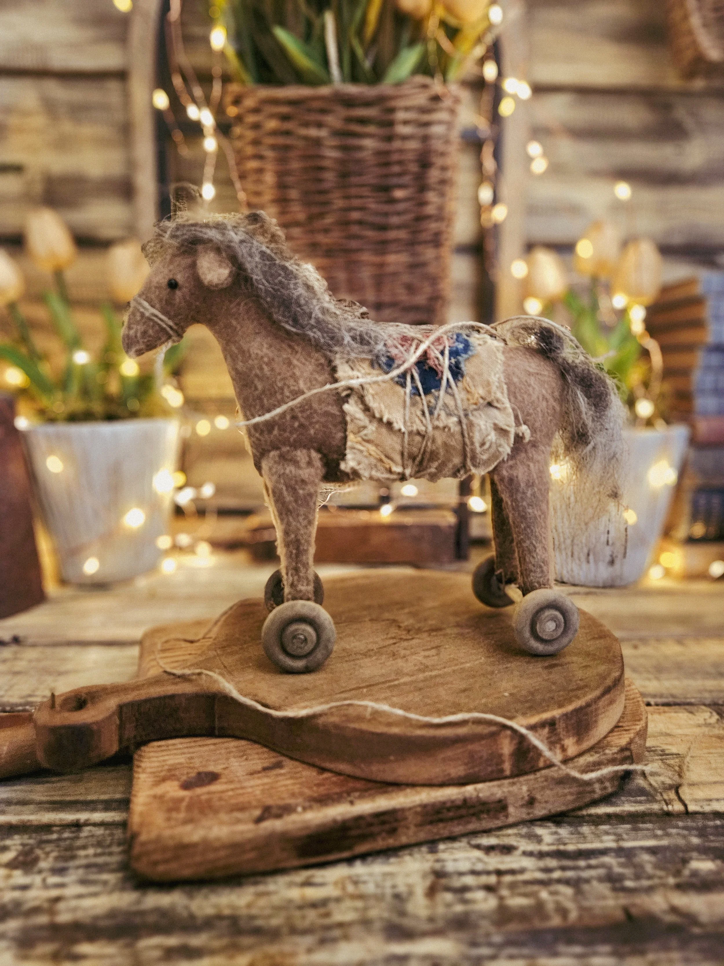 Shop › Horse Pull Toy #3 Horse Pull Toy #3 $48.00 sold out Measures approx 8"x8”Made from an aged material. A piece of a vintage quilt is draped over his back. Wheels do not move Measures approx 8"x8”Made from an aged material. A piece of a vintage quilt is draped over his back. Wheels do not move Get notified by email when this product is in stock. Sold Out Added!