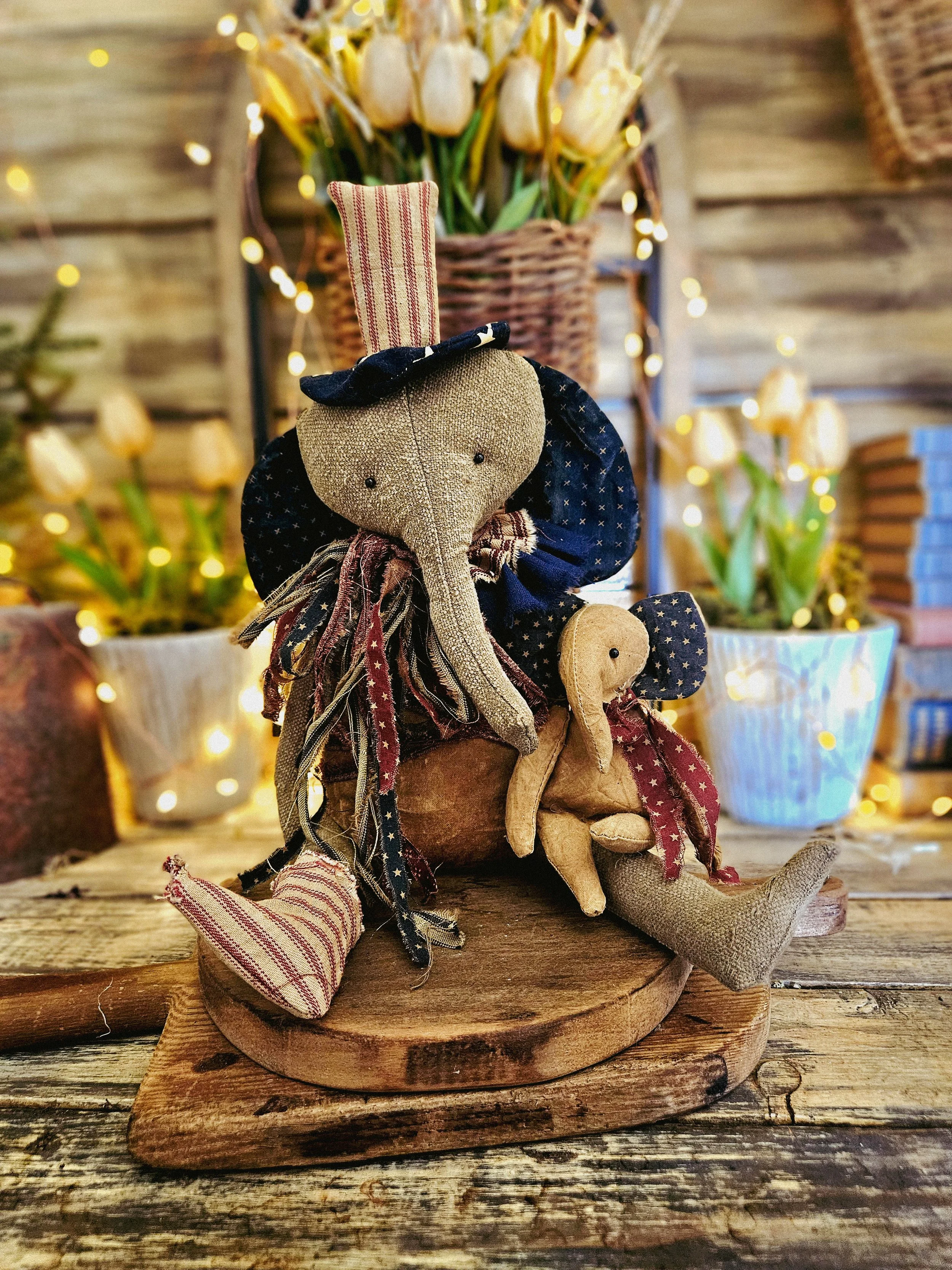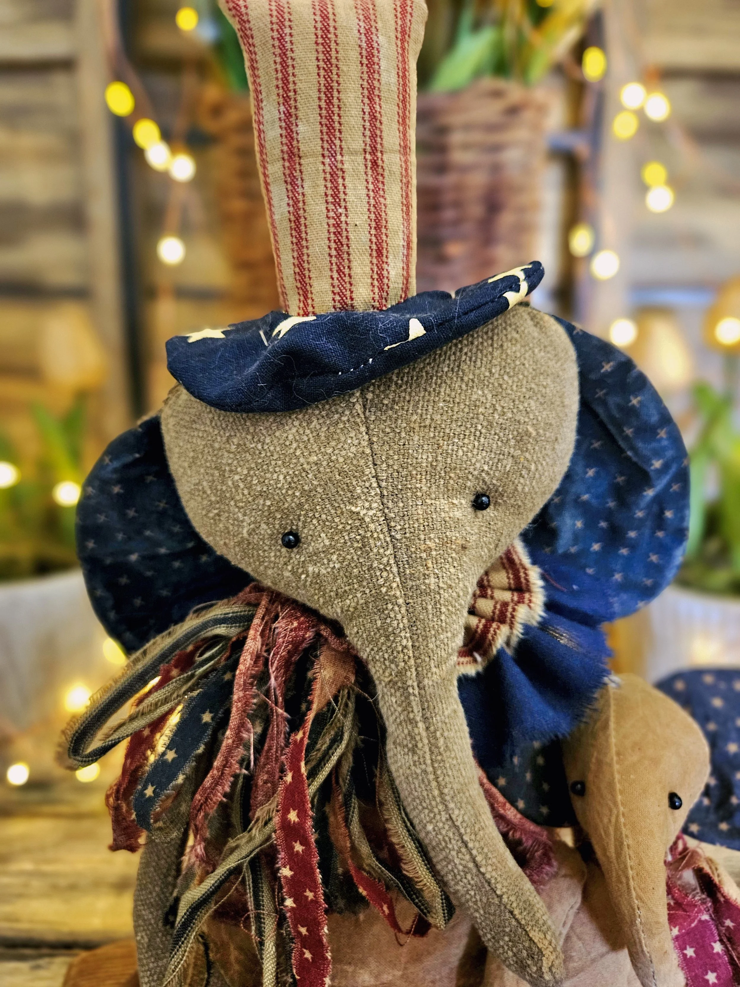 This tattered Elephant rag stuffed with a weighted bottom and measures approx. 12” sitting. He is made from an aged grain material. He wears an aged red white and blue Americana bow around his neck along with a handmade top hat on his head. He holds a mini elephant