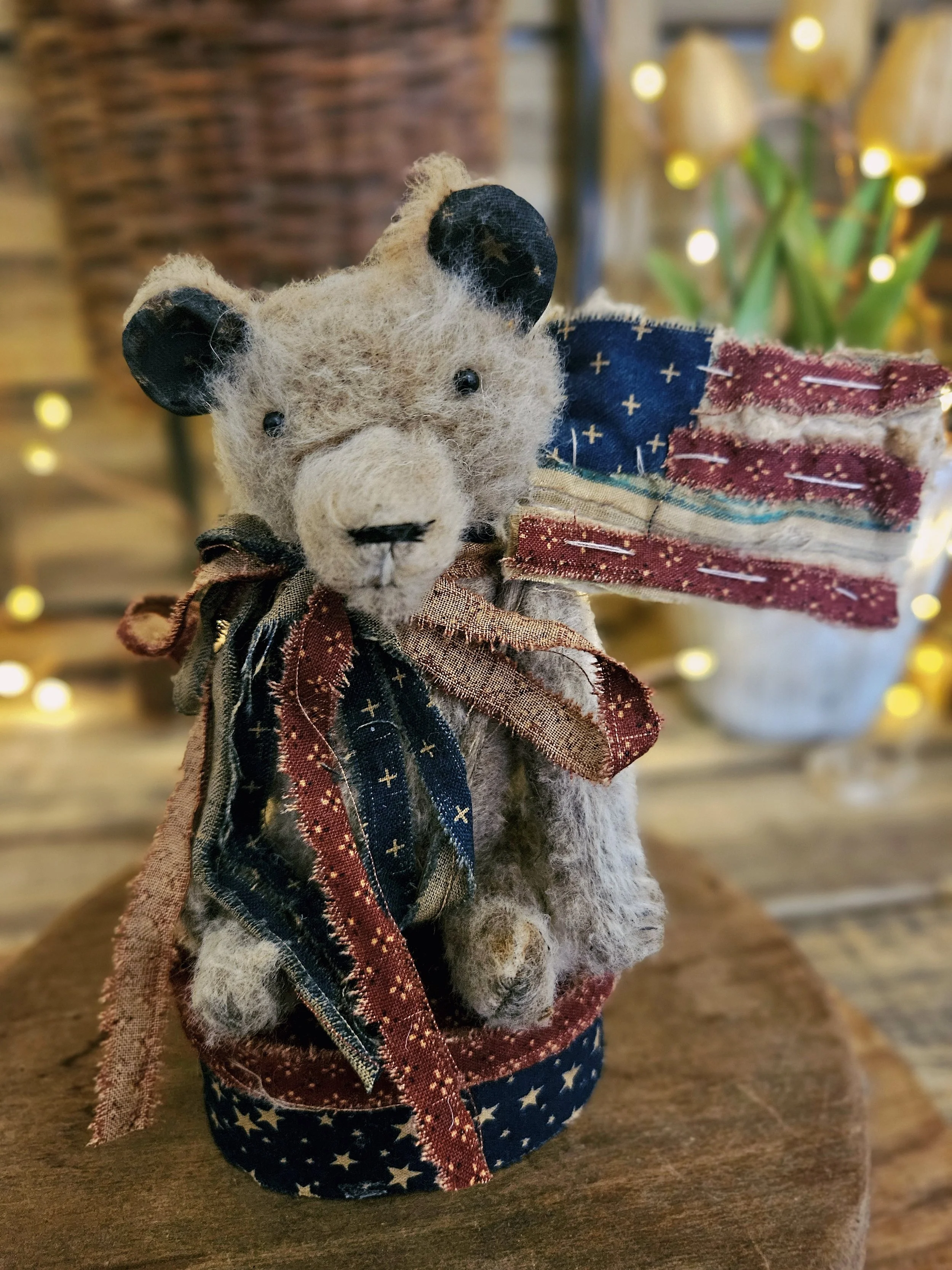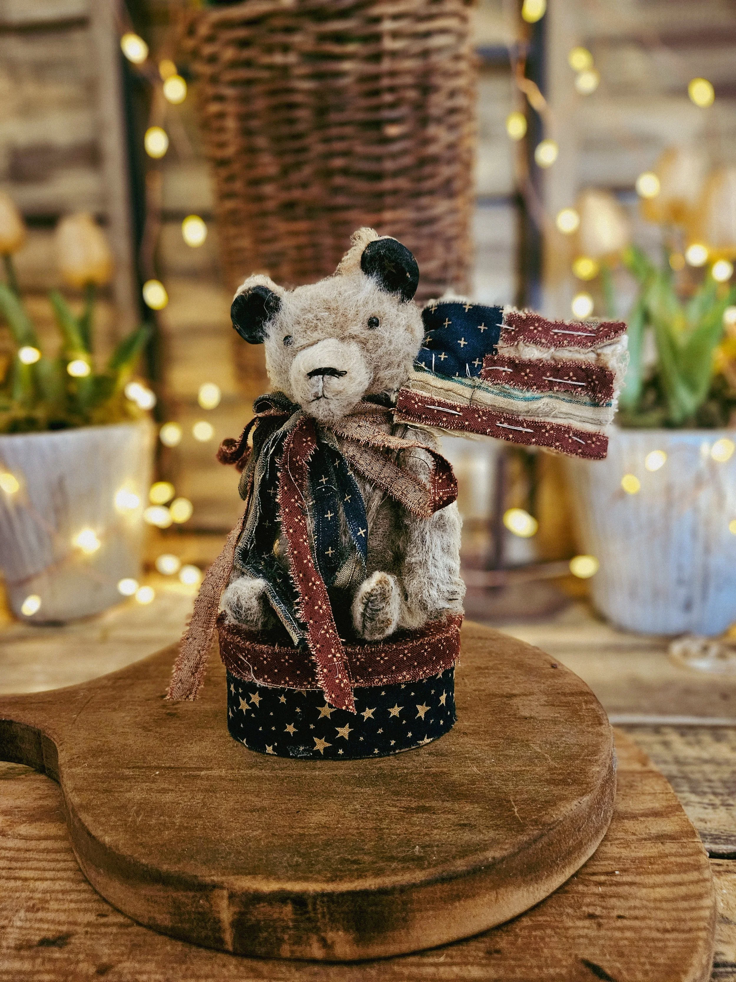 This Americana display includes one of my smaller tattered bears along with a fabric covered pantry box for him to sit on. He holds a handmade vintage quilt flag.