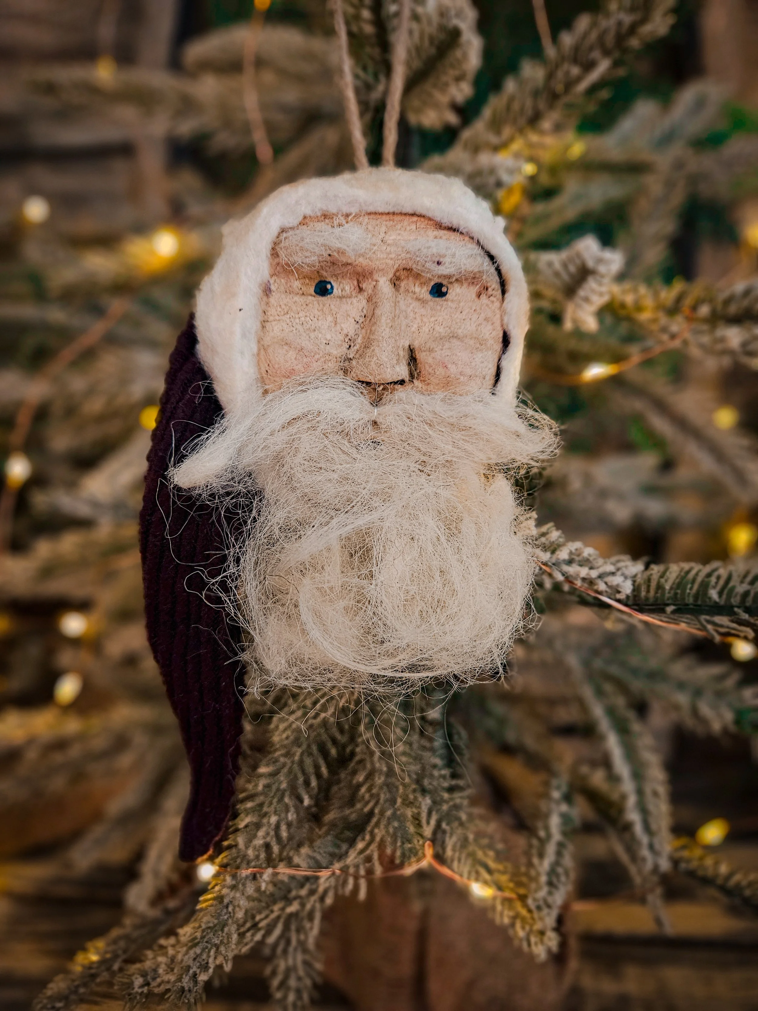 This ornament is hand sculpted and painted. His face measures approx. 3” and the entire ornament from hook to tip of his hat measures approx. 9”
