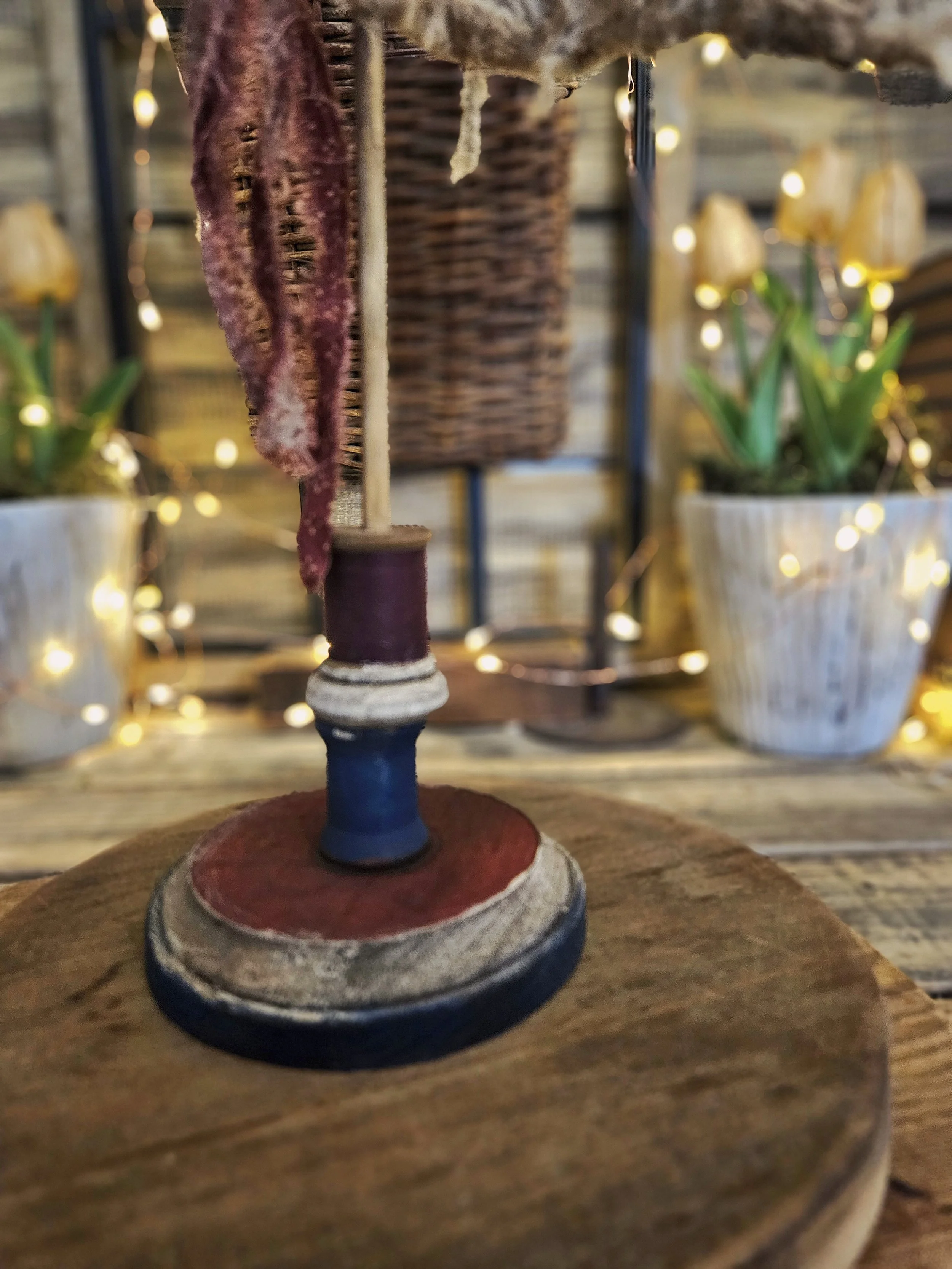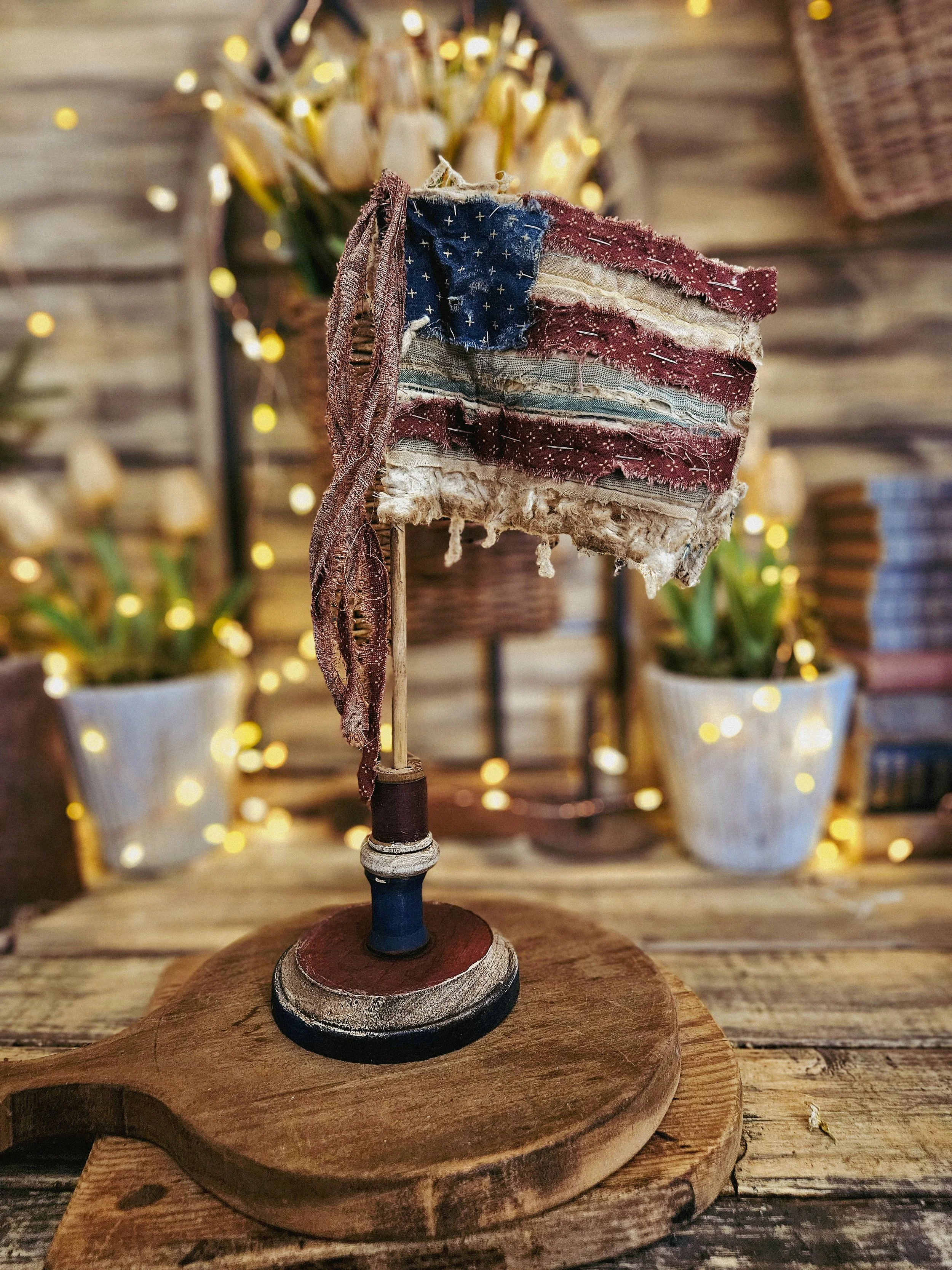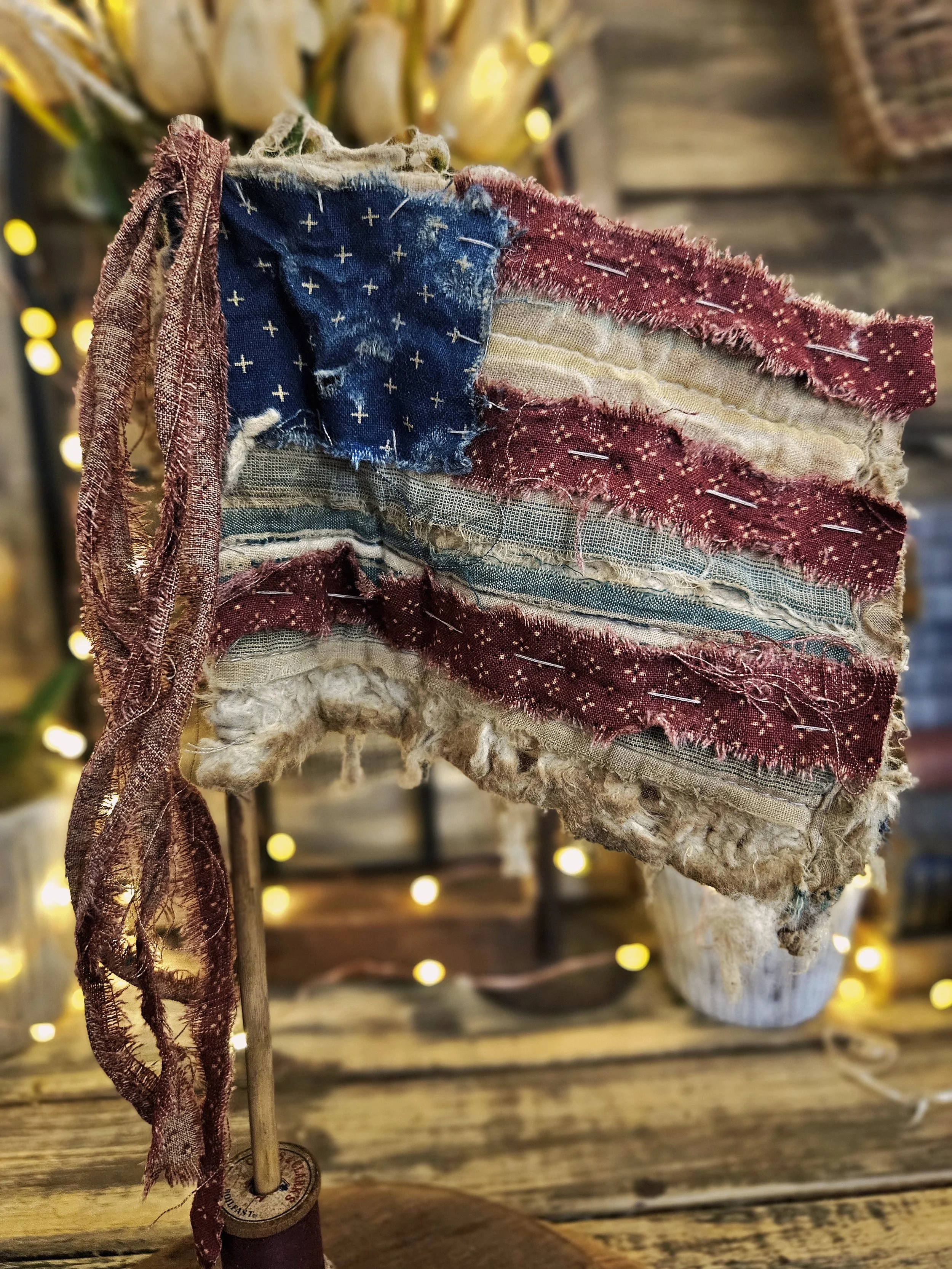 This Flag is completely hand stitched and made from an old vintage quilt. The base is handmade and hand painted