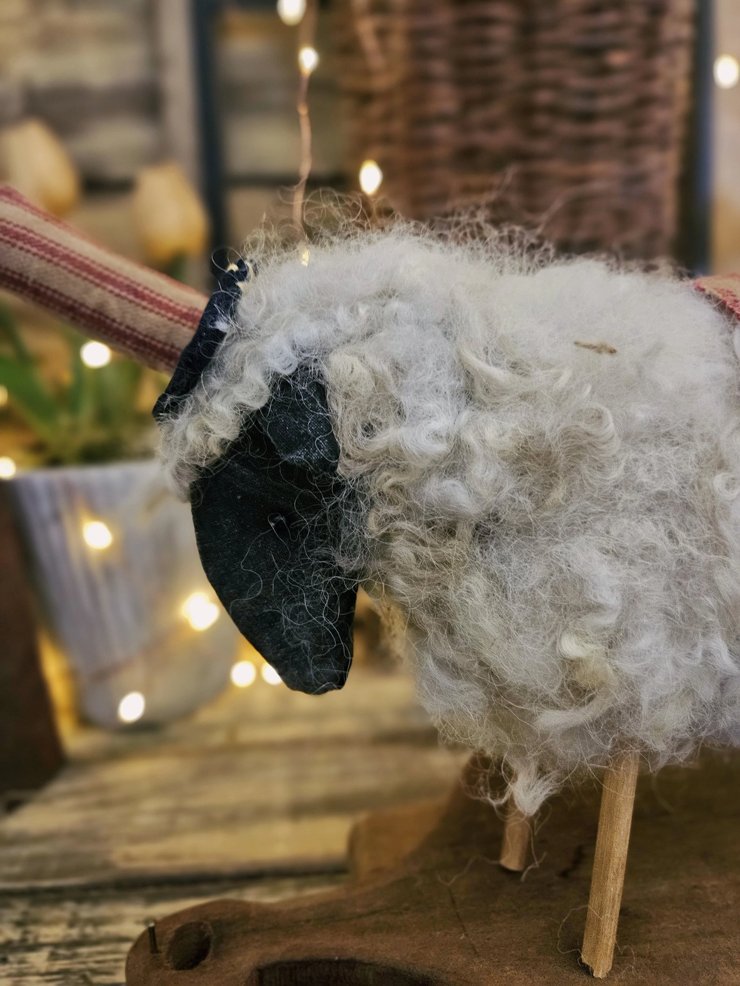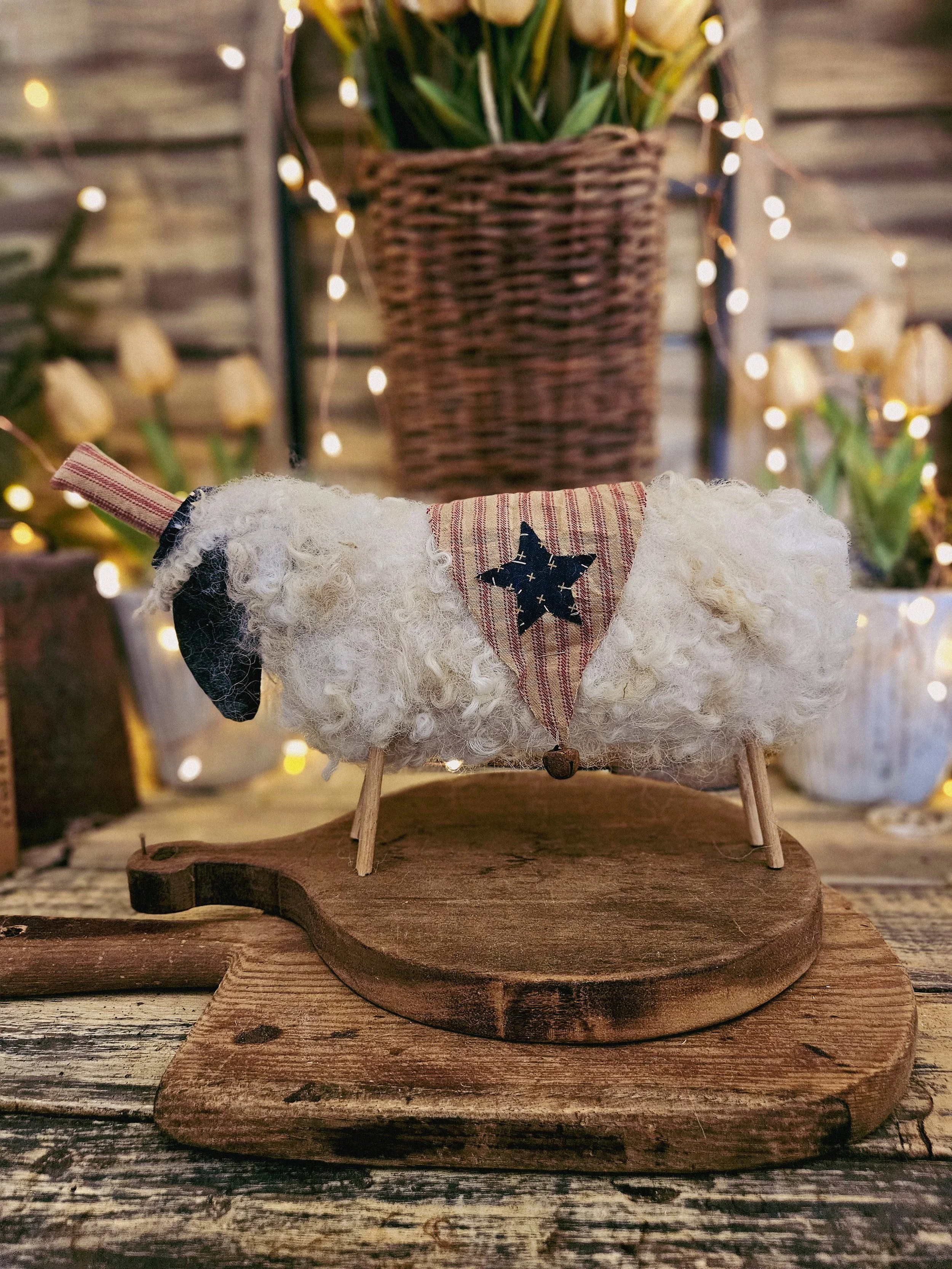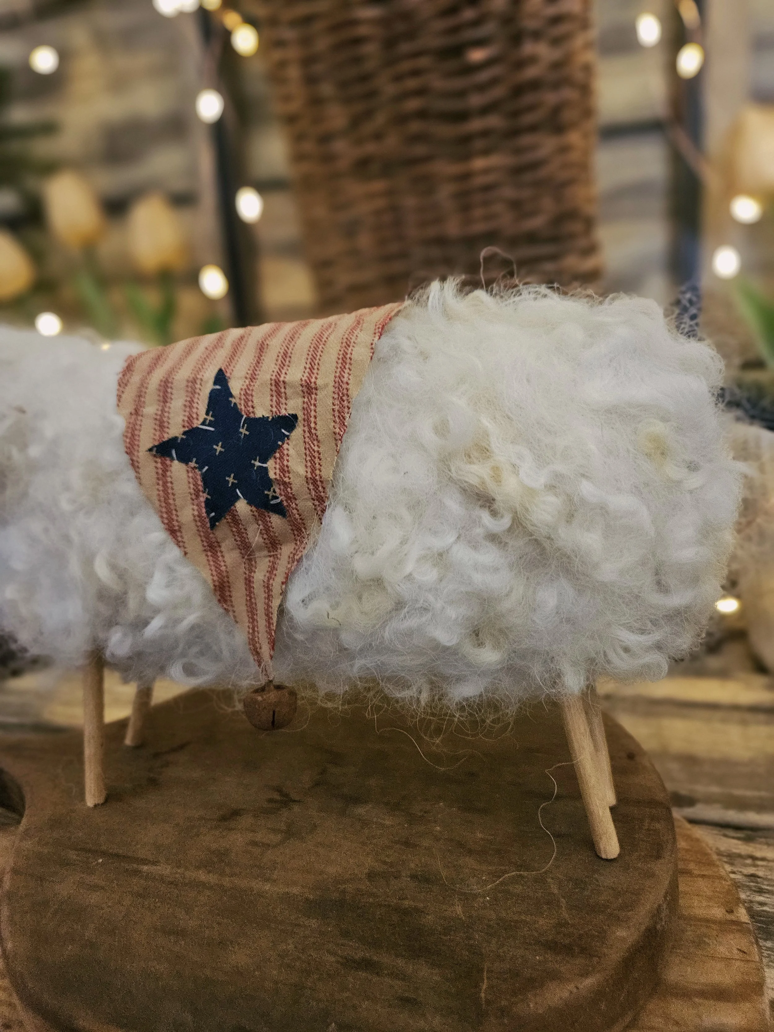 Made from real wool, He wears an Americana blanket on his back with some rusty bells along with a cute top hat