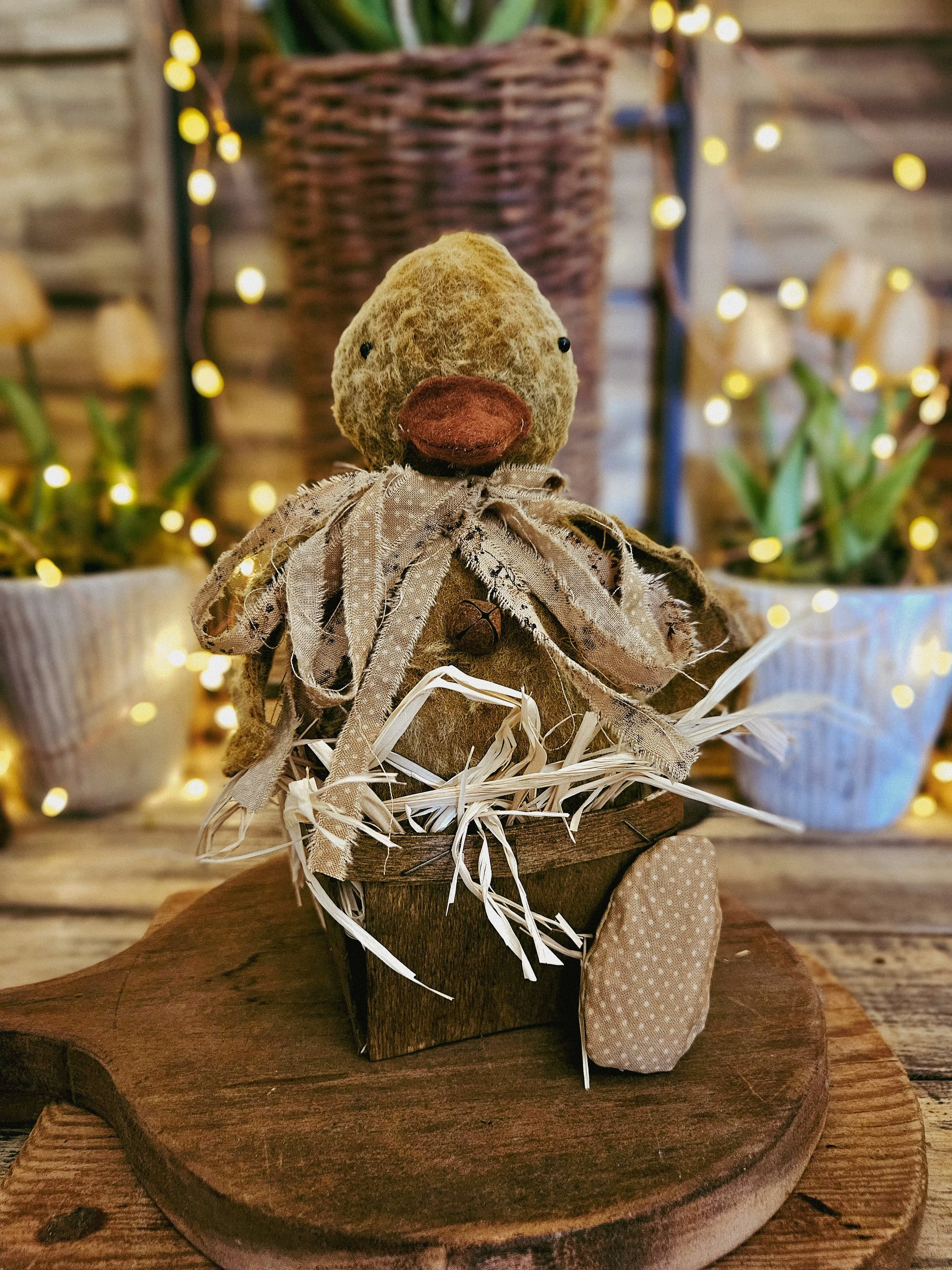 Shop › Pippin Duckling #2 Pippin Duckling #2 $55.00 sold out Pippin measures about 8” tall and sits inside and aged wooden berry basket. He comes with a small polka dot egg Pippin measures about 8” tall and sits inside and aged wooden berry basket. He comes with a small polka dot egg Get notified by email when this product is in stock. Sold Out Added!