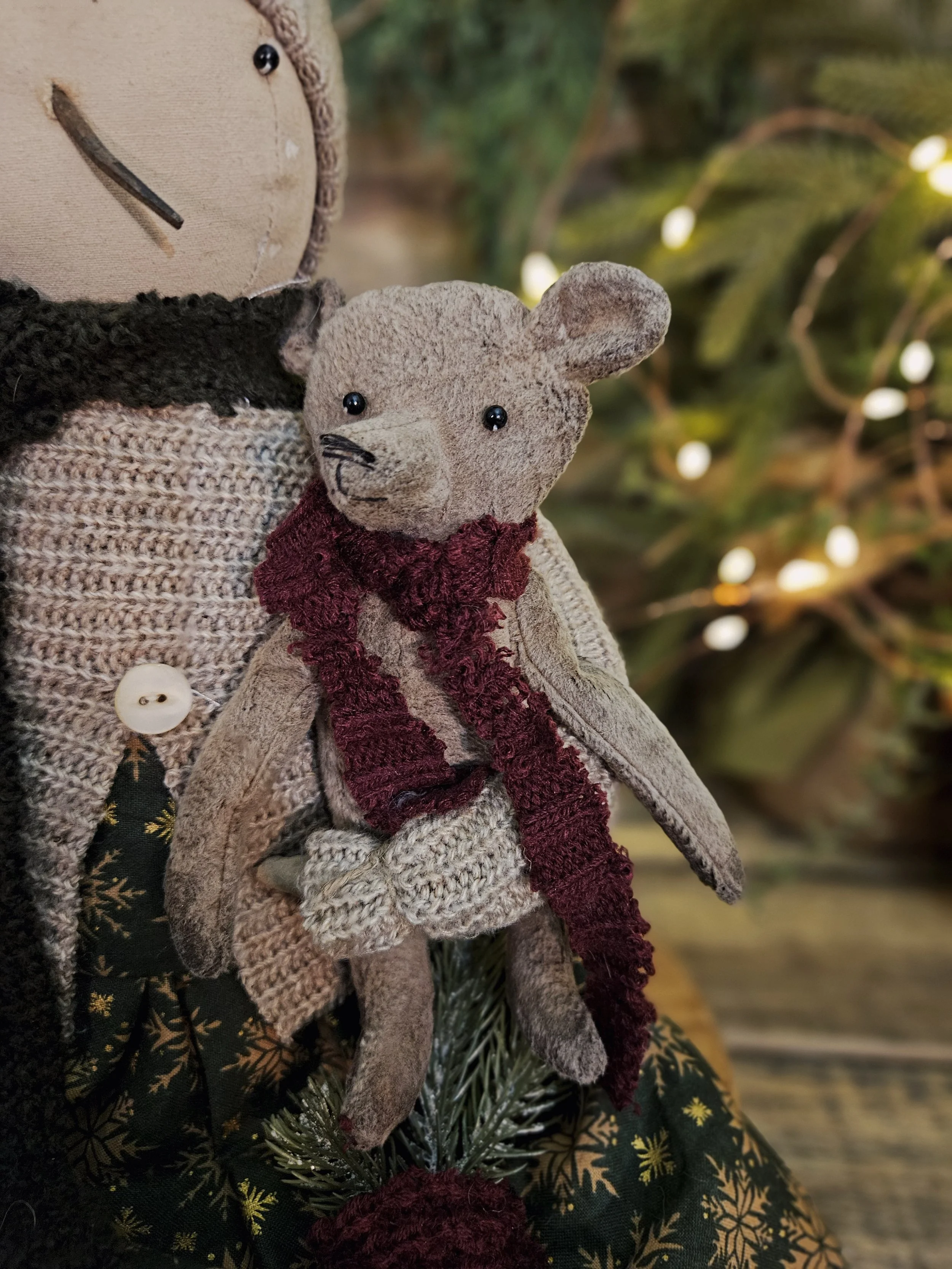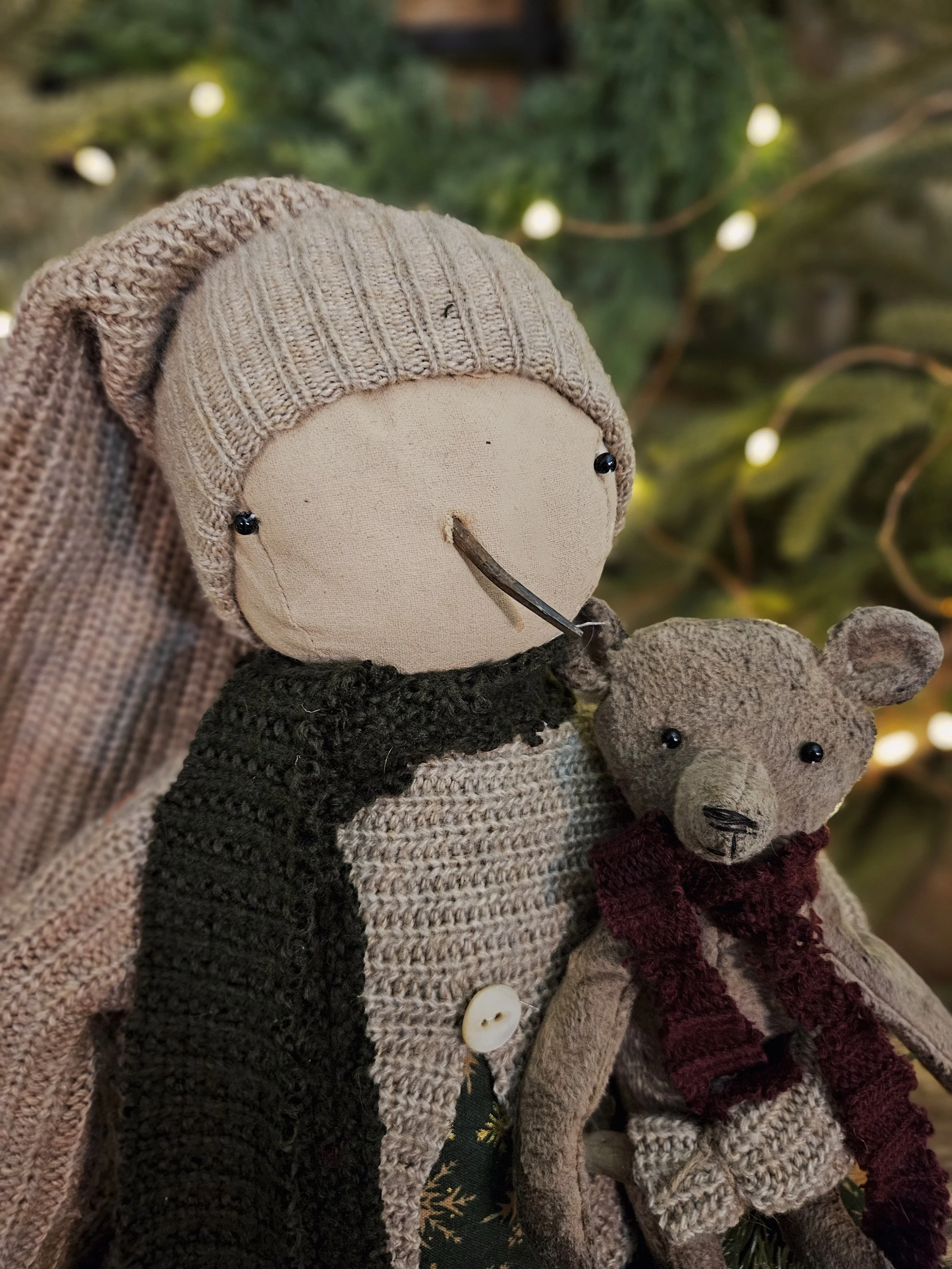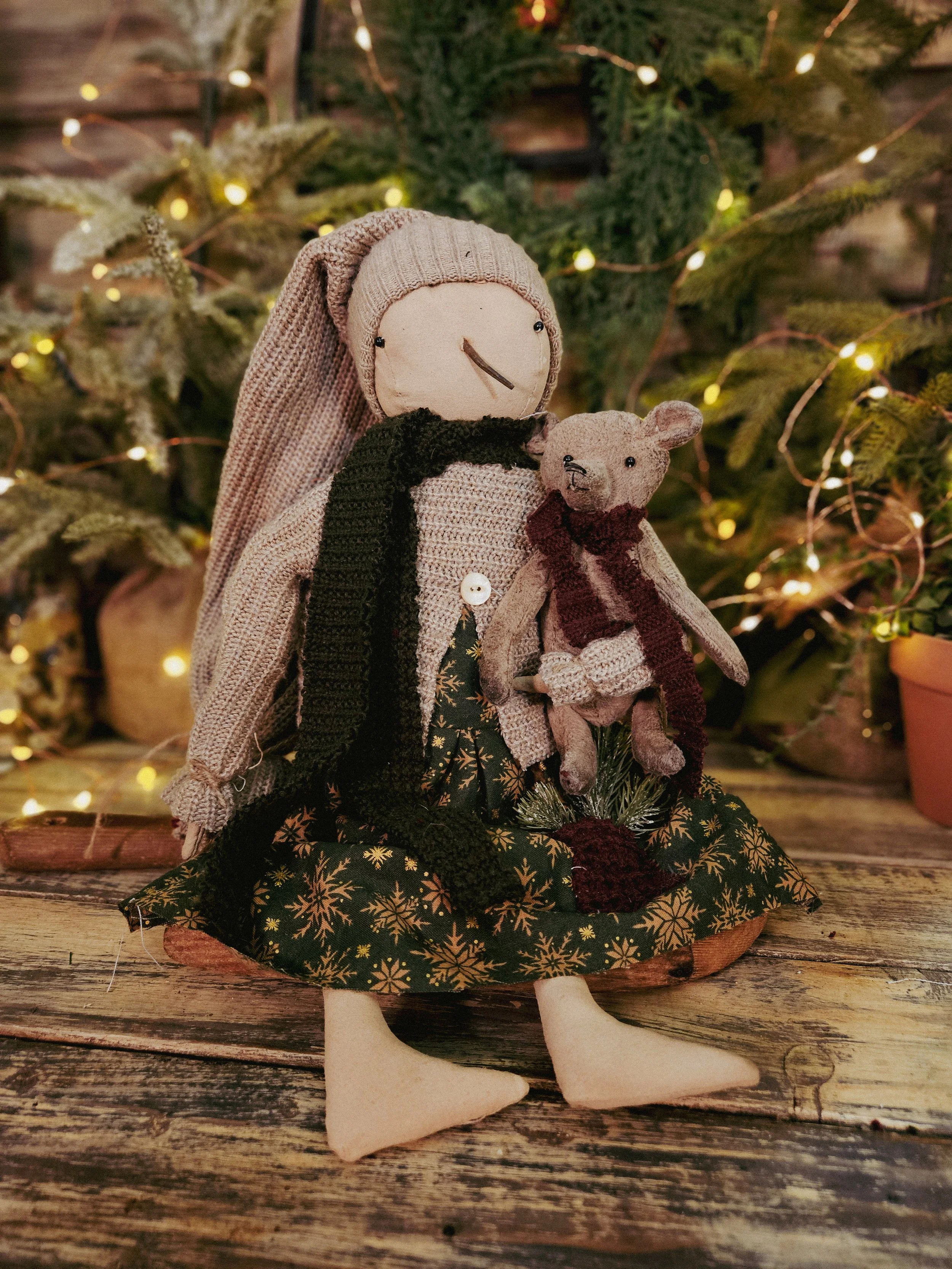This sweet snowgirl measures about 17” tall, can hang or sit. She wears a dress along with a sweater and hat. She has a rusty nail nose. Her little dress pocket holds some faux greens