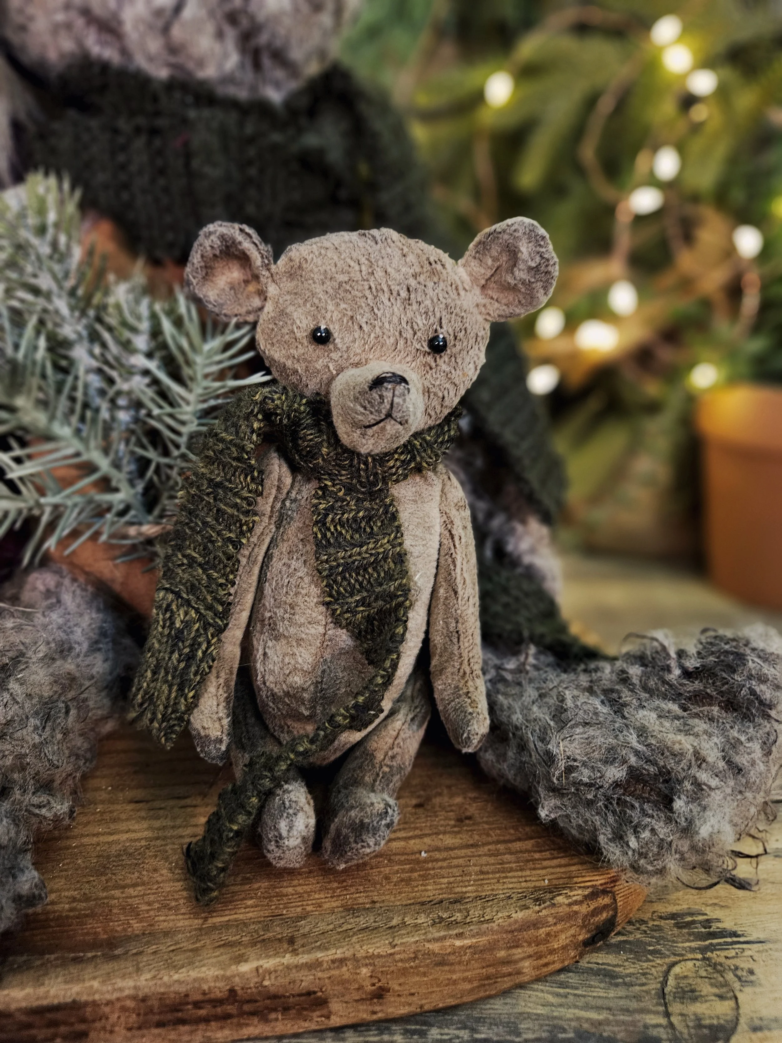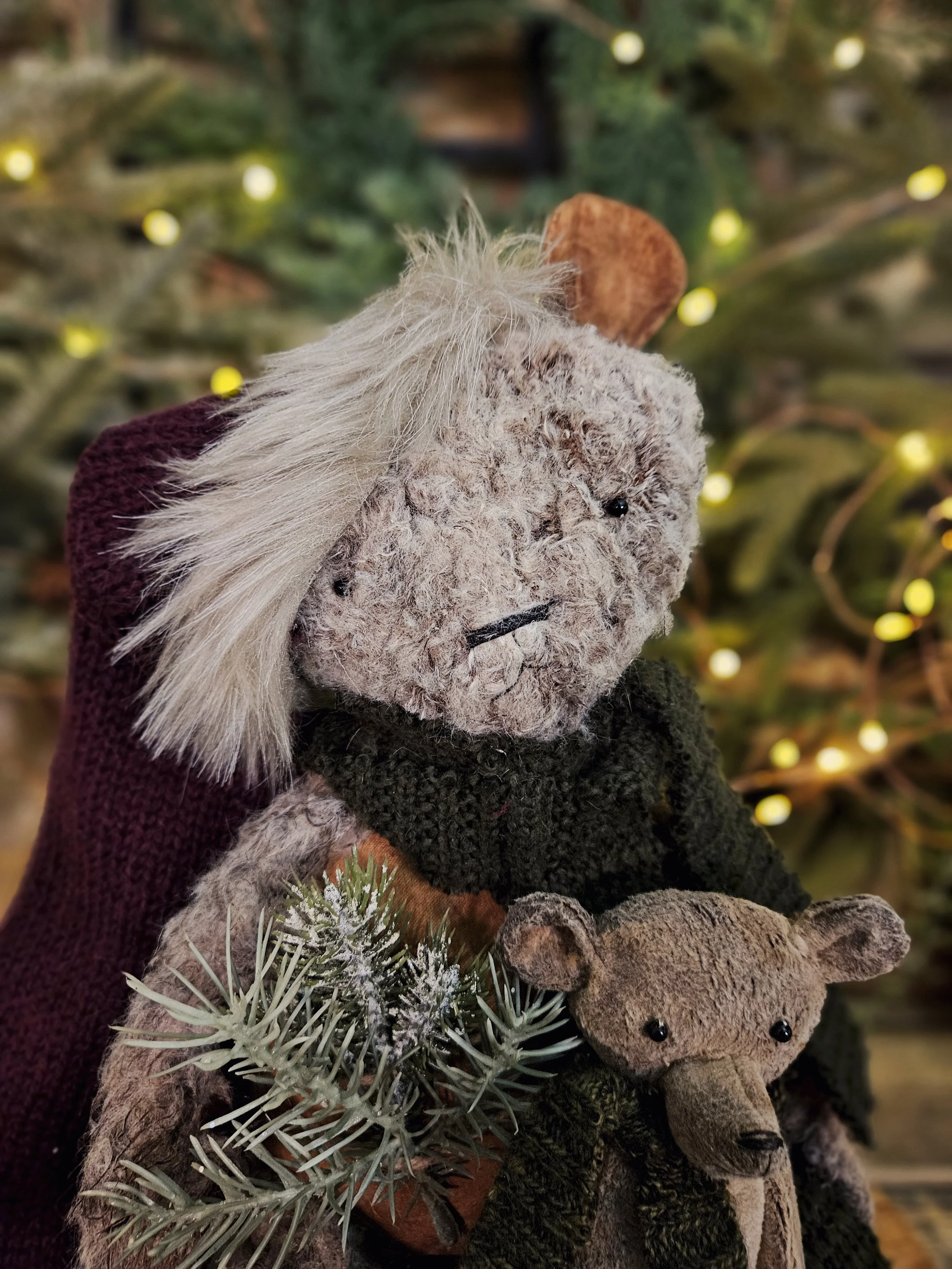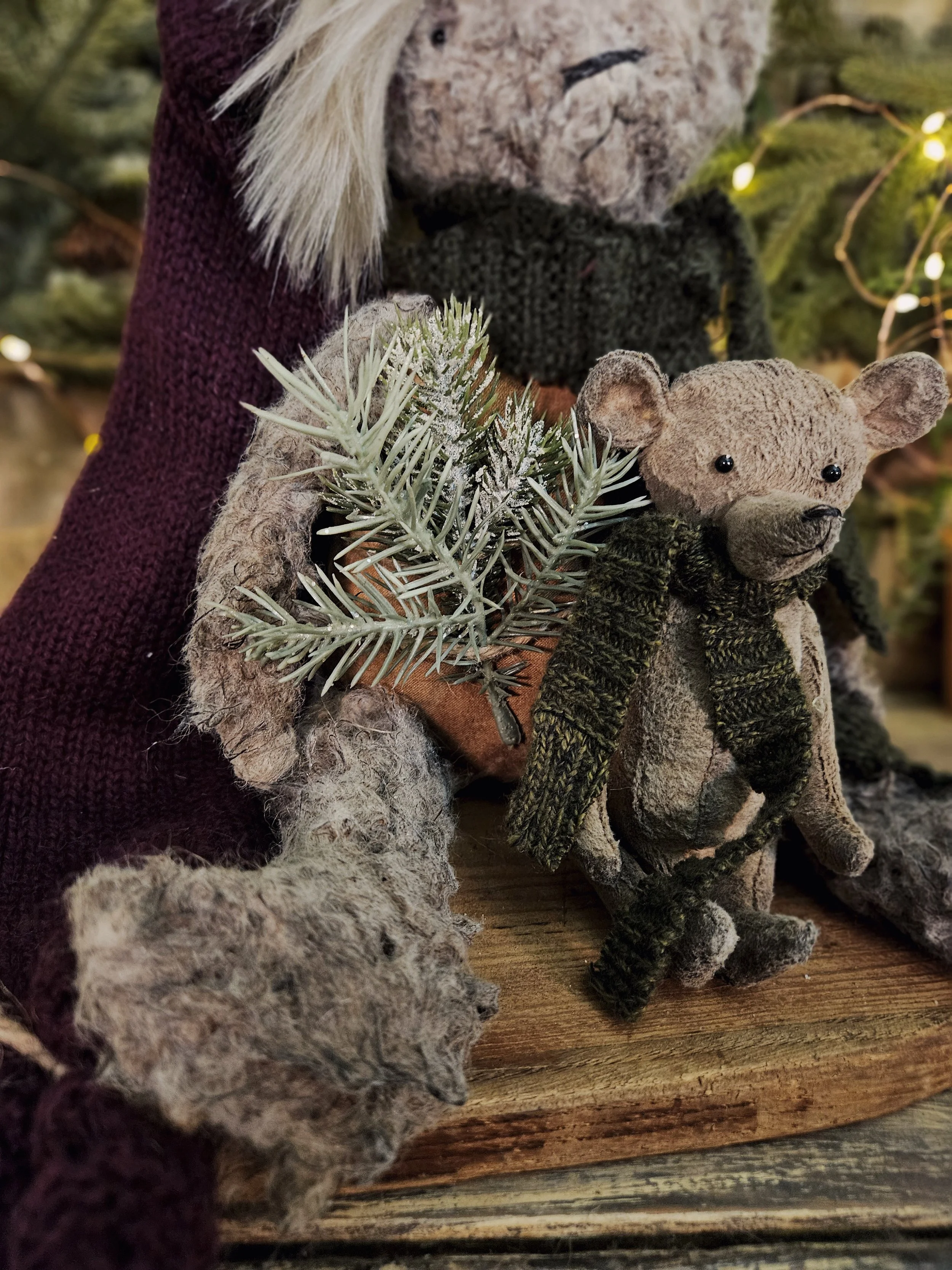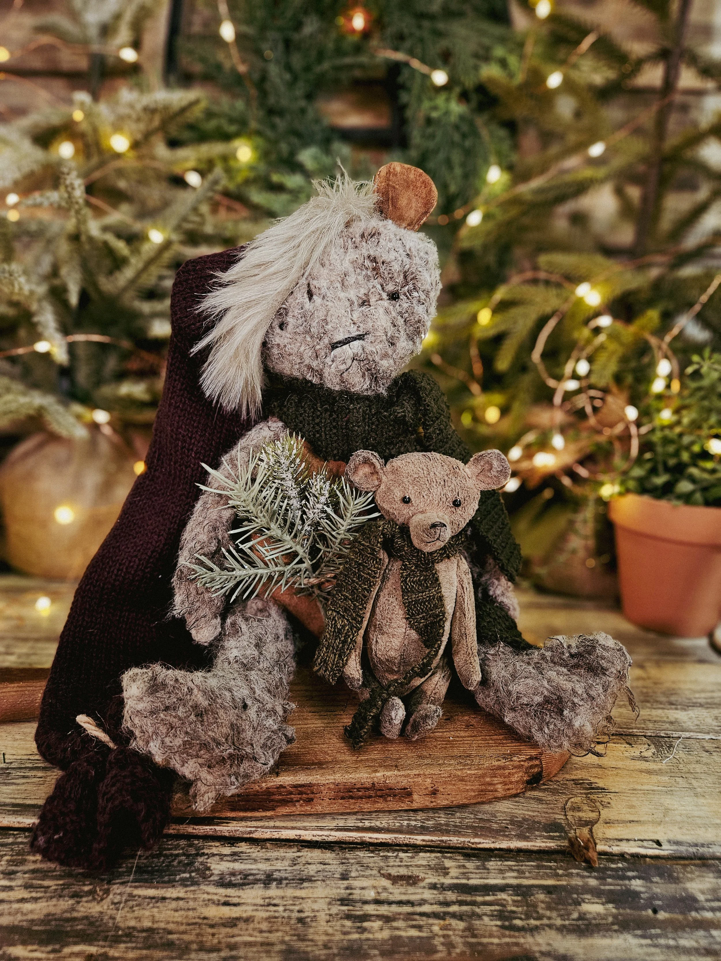 This tattered bear has a weighted bottom and measures approx. 12” sitting. He is made from an aged plush material. Wears a knit hat and scarf. He holds a bundle of faux greens and comes with a mini baby bear.