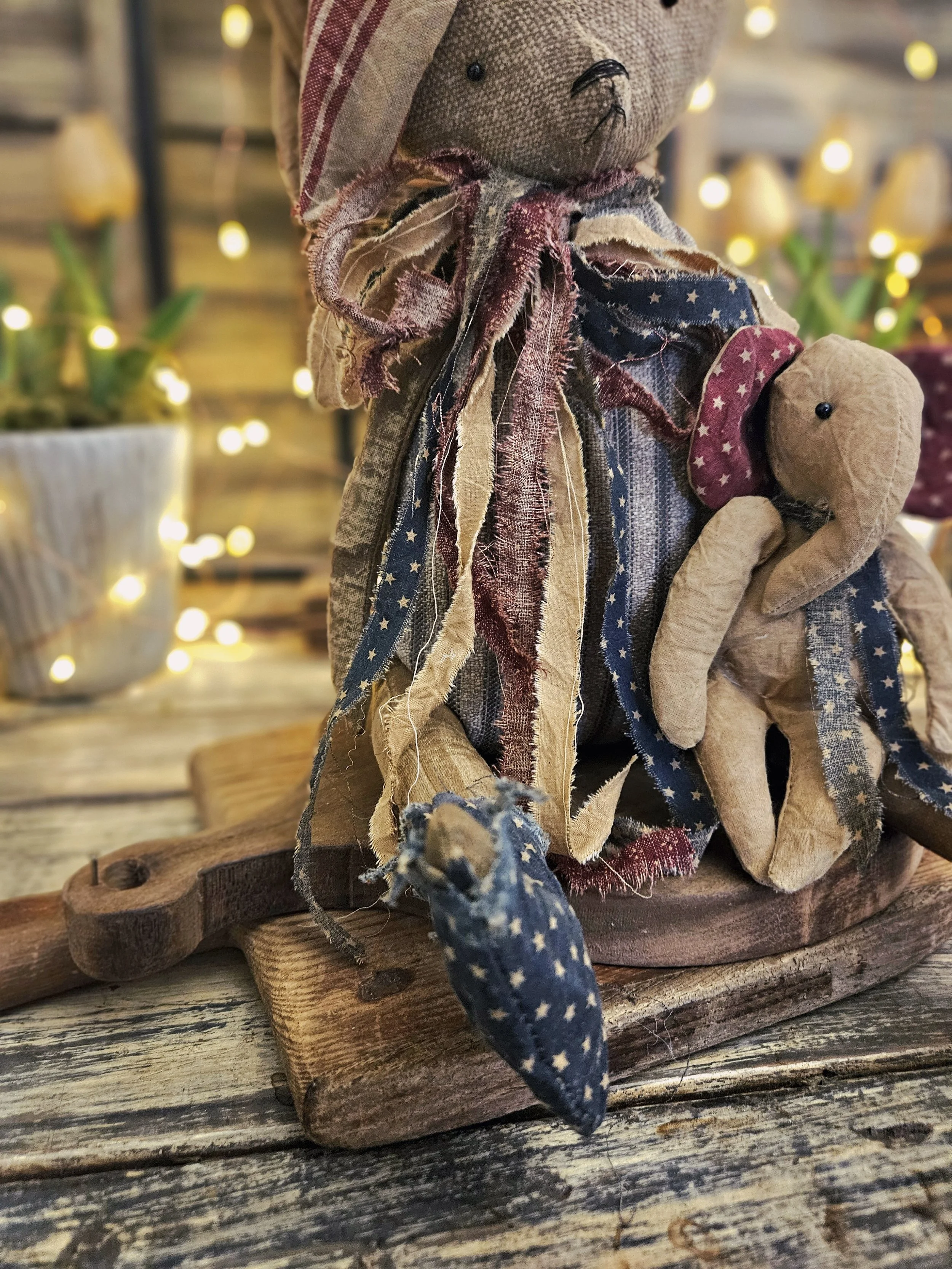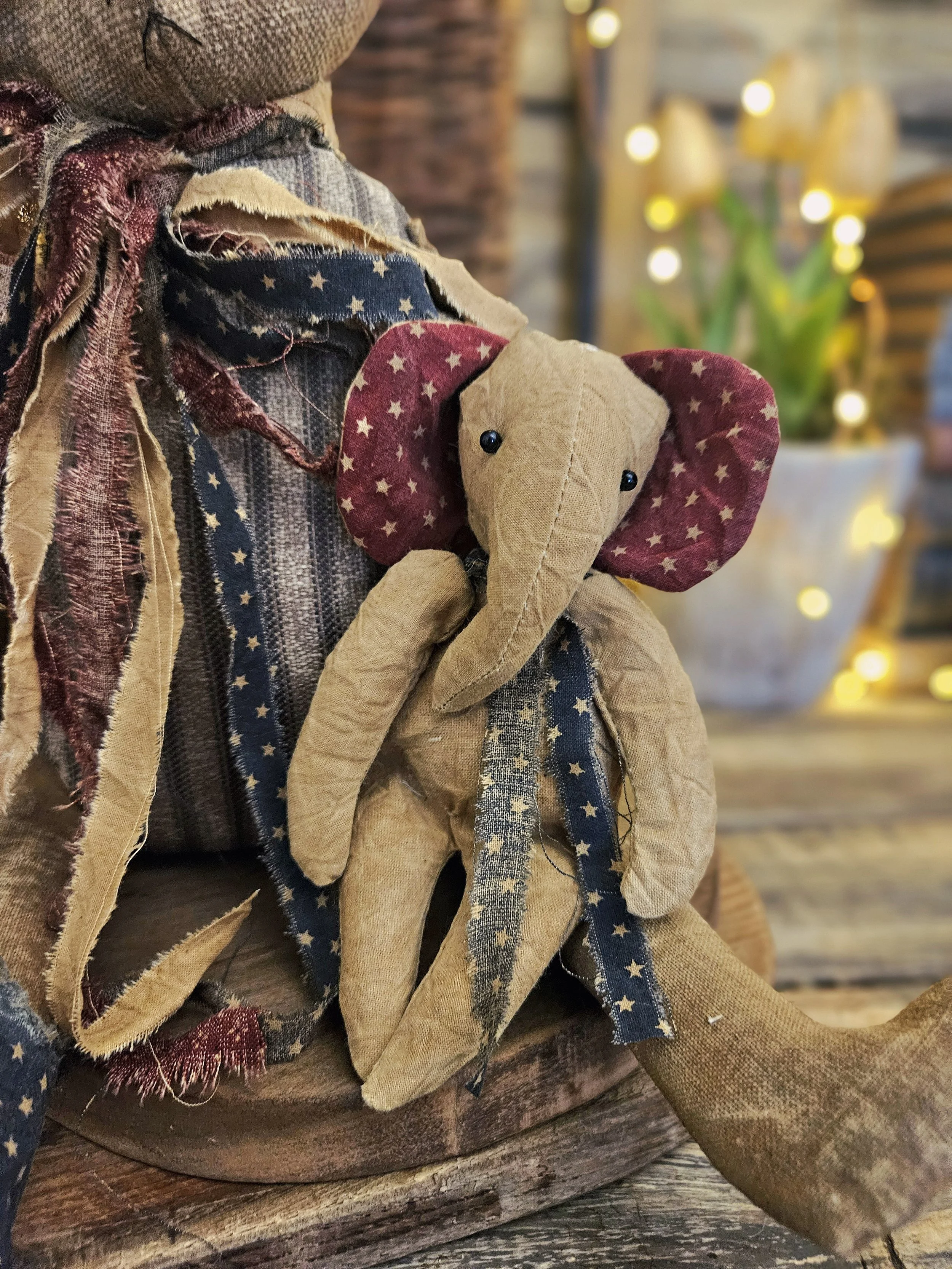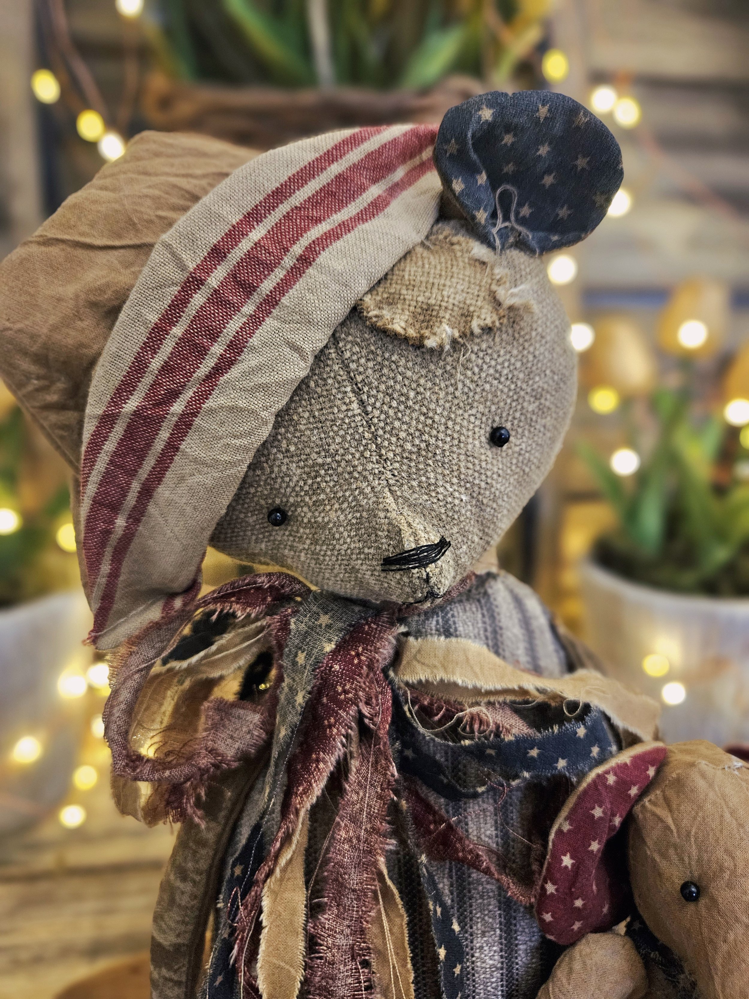 This tattered bear is rag stuffed with a weighted bottom and measures approx. 12” sitting. He is made from an aged grain sack material. He wears an aged red white and blue Americana bow around his neck along with a handmade sailor hat on his head. He holds a mini elephant