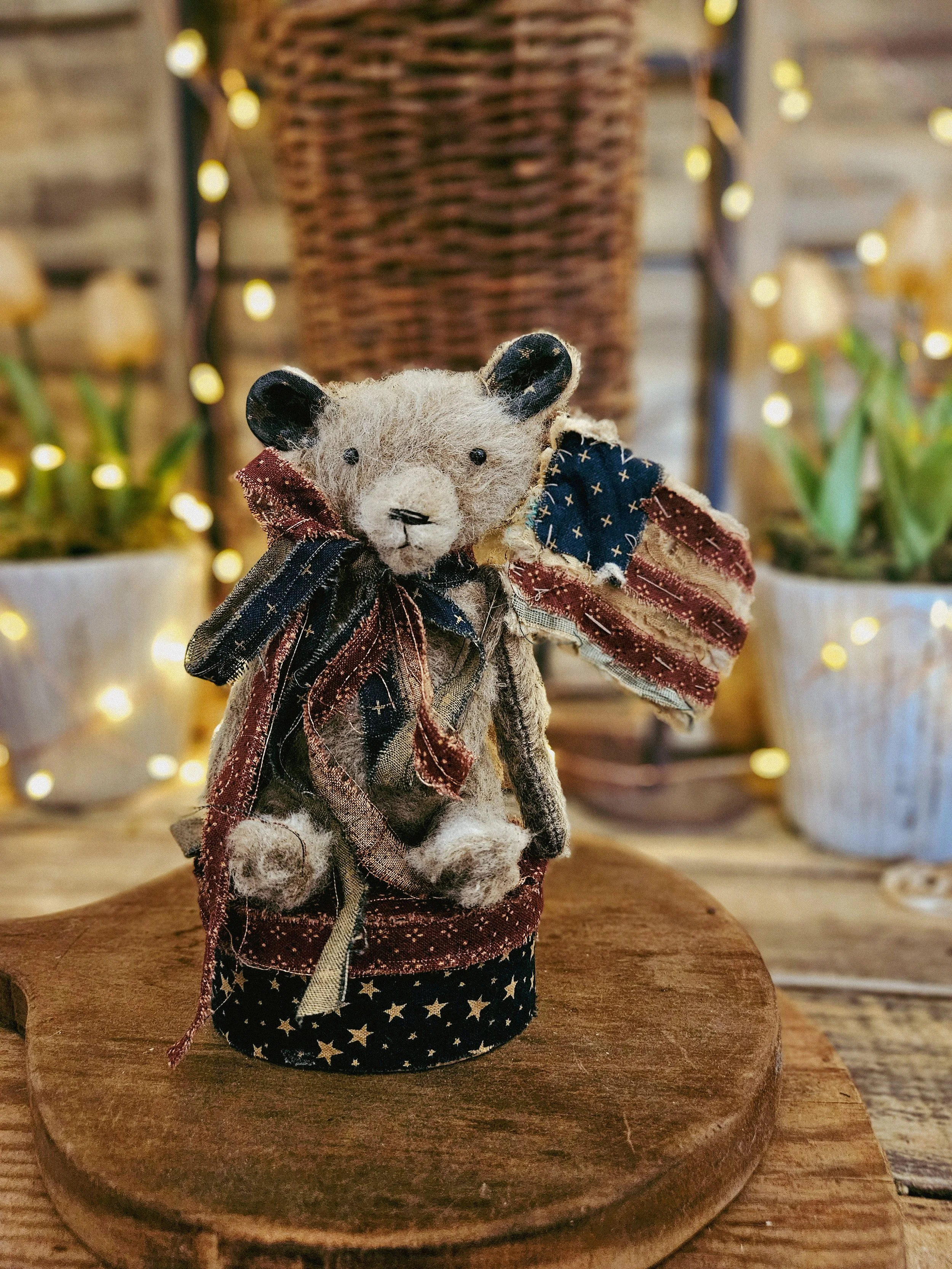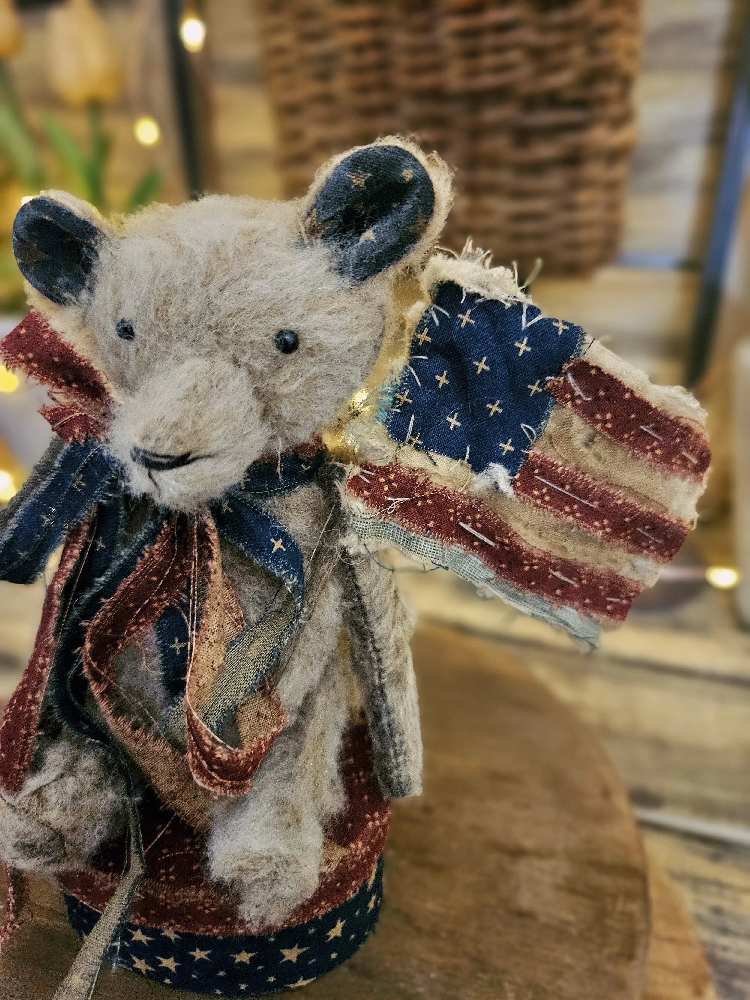 This Americana display includes one of my smaller tattered bears along with a fabric covered pantry box for him to sit on. He holds a handmade vintage quilt flag.