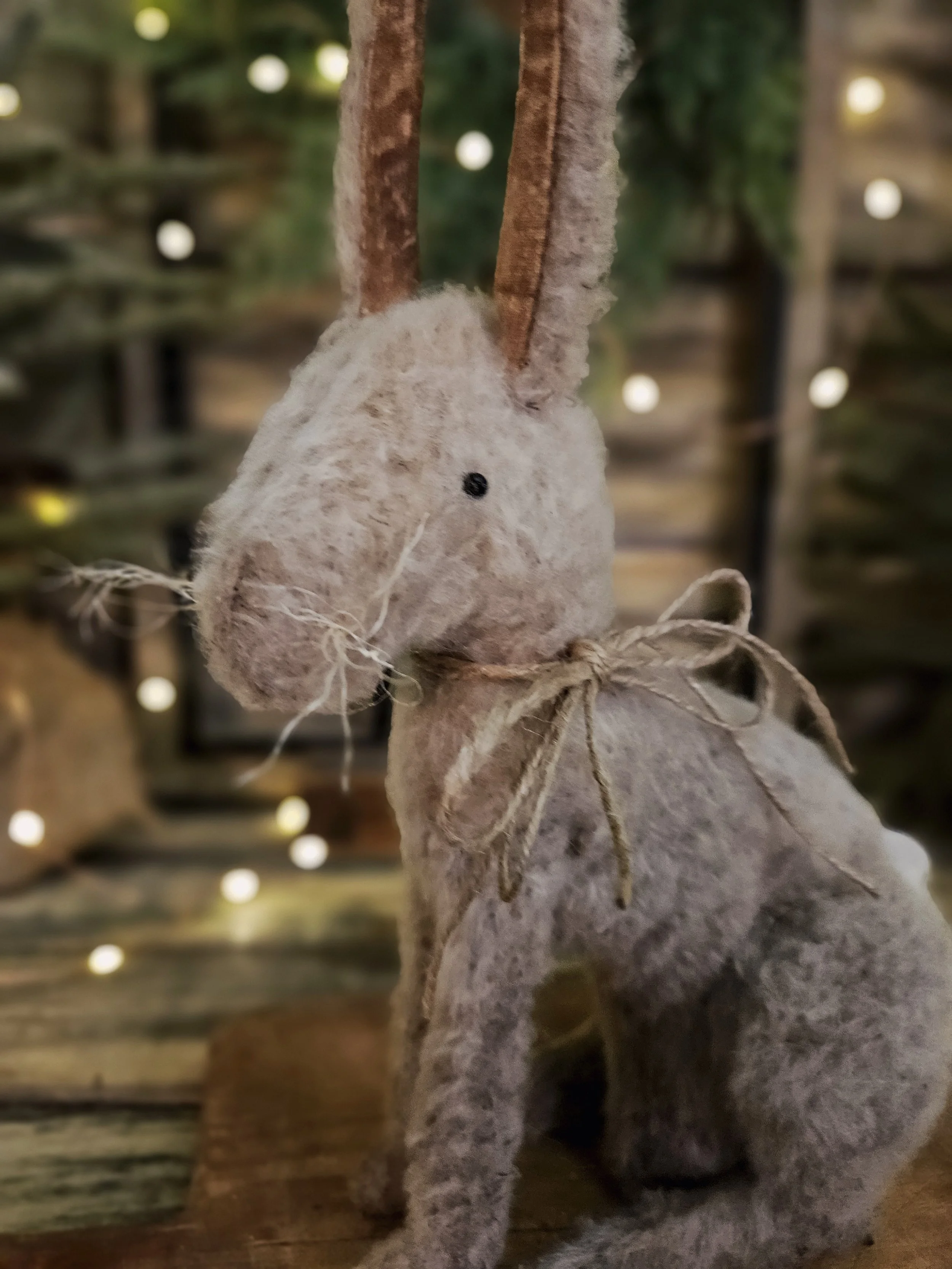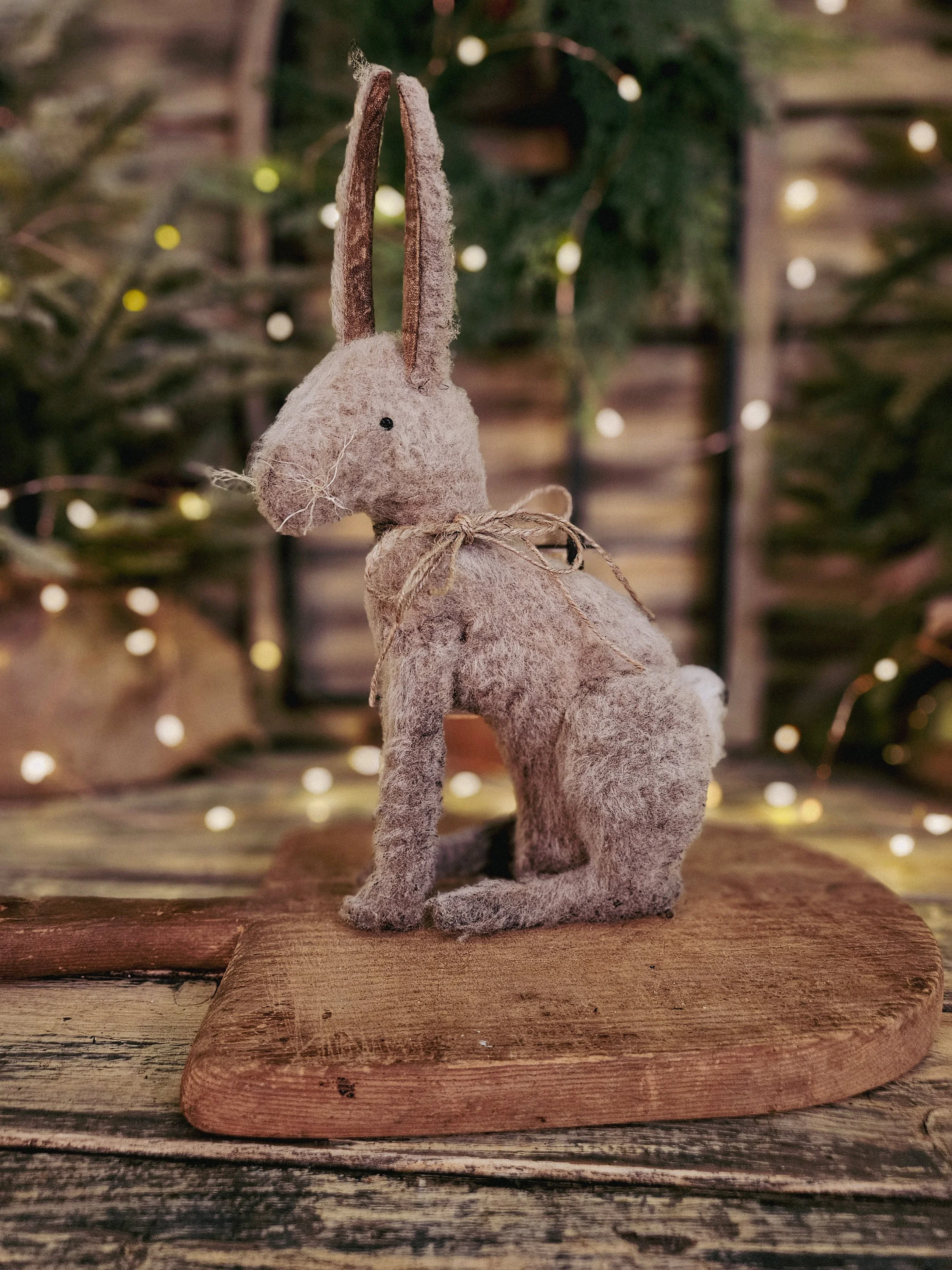 This Primitive Bunny is form aged tattered plush felt fabric He measures 10 1/2" tall to the tips of his ears. He is rag stuffed and a weighted.