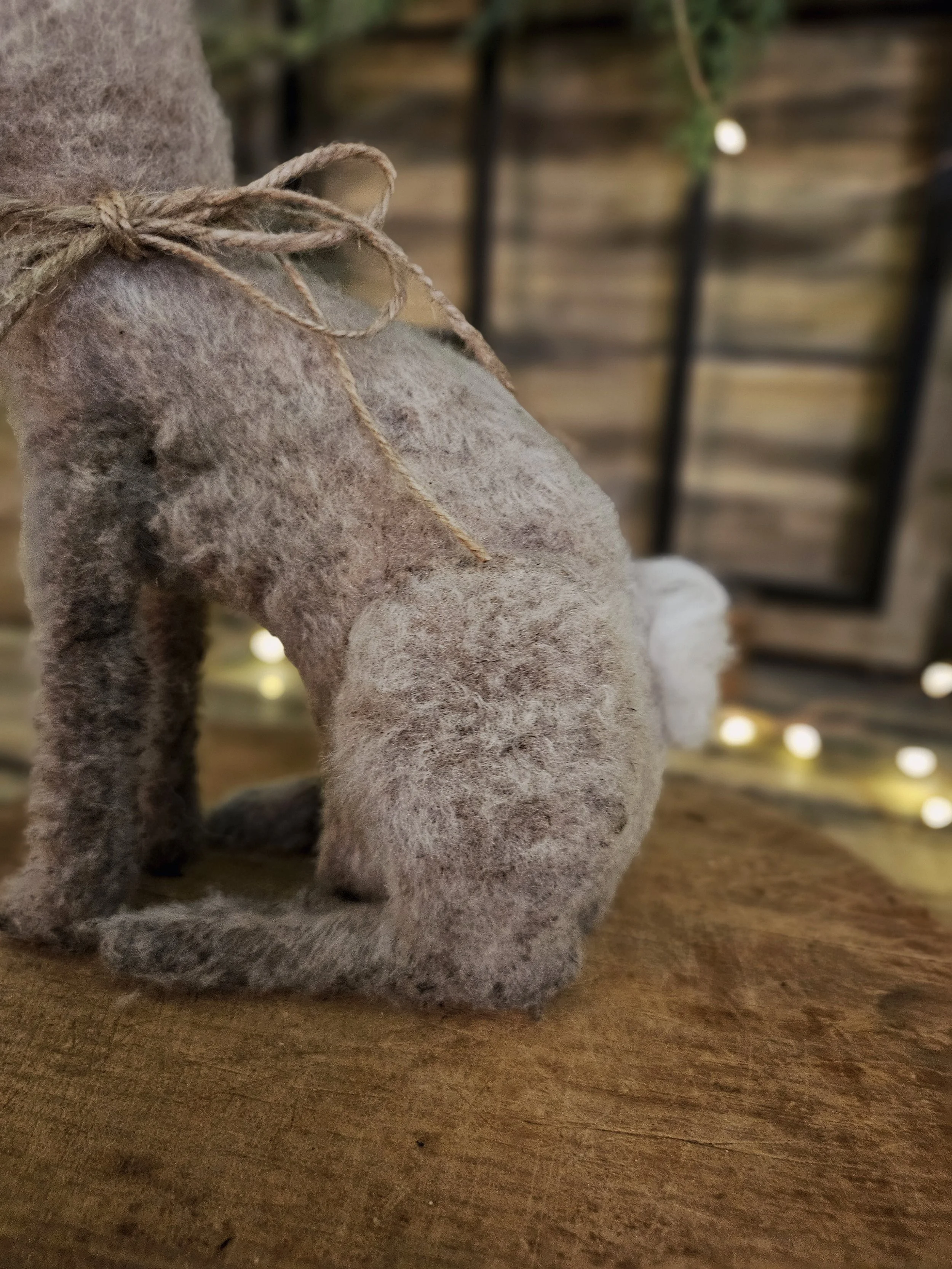 He has real glass bead eyes and sisal whiskers with a real wool tail.