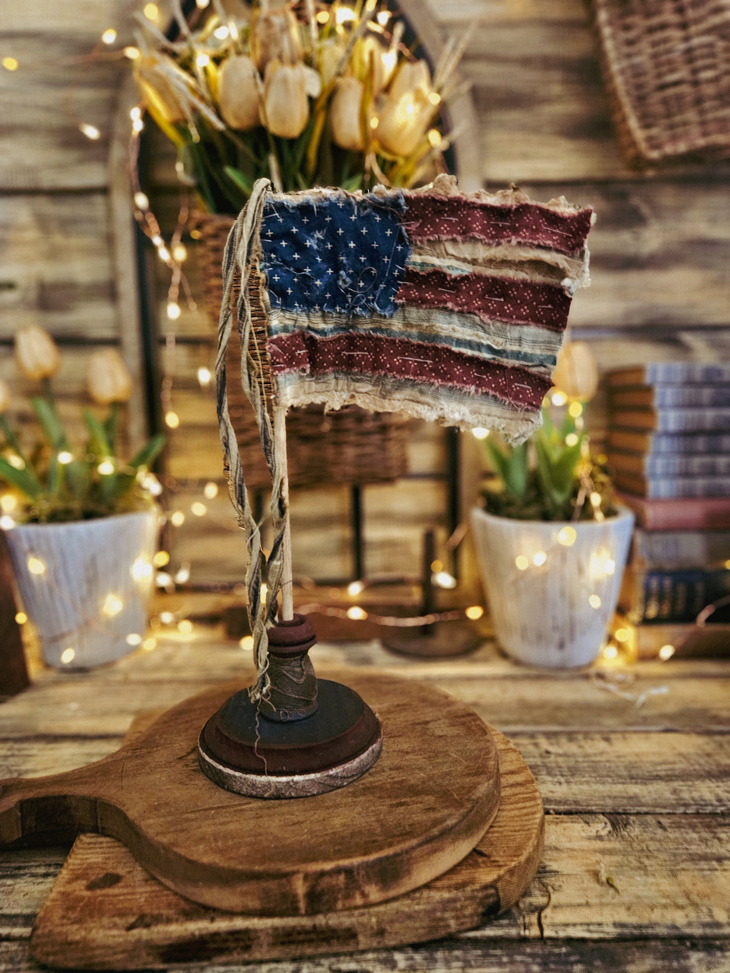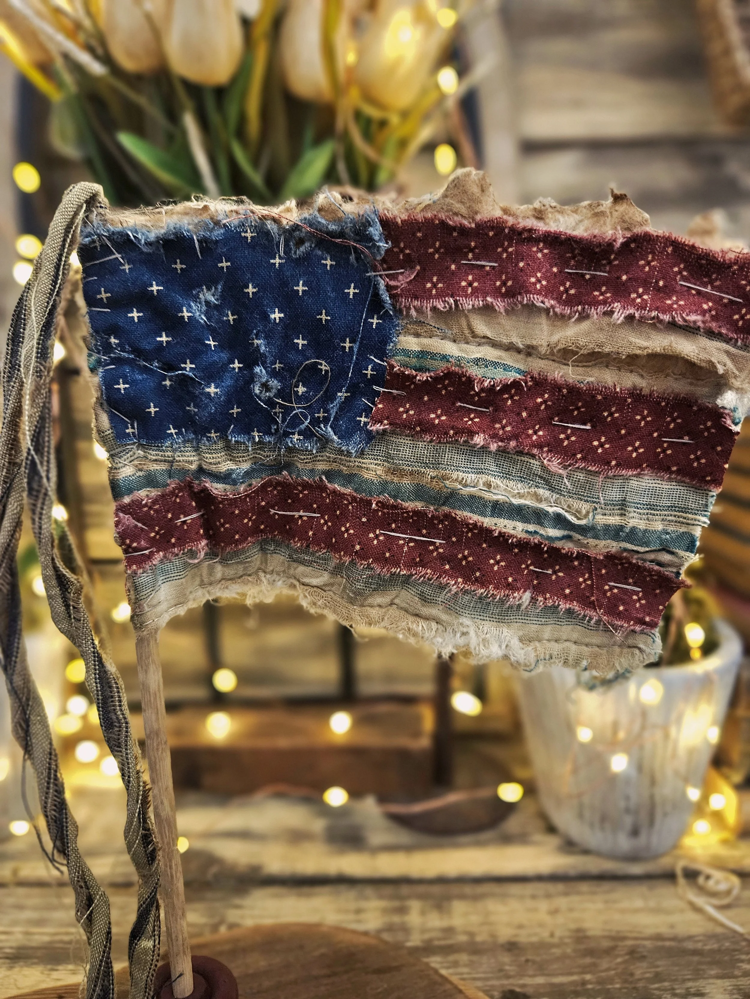 This Flag is completely hand stitched and made from an old vintage quilt. The base is handmade and hand painted