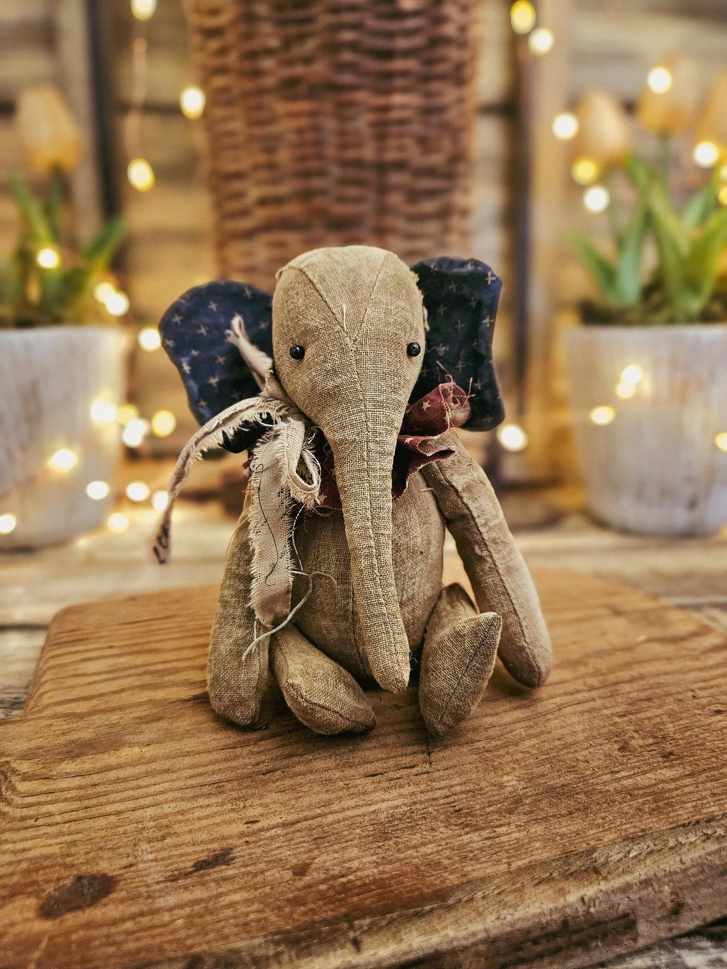This small Americana elephant measures about 6” tall. Made from an aged material with glass bead eyes and an Americana ruffle around his neck. He is weighted.