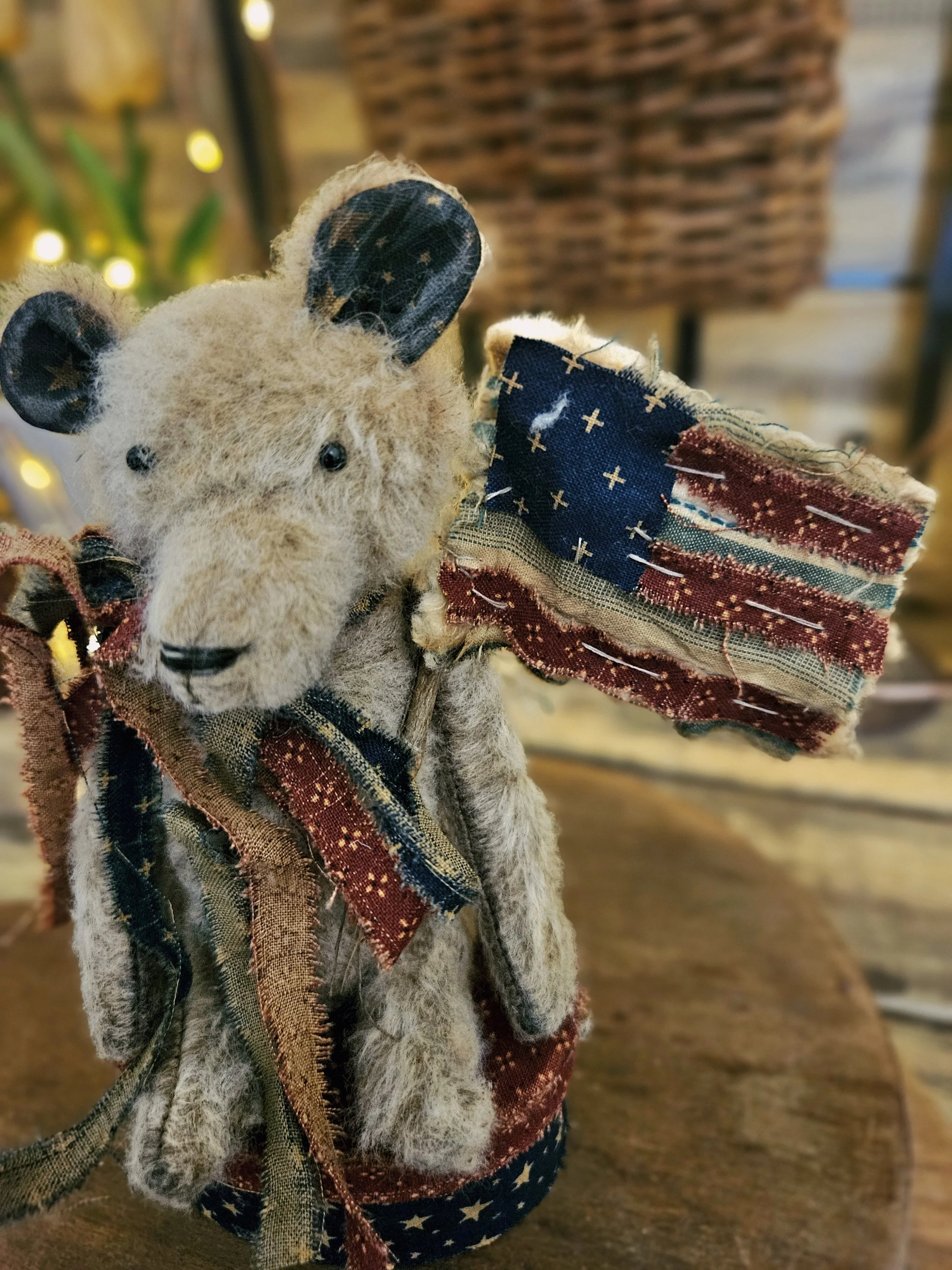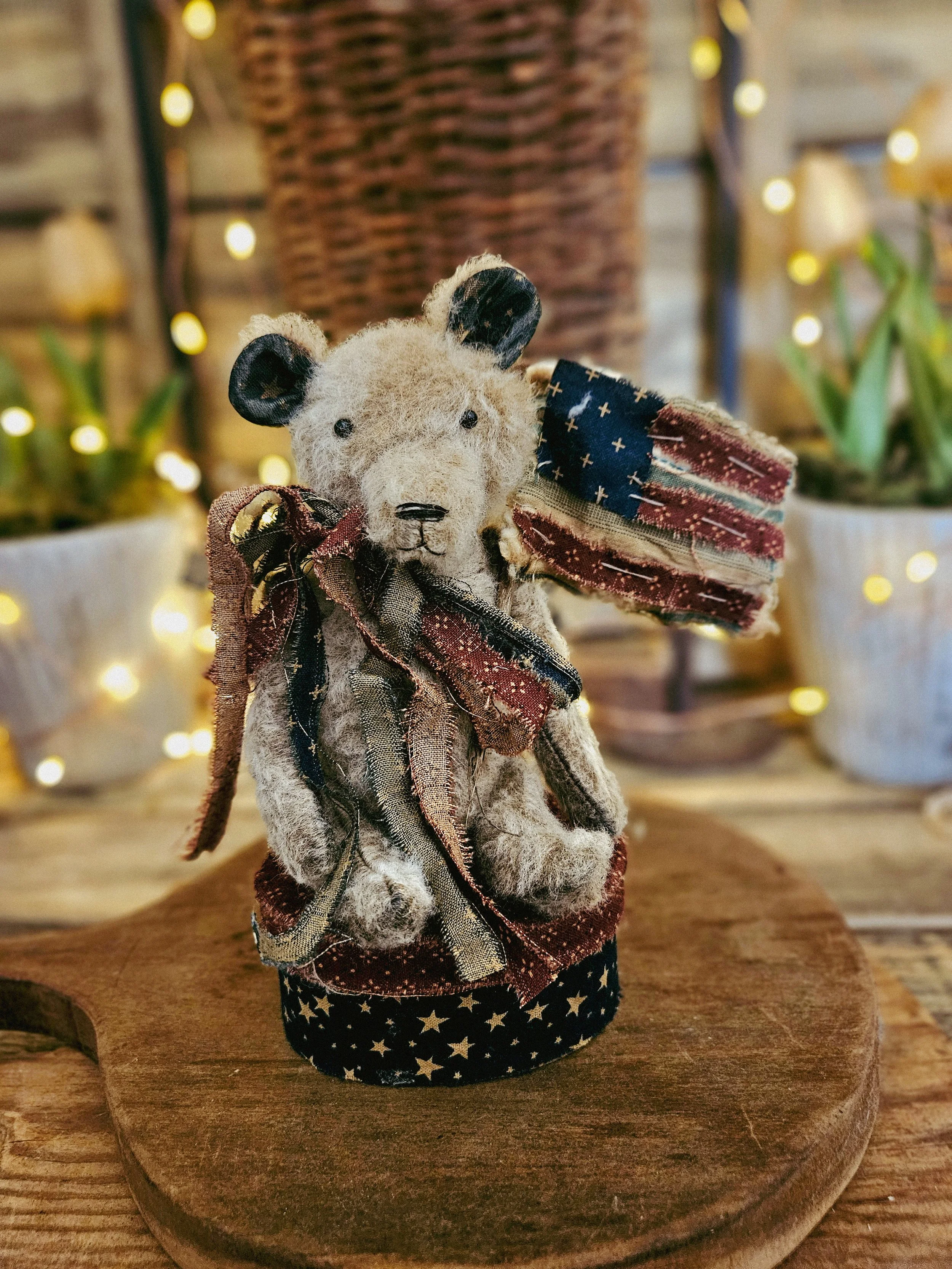 This Americana display includes one of my smaller tattered bears along with a fabric covered pantry box for him to sit on. He holds a handmade vintage quilt flag.