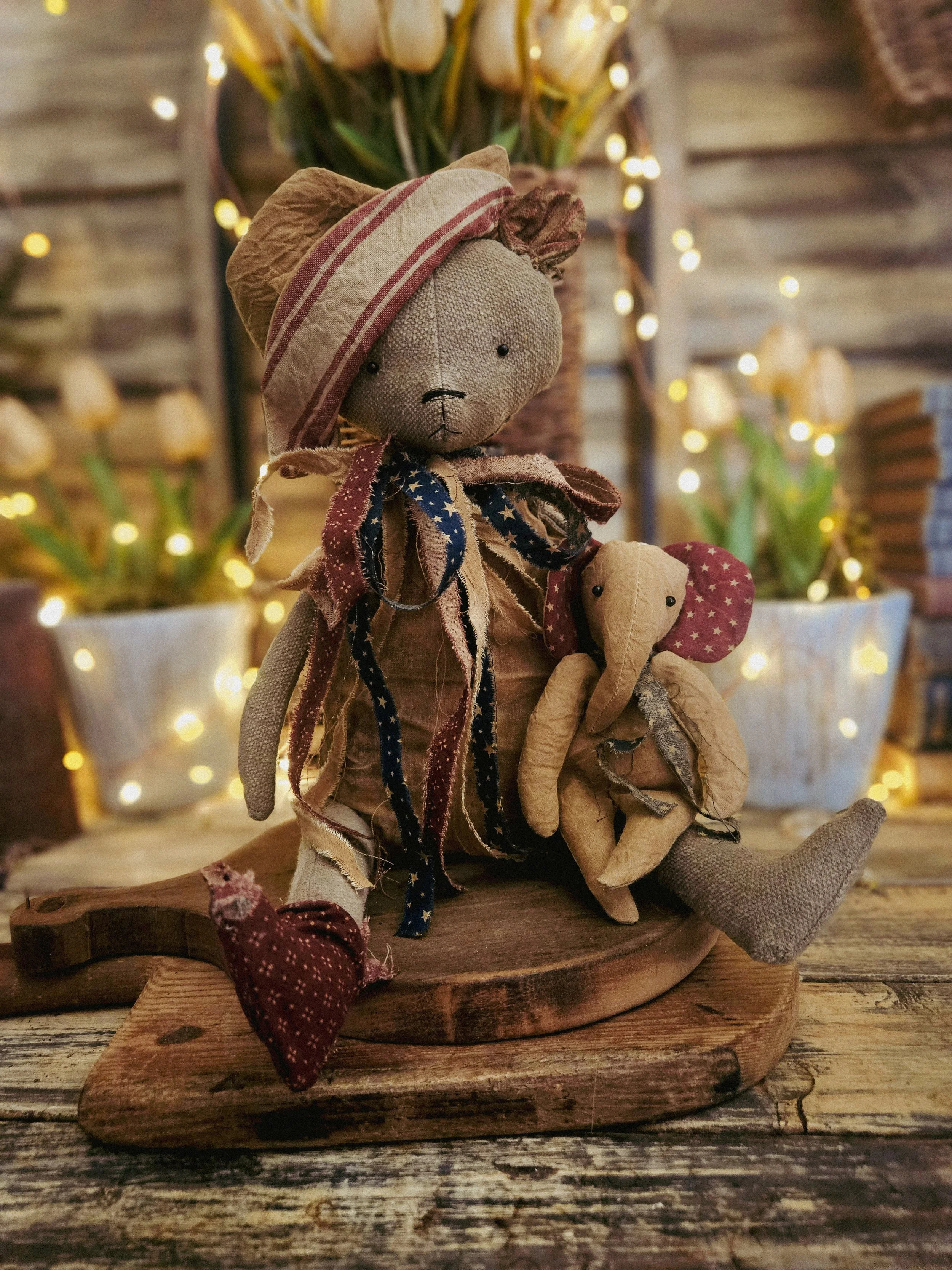 This tattered bear is rag stuffed with a weighted bottom and measures approx. 12” sitting. He is made from an aged grain sack material. He wears an aged red white and blue Americana bow around his neck along with a handmade sailor hat on his head. He holds a mini elephant.
