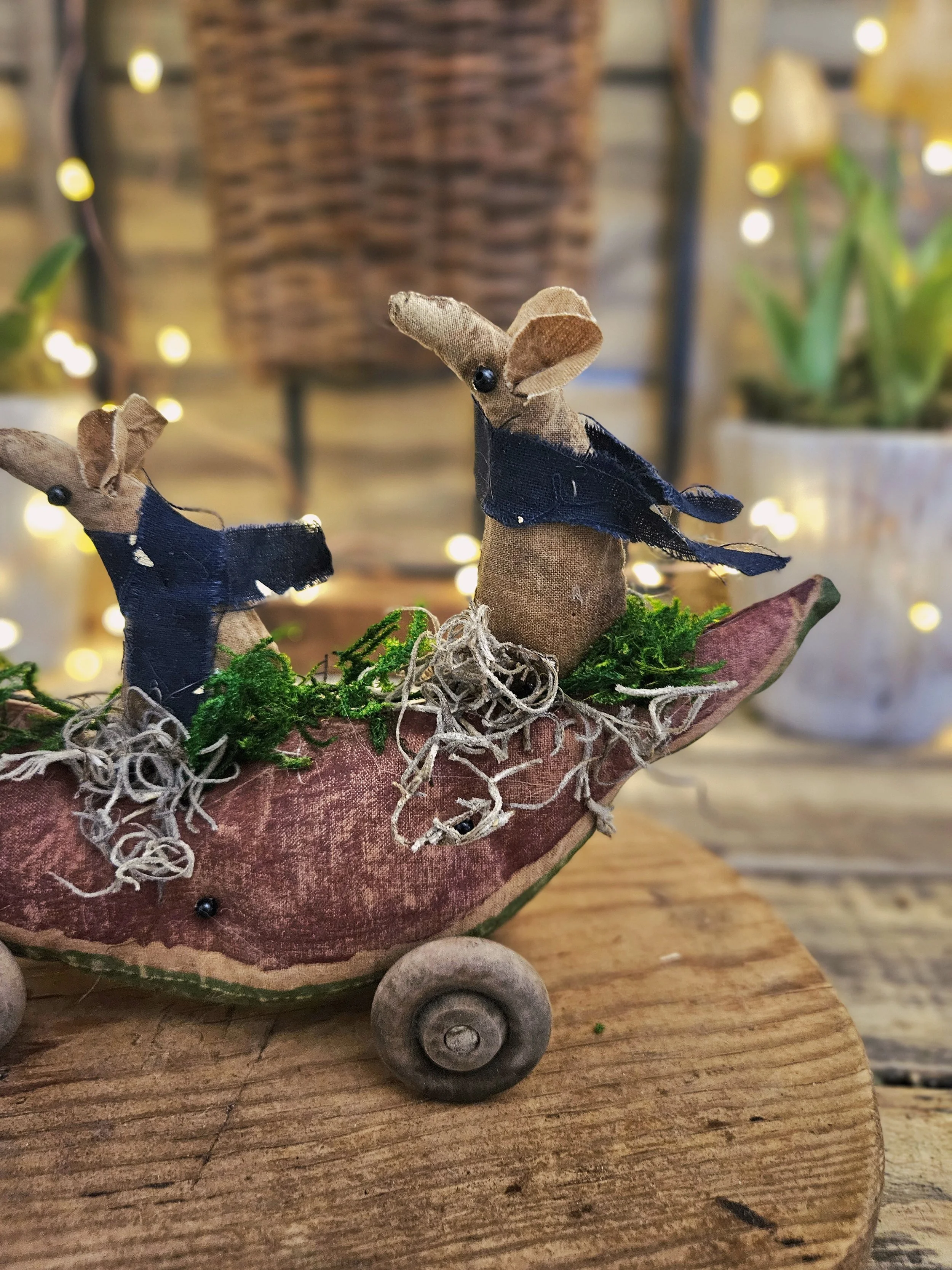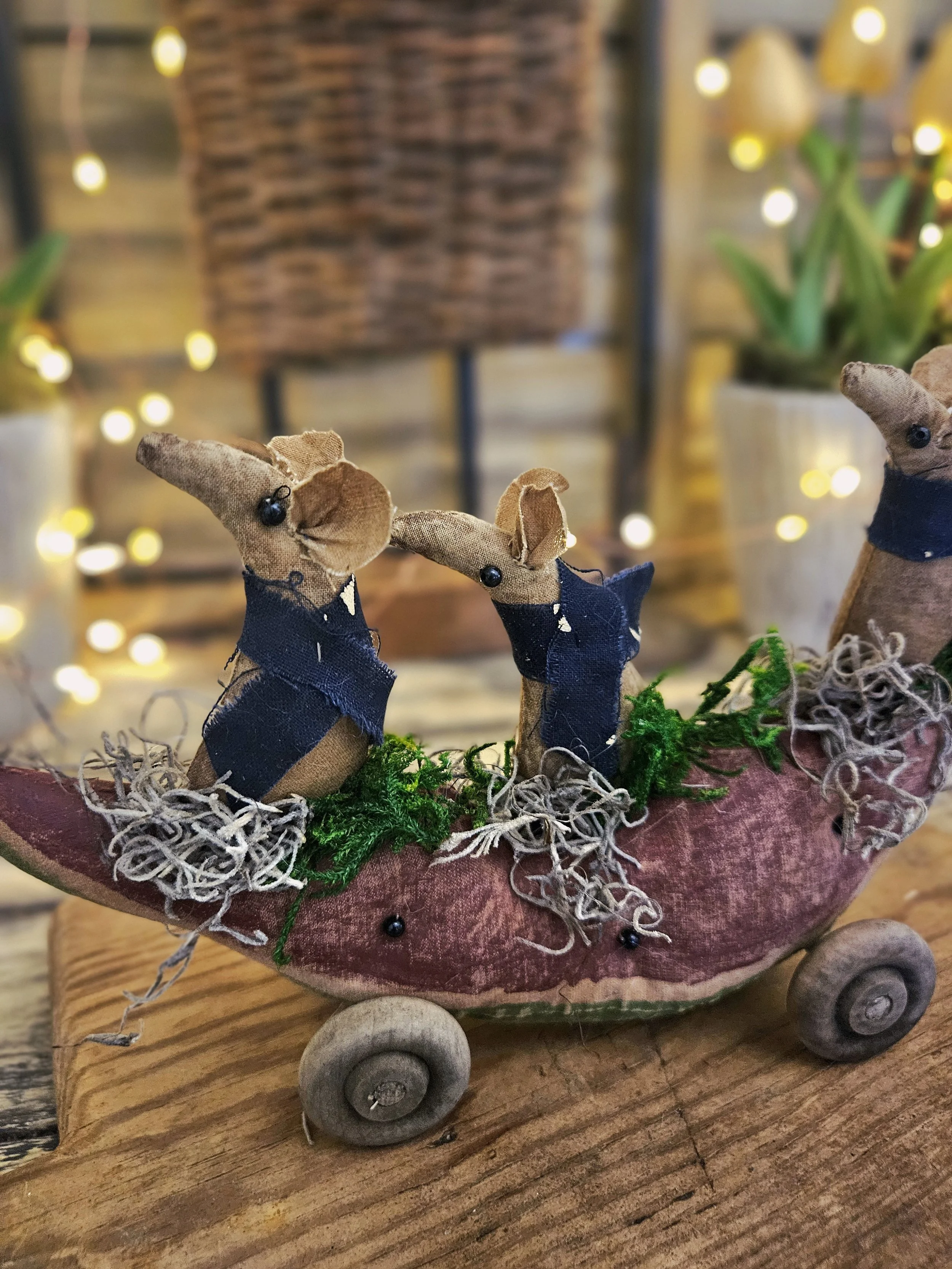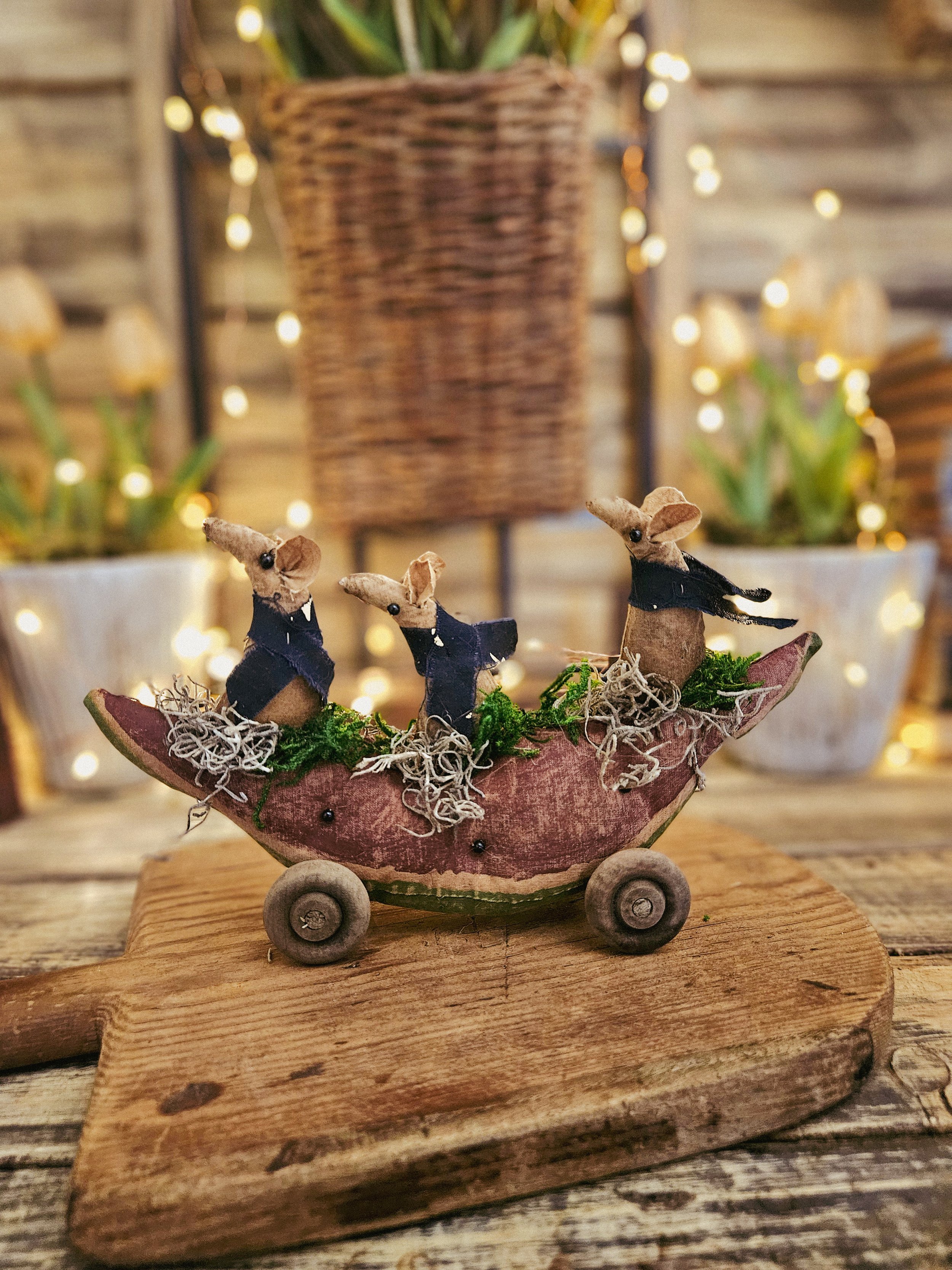 Three little field mice sit on top of a watermelon. The watermelon is made from an aged and painted grain sack material with glass bead seeds. Wooden wheels are attached to create a cute pull toy.