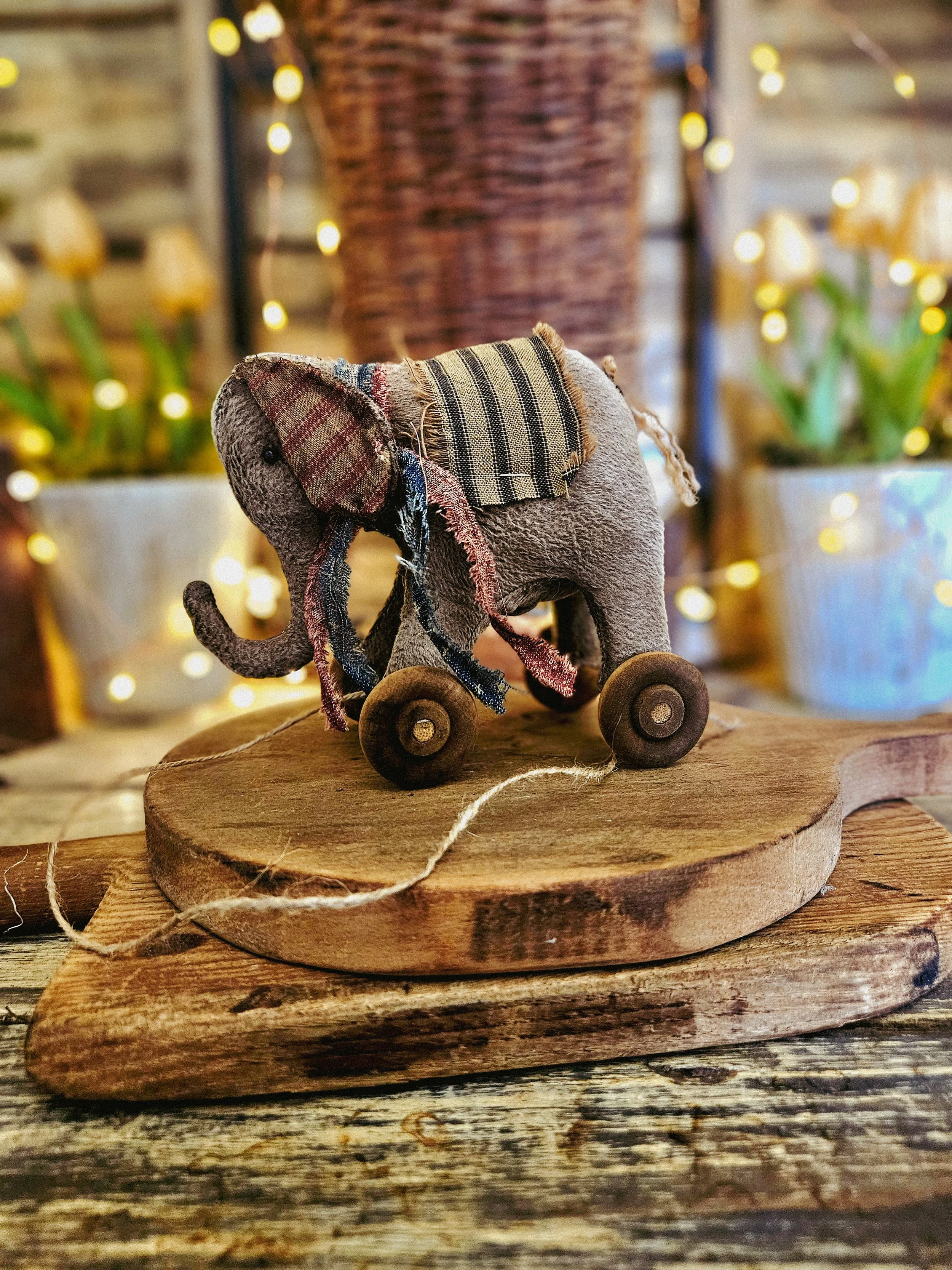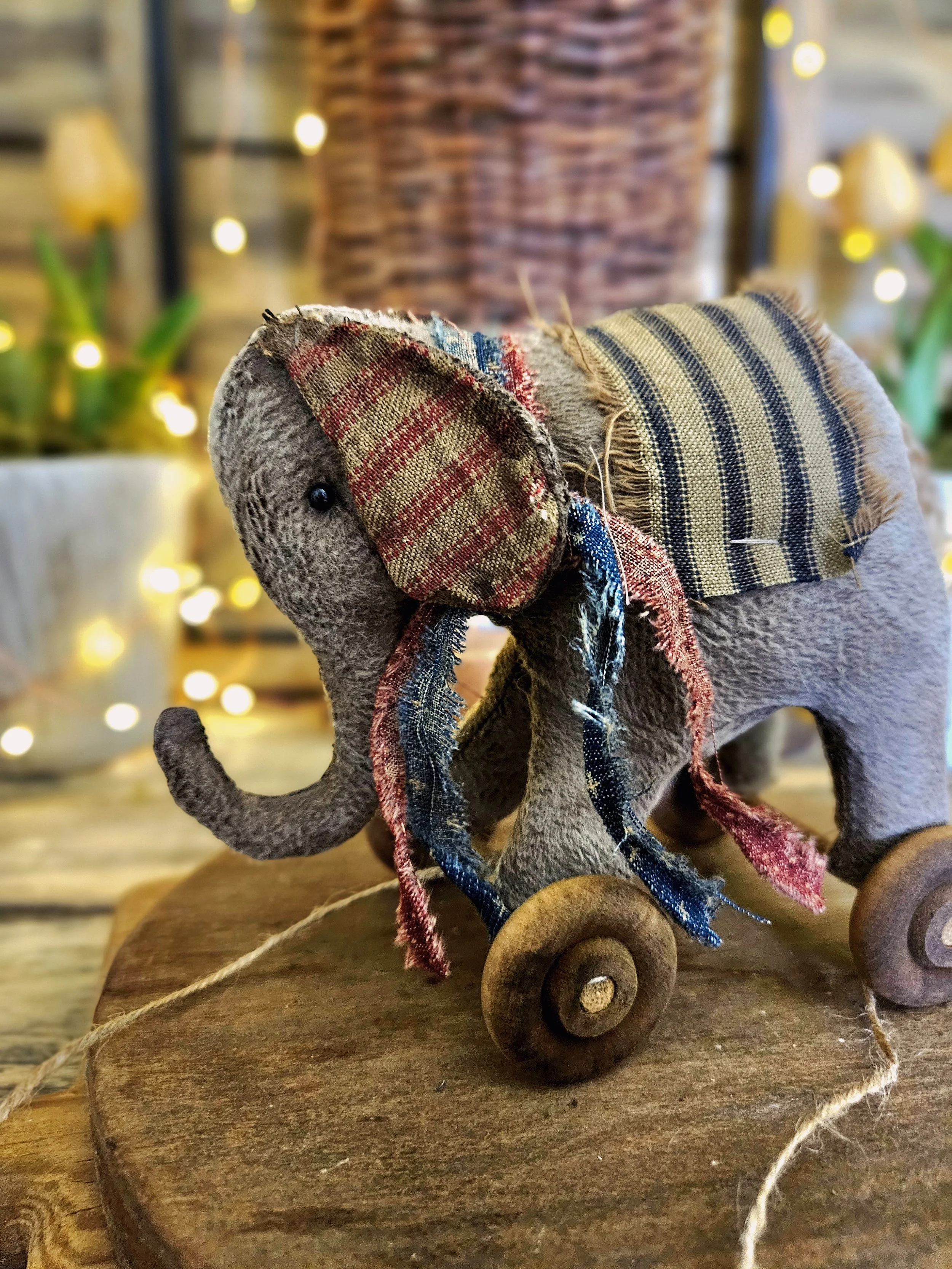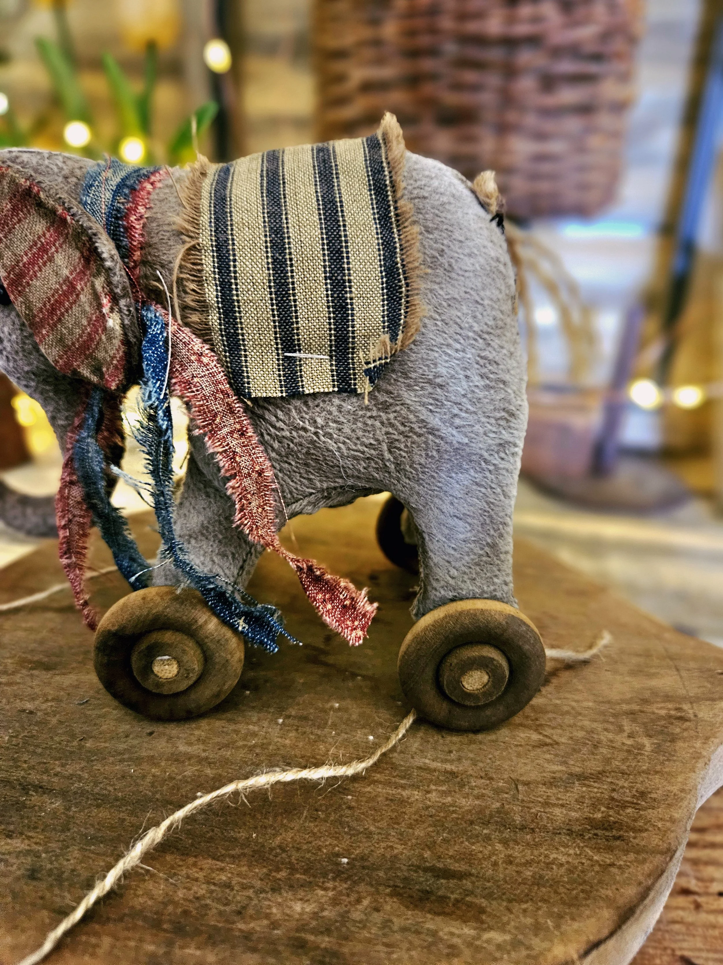This primitive americana elephant pull toy measures about 6” x 5”. Made from an aged material and rag stuffed. He has small glass bead eyes and an americana bow. His wheels do not move.