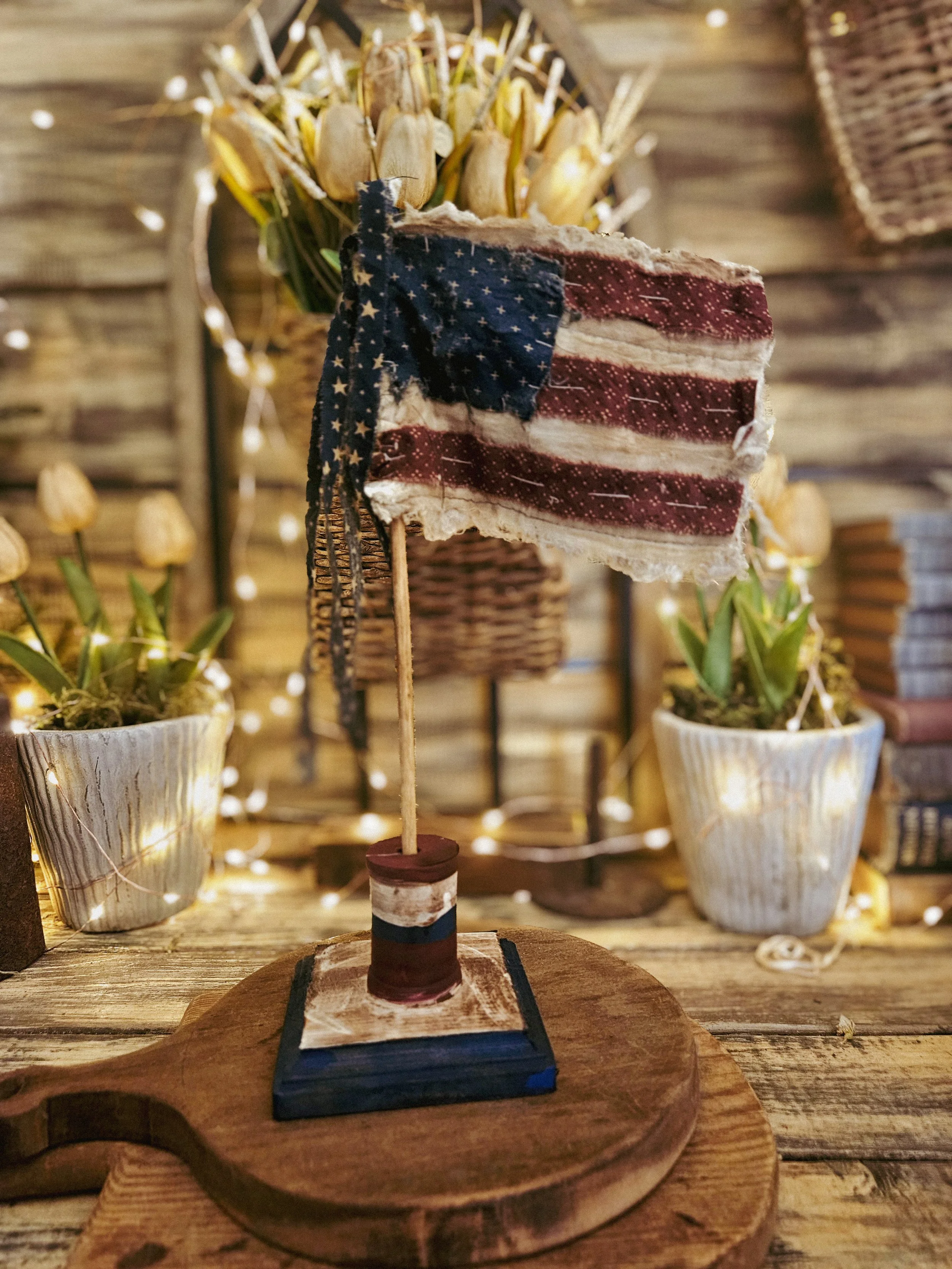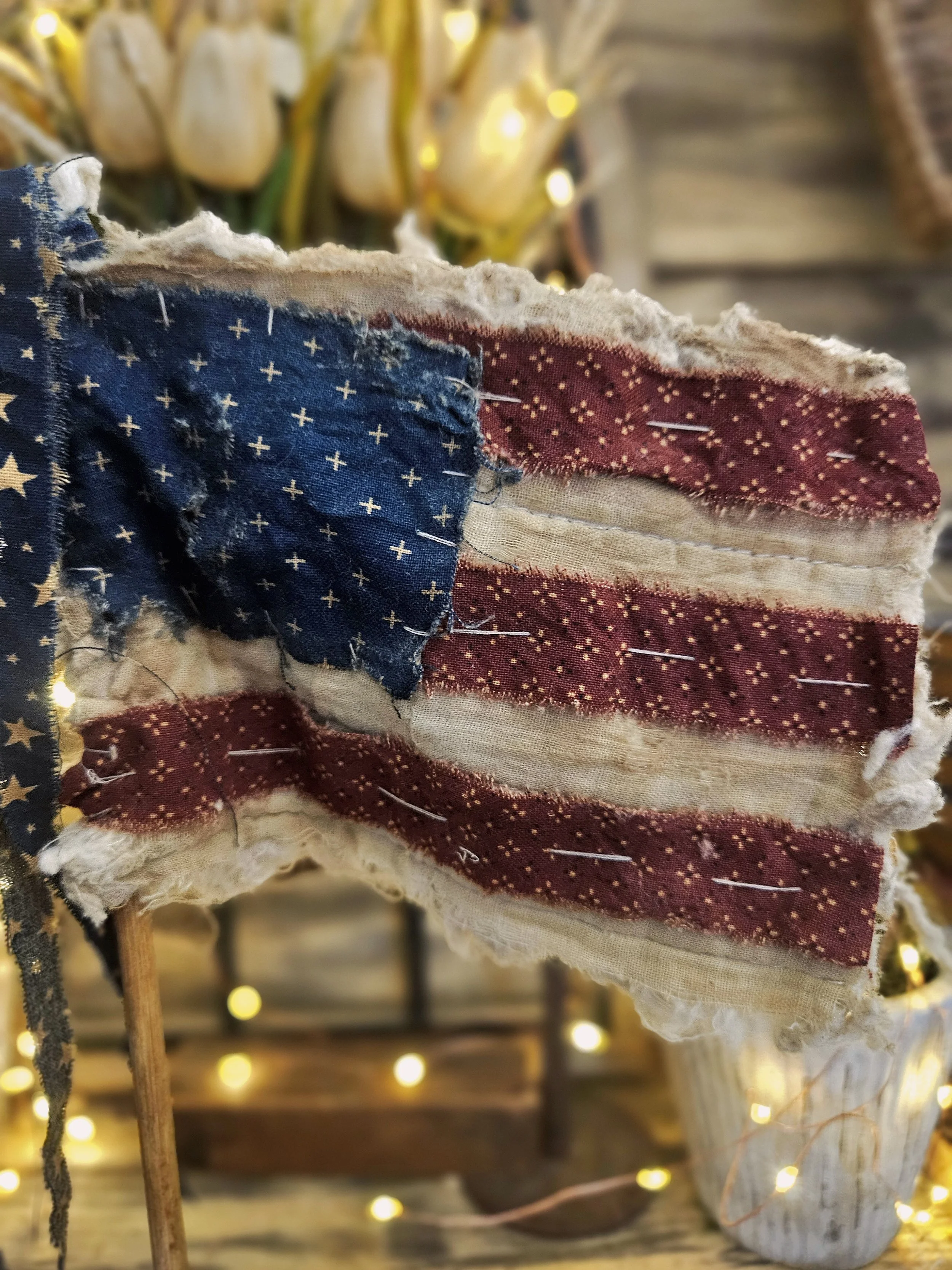 This Flag is completely hand stitched and made from an old vintage quilt. The base is handmade and hand painted